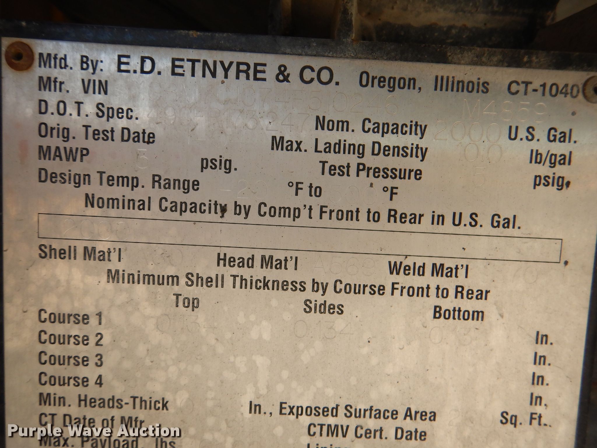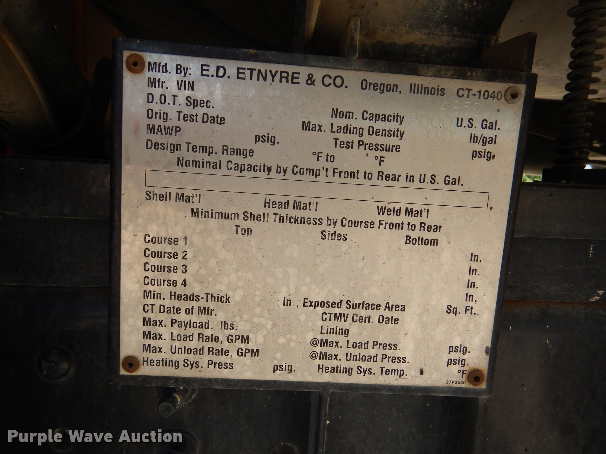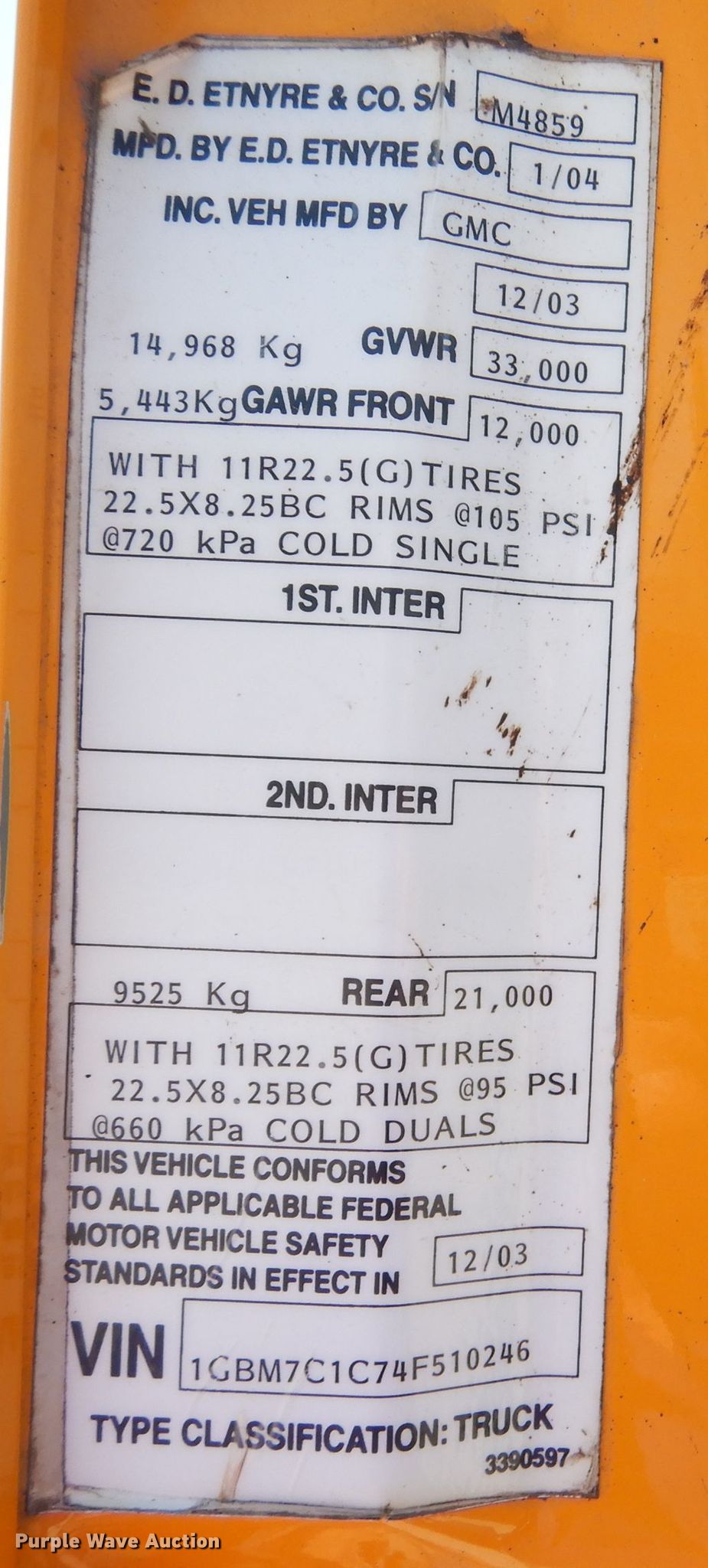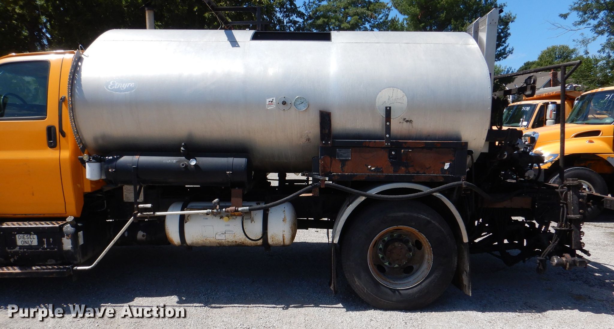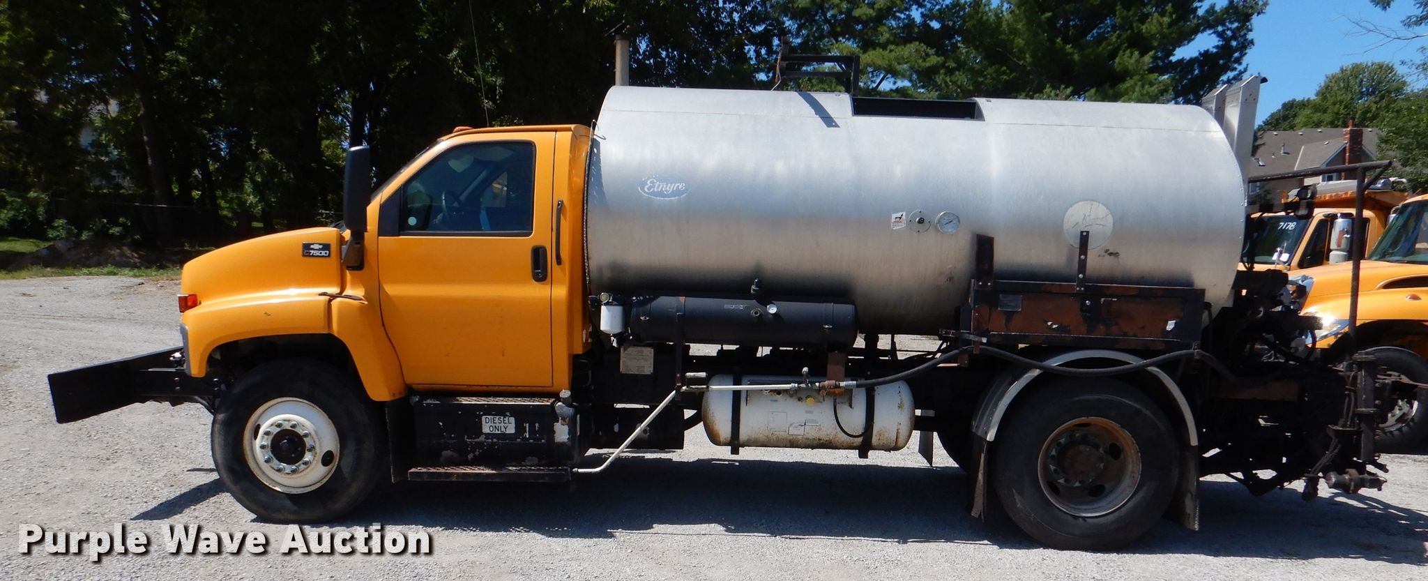 2004 Chevrolet C7500 oil distributor truck. 82,773 miles on odometer, MODOT ID: G8957. Engine Caterpillar 3126, Displacement: 7.2L, Cylinders: 6, Fuel type: Diesel. Transmission Automatic. Chassis Axles: Single, Suspension: Spring, Brakes: Air, PTO. Interior AC, Heat. Operational Bed / tank Etnyre, Capacity: 2,000 gallons, 12' L, Water tank Spray bar: Rear, Oil distributor Burner: LPG, Heat rating: 500 degrees, In-cab controls, Spray wand, Spray boom Width: 12', Folding, Nozzles: 36.. Tires Size: 11R22.5. Notes Dash warning indicator: Oil, Possible engine issues, engine knock. Missouri title. 1GBM7C1C74F510246. Missouri Department of Transportation-Northwest District. 3602 N Belt Hwy. Saint Joseph, MO 64506