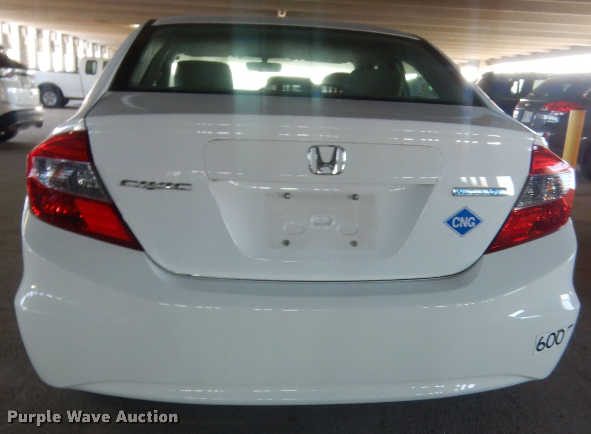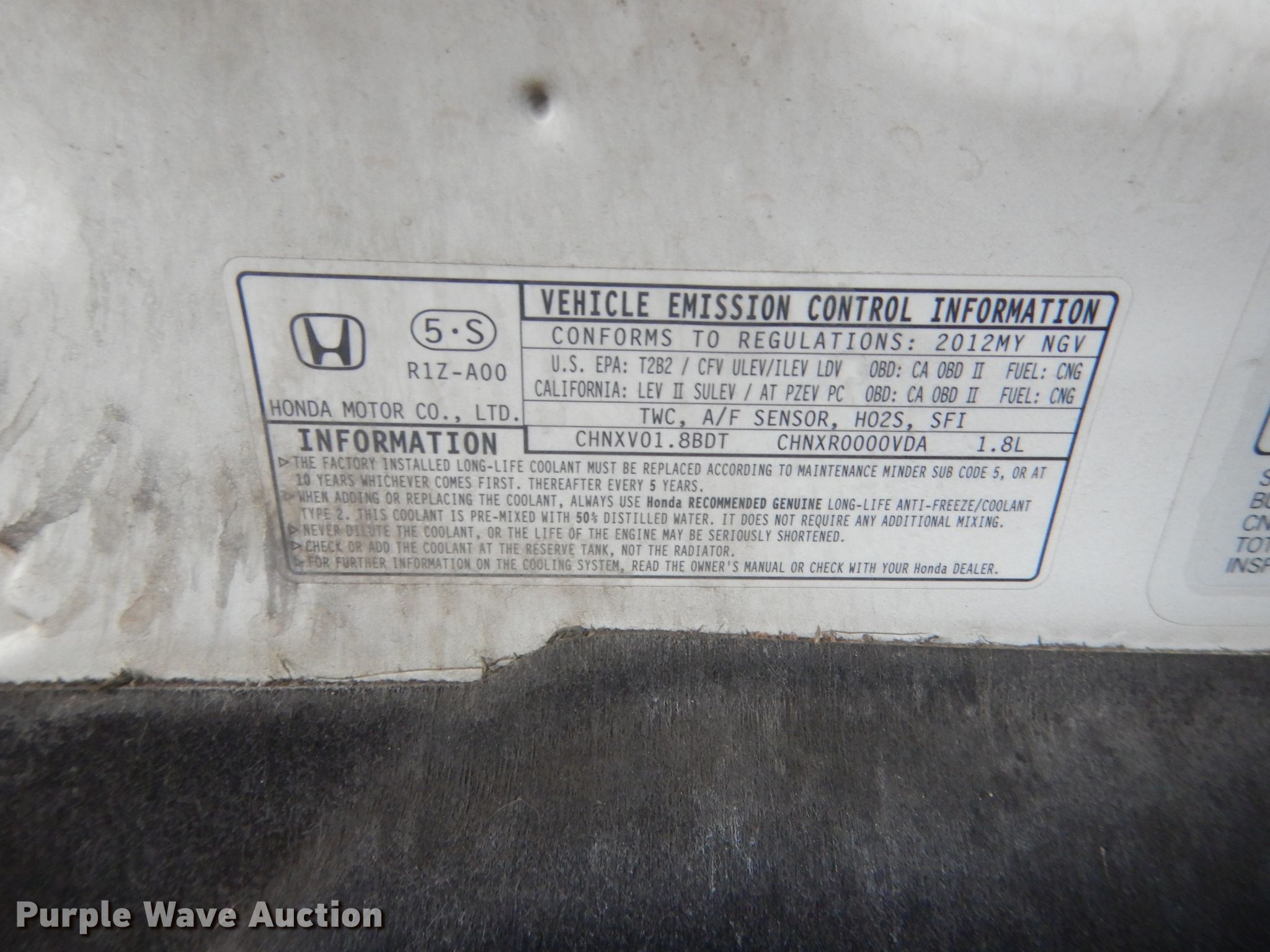 2012 Honda Civic. 52,923 miles on odometer, Unit #: 8005, Sale #: 2209-KP. Engine Displacement: 1.8L L4 SOHC 16V, Cylinders: 4, Fuel type: CNG. Transmission Automatic. Interior AC, Power windows, Power locks, Cruise control. Tires Size: 195/65R15. Notes Decals will be removed prior to auction. Oklahoma title. 19XFB5F5XCE003293. Oklahoma State University. 900 N Portland Ave. Oklahoma City, OK 73107