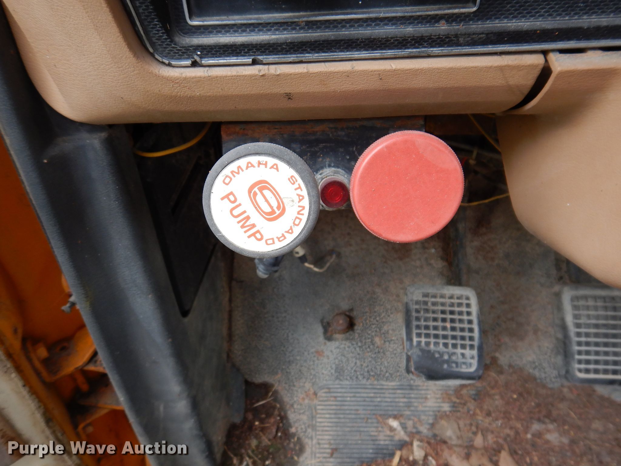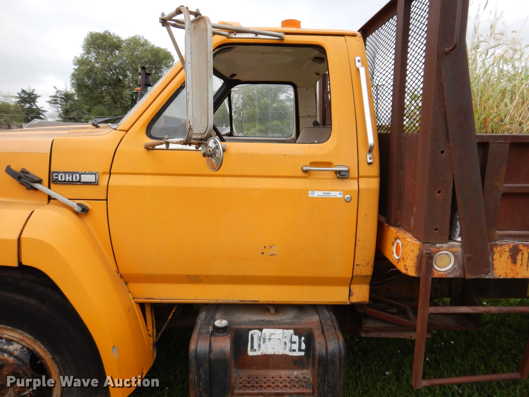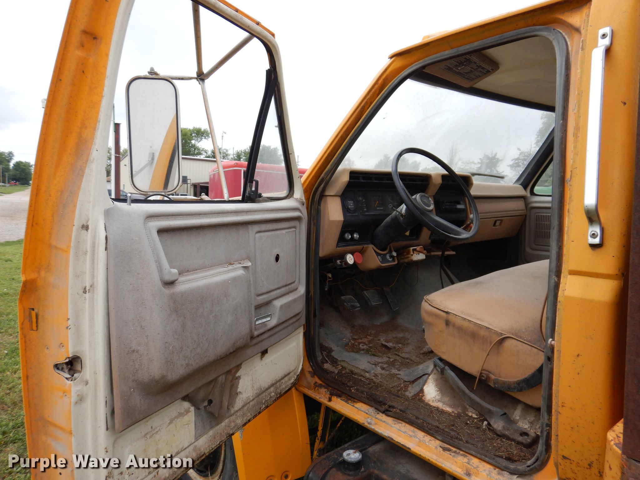 1985 Ford F700 dump flatbed truck. 57,453 miles on odometer, Engine hours: 2,442. Engine Detroit Diesel, Displacement: 8.2L, Cylinders: 8, Fuel type: Diesel. Transmission Manual, Speed: 5, plus 2. Chassis Axles: Single, Suspension: Spring, Brakes: Hydraulic, PTO, GVWR: 23,100 lbs, Wheelbase: 189". Interior AC, Heat, Brake controller. Operational Dump bed 16' L x 96" W, Side height: 17", Bed type: Steel, Ram: Single. Tires Front: 10R20, Rear: 10-20. Notes No battery, Brake issues, seized, Non-operational window crank, Windshield chipped or cracked, Unknown operating condition. Nebraska title. 1FDNK74N3FVA66547. Village of Mead. 220 E 4th St. Mead, NE 68041