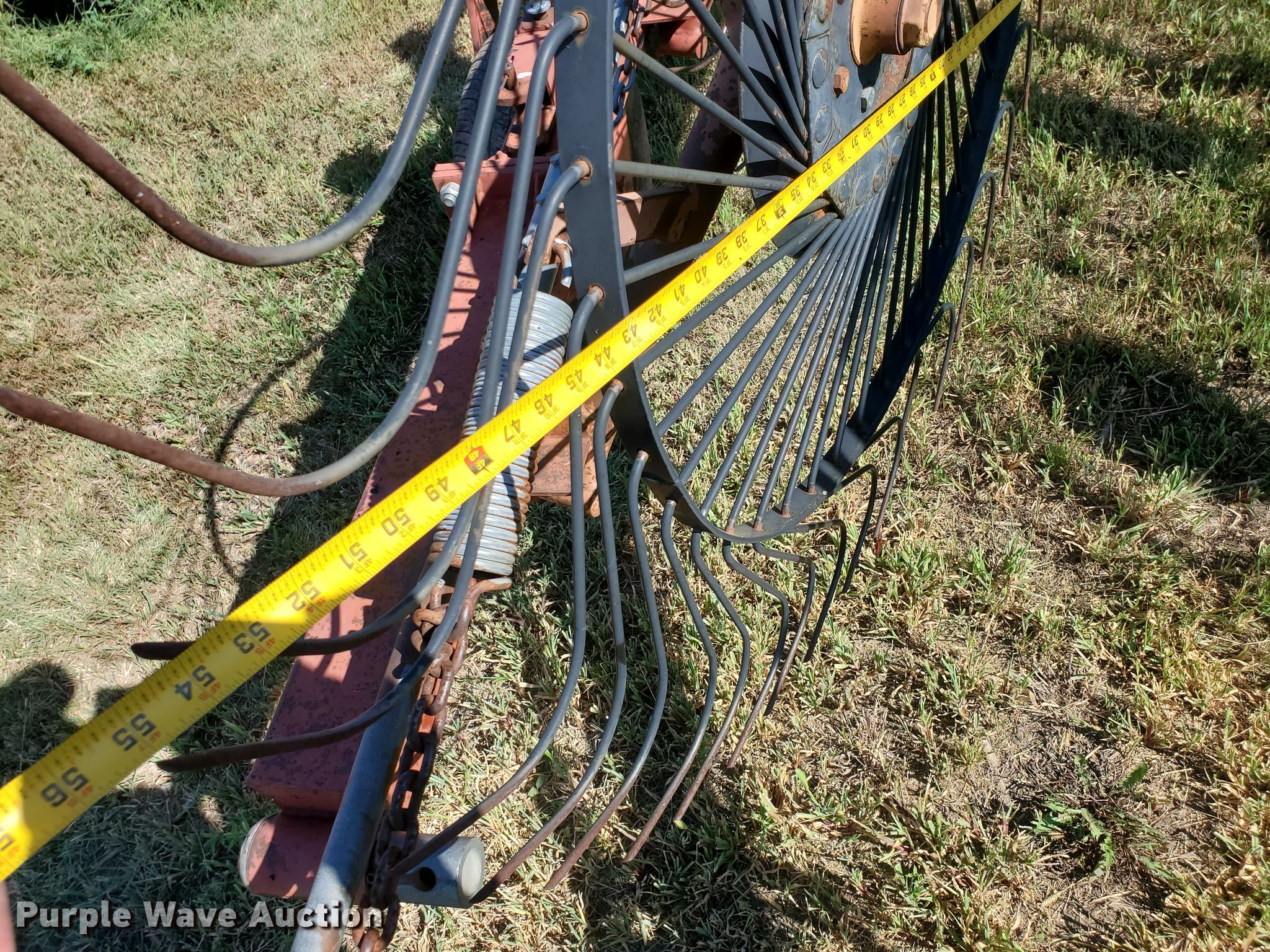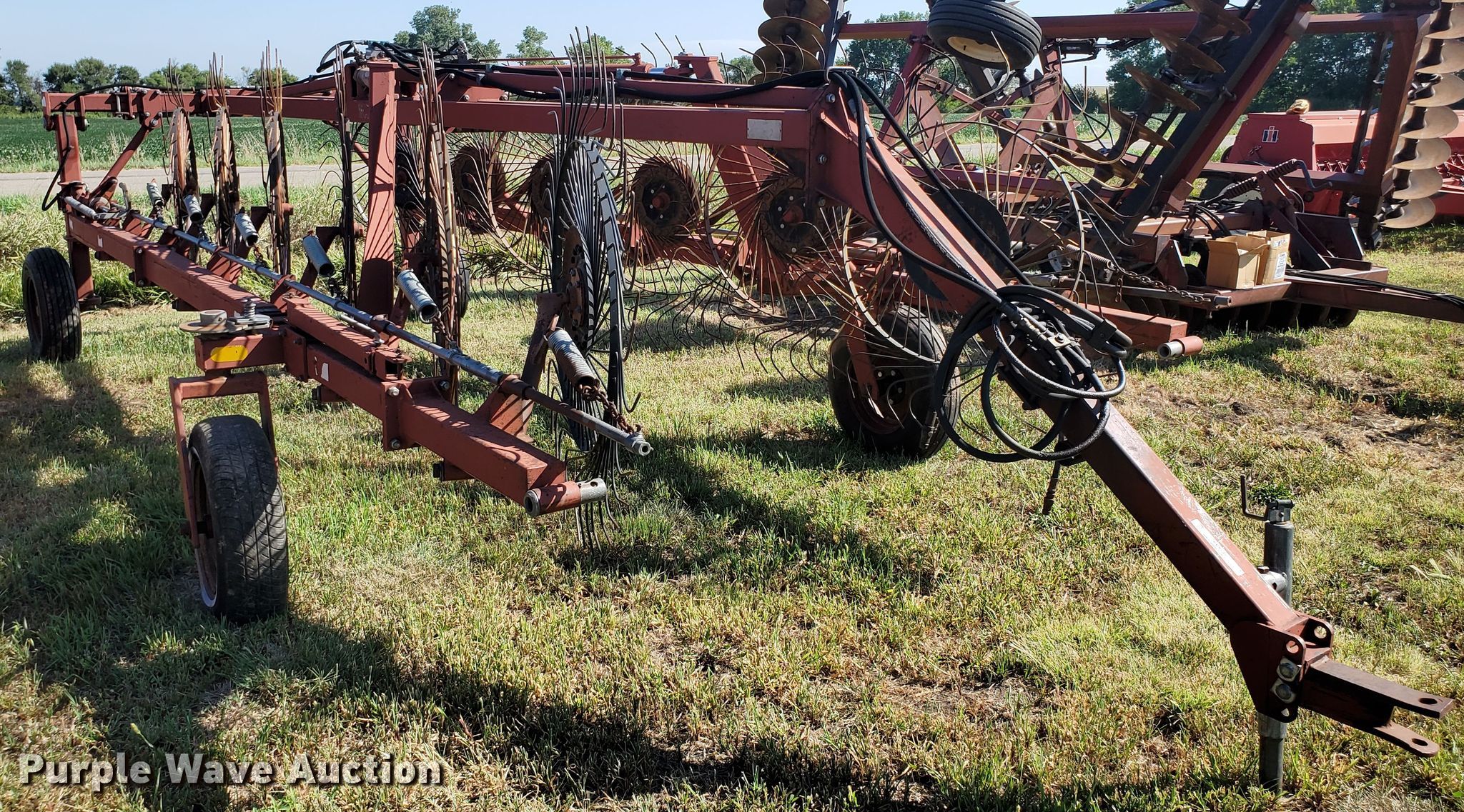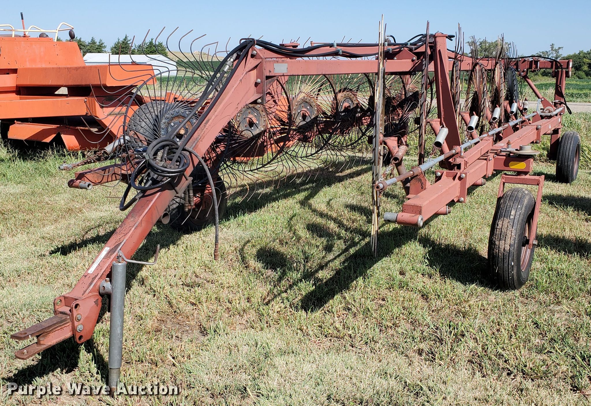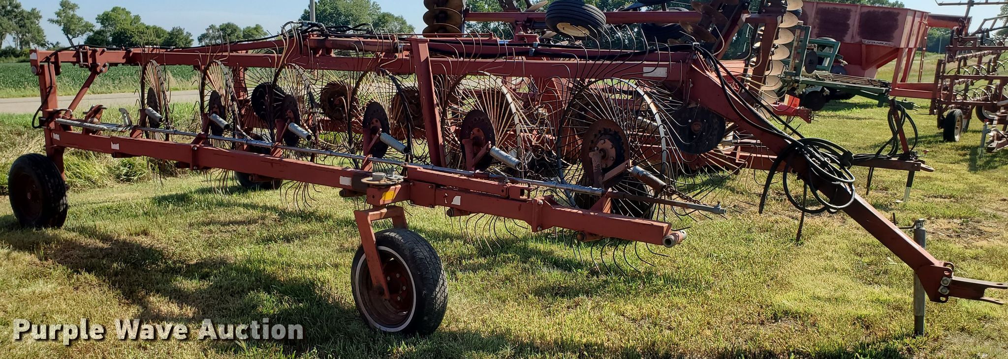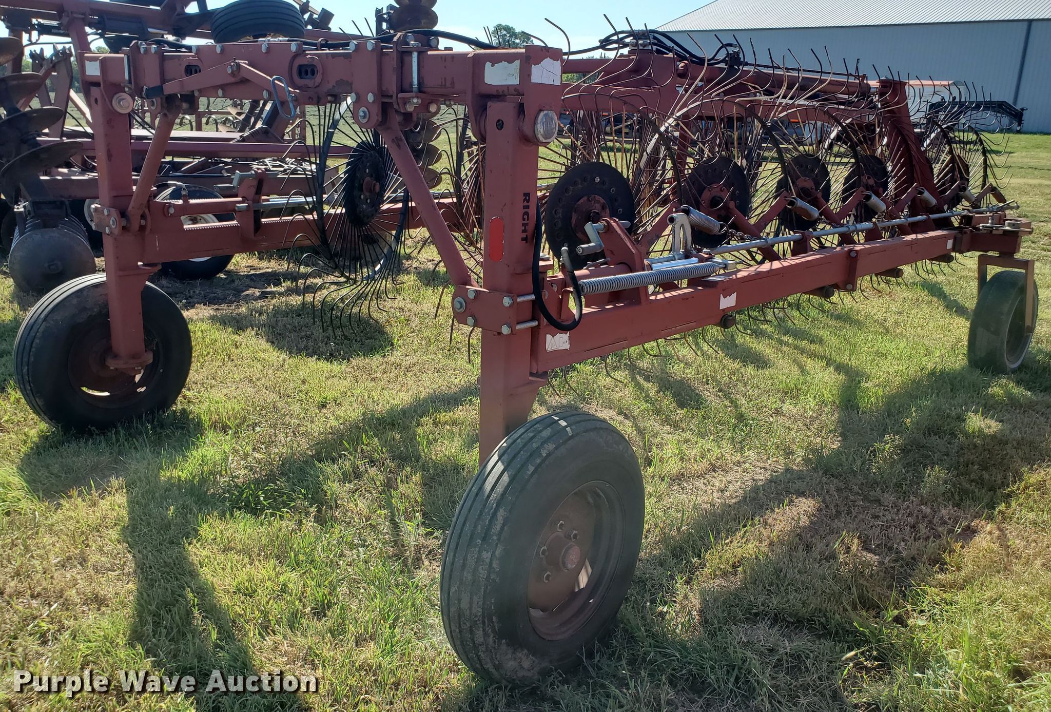 Purple Wave is selling a used Hay Rake in Kansas. This item is a Rhino DF12 hay rake with the following: (12) 55" diameter wheels, Hydraulic lift, Hydraulic fold, 7.60-15 tires