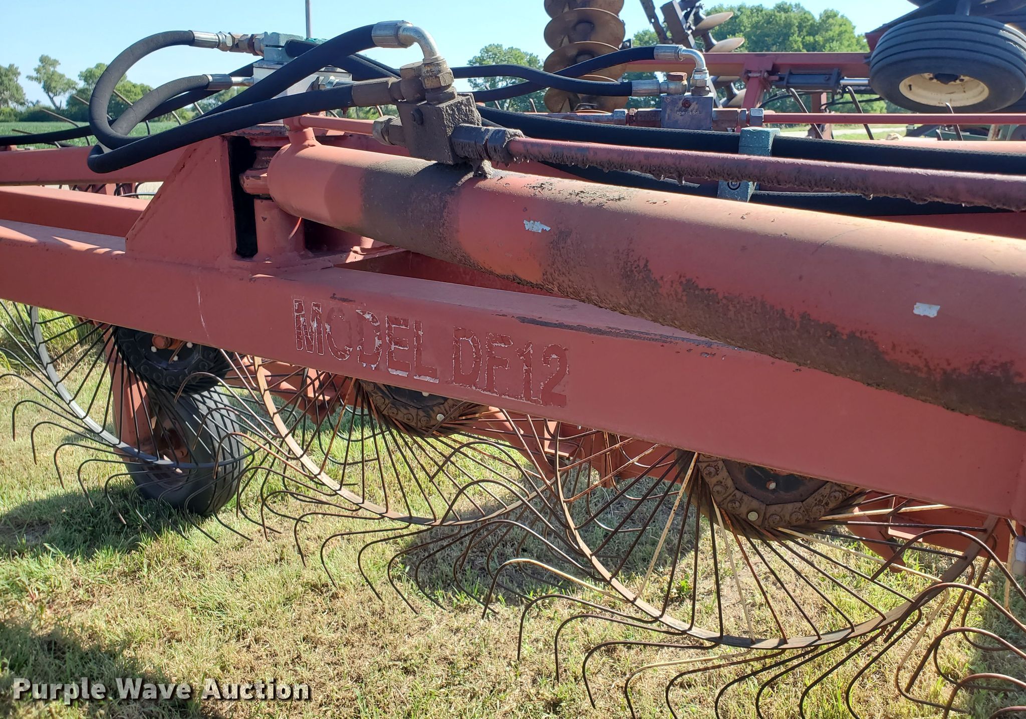 Rhino DF12 hay rake. (12) 55" diameter wheels, Hydraulic lift, Hydraulic fold, 7.60-15 tires. 2634 E Elk Dr. Westfall, KS 67455