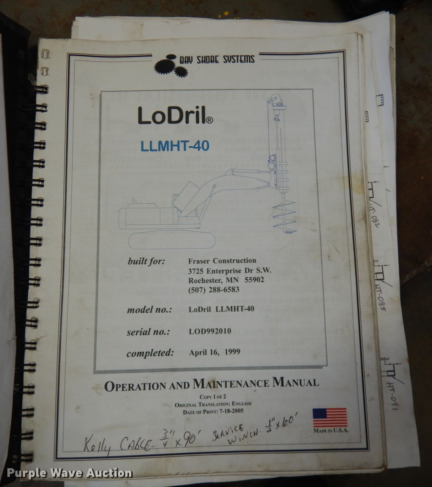2007 Caterpillar 330DL excavator with Bay Shore Systems LoDril drilling rig. 13,056 hours on meter, Hours may vary, unit still in use, Serial: MWP001547, Unit #: 1910. Engine Caterpillar C13 Acert, Displacement: 736 C.I.D., Cylinders: 6, Fuel type: Diesel. Transmission Hydrostatic, Two speed travel. Operators station Enclosed cab, AC, Heat. Operational Auxiliary hydraulics, Boom Standard, Stick Stick length: 12' 10", Drilling rig Bay Shore Systems LoDril LLMHT-40, Serial LOD992010, 40' Kelly bar, (2) 60' Kelly bars One unused, Pullmaster H28-3-101-1 winch Serial: 55297, Pullmaster M8-3-30-1 winch Serial: 55036.. Tracks Width: 32", Grouser pads: Triple. Notes Additional parts included. Fraser Construction - Open inspection Sept. 27, 28. 3725 Enterprise Dr SW. Rochester, MN 55902