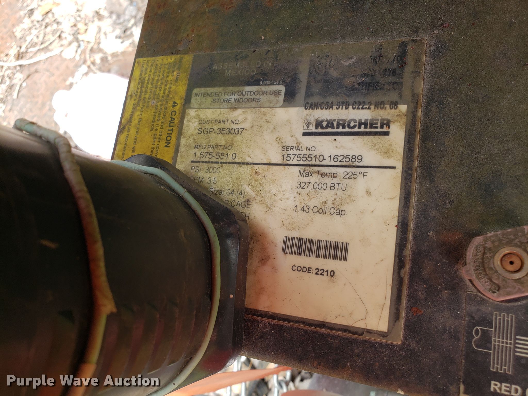 Karcher steam cleaner. 522 hours on meter, Honda GX340 gas engine, 3,000 psi, 350 gallon poly tank, Water pump Predator gas engine, Trailer not included. Kansas City, MO 64120