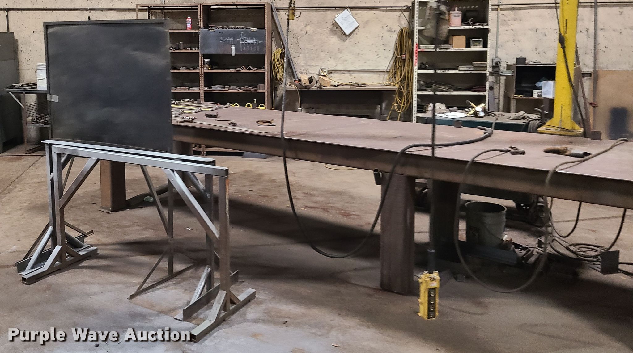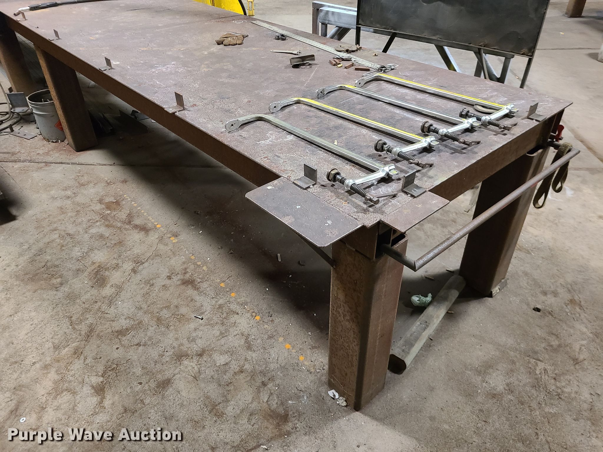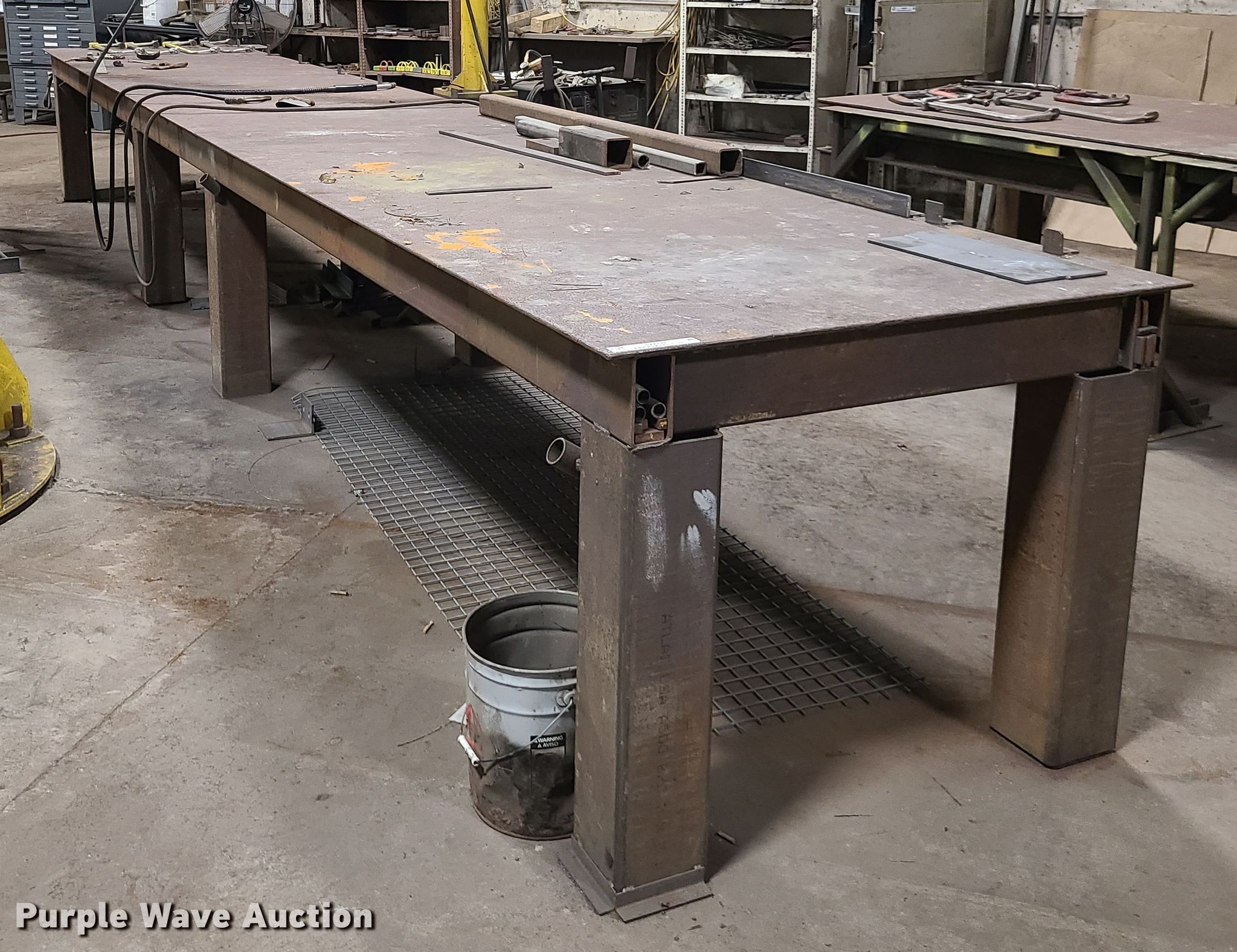 Purple Wave is selling a used Welder (Manual) in Missouri. This item is a Welding station with the following: 25' x 4' x 37"H steel table, Clamps, Miller Deltaweld 451 welder, Three phase, Miller 22a wire feeder, (2) saw horses