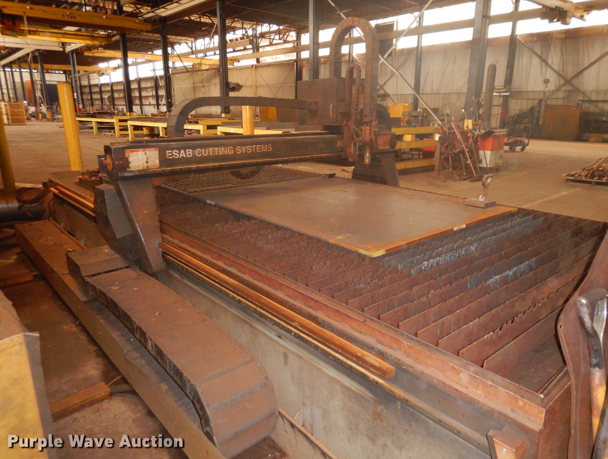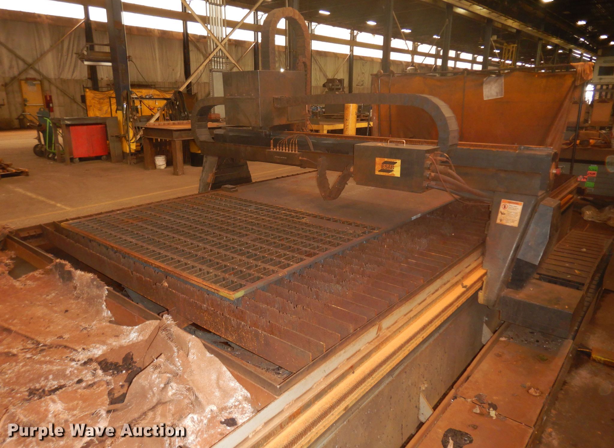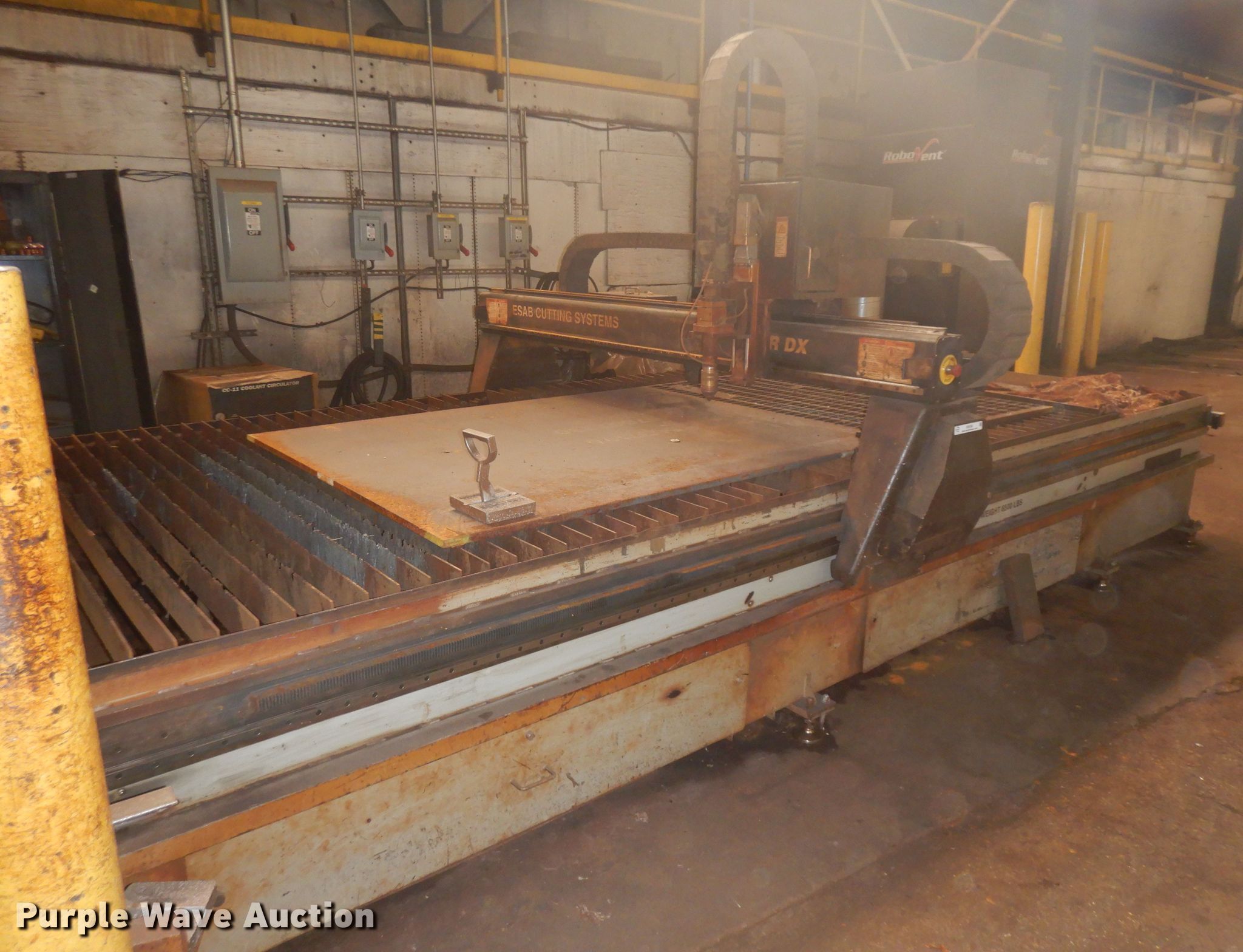 Purple Wave is selling a used Machine Shop Tools and Equip. in Missouri. This item is a 2010 Esab Acer DX-6 plasma table with the following: 440V, Single phase, 10 amps full load, Down draft table, Great Lakes Air RoboVent PA-2M-6000 welding cell dust collector, 480V, Three phase, 14 amps, 144"L x 72"W bed, 1.5" thick steel maximum capacity, Esab power uunit, Control board, Stand, Serial 0560947465