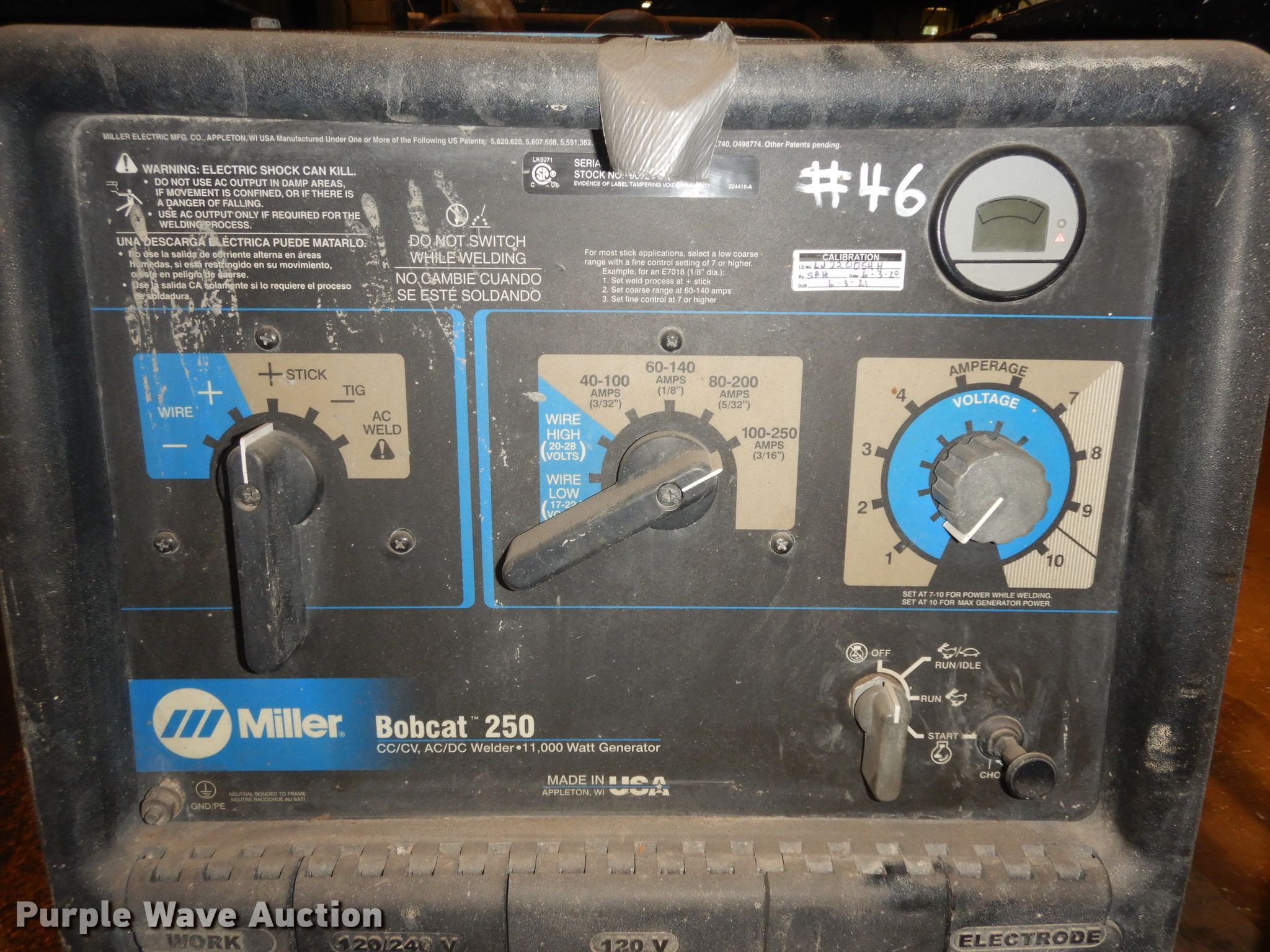 Purple Wave is selling a used Welder (Manual) in Missouri. This item is a Miller Bobcat 250 welder/generator with the following: Generator, kW: 11, Phase: Single, 240V outlets, 120V outlets