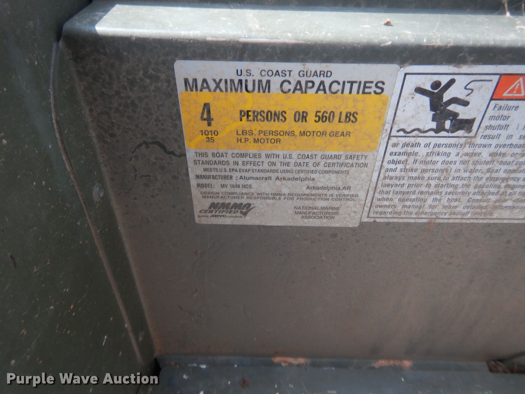 2015 Alumacraft boat. Length: 16', Hull ID: ACBF3636A515. Engine No engine. Operators station Capacity Person: 4, 560 lbs. Oklahoma title. Acme Remediation. 301 NW 104th St. Oklahoma City, OK 73114