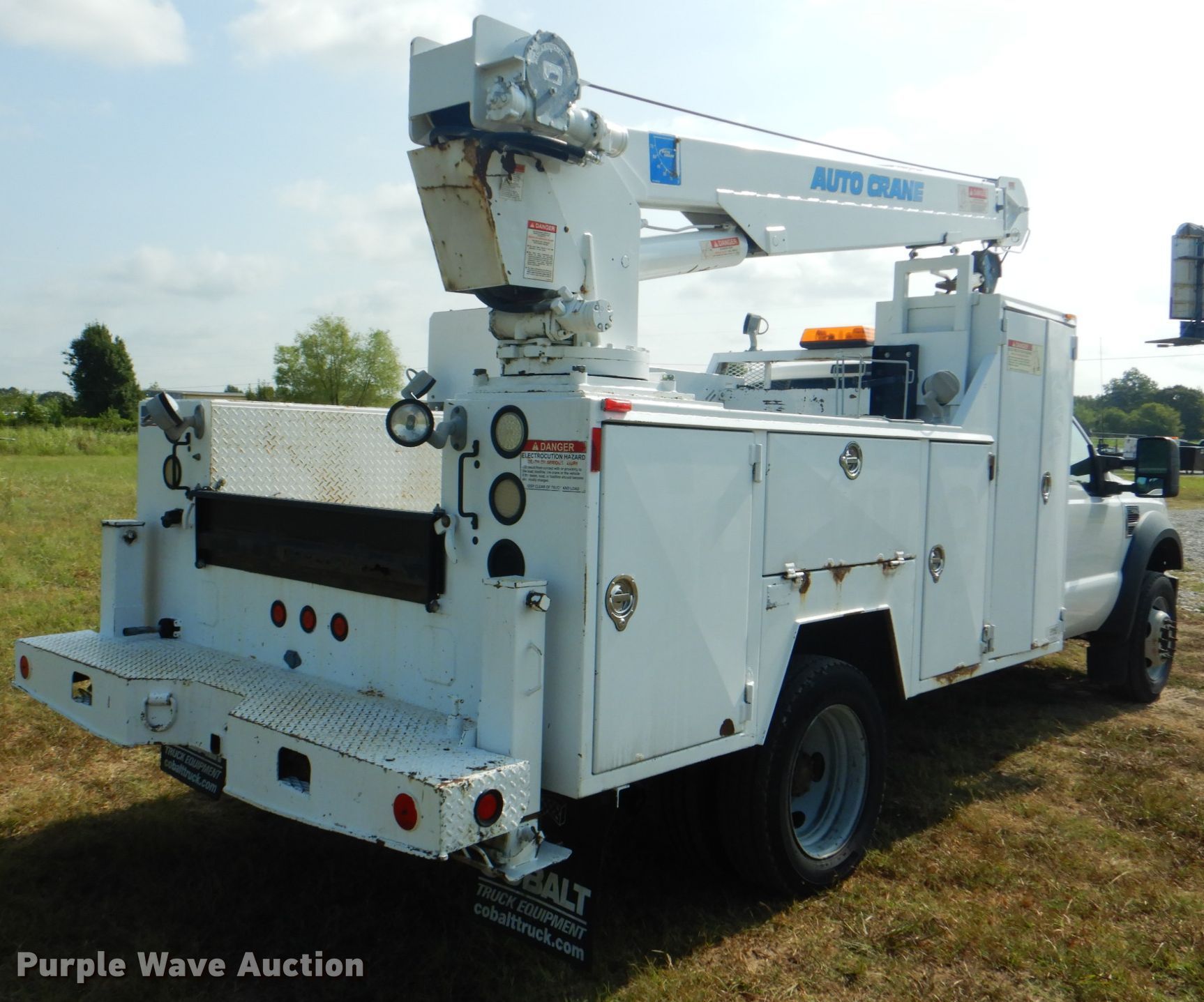 2008 Ford F550 Super Duty XL utility / service truck. 267,436 miles on odometer. Engine Displacement: 6.4L V8 OHV 32V, Cylinders: 8, Fuel type: Diesel. Transmission Automatic. Chassis Axles: Single, Suspension: Spring, Brakes: Hydraulic, PTO, GVWR: 19,500 lbs. Interior AC, Heat, Cruise control, Auxiliary controls. Operational Bed Cobalt Truck Equipment, 11' L x 94" W, Air compressor Ingersoll Rand VHP40, Crane Auto Crane, Boom length: 11', Maximum lift capacity: 6,000 lbs. Tires Size: 225/70R19.5. Oklahoma title. 1FDAF56R08EA44497. 15600 N 145th E Ave. Collinsville, OK 74021