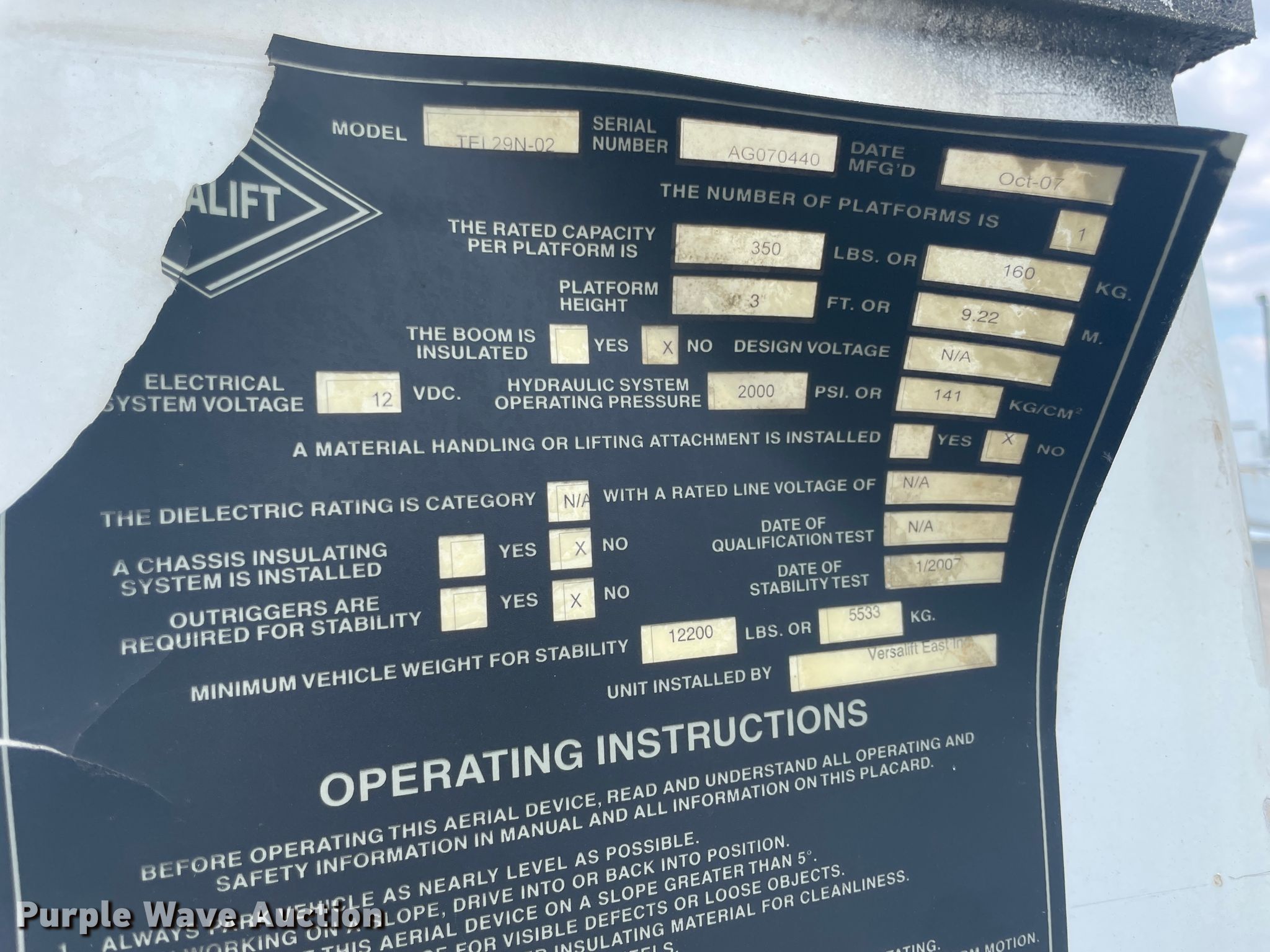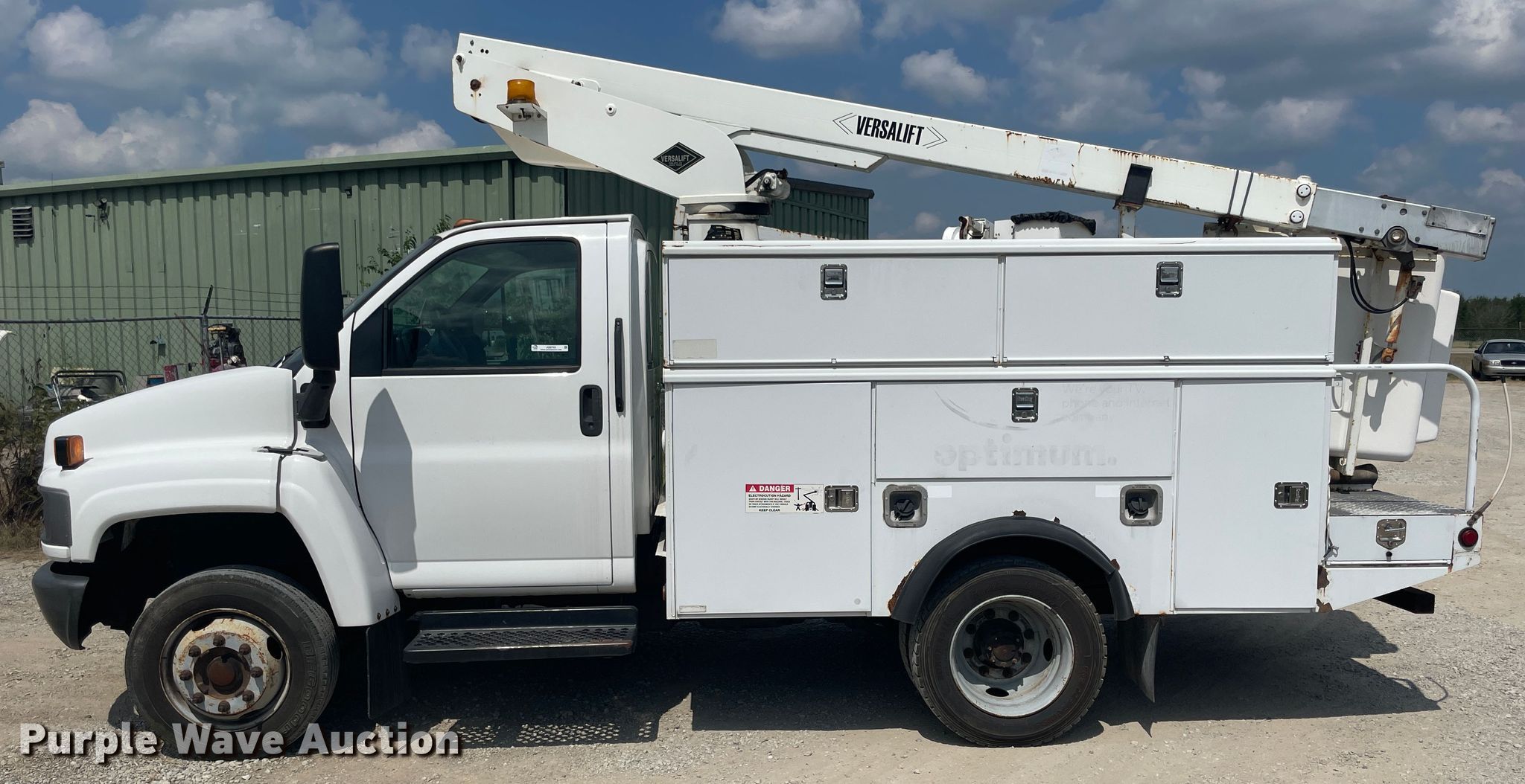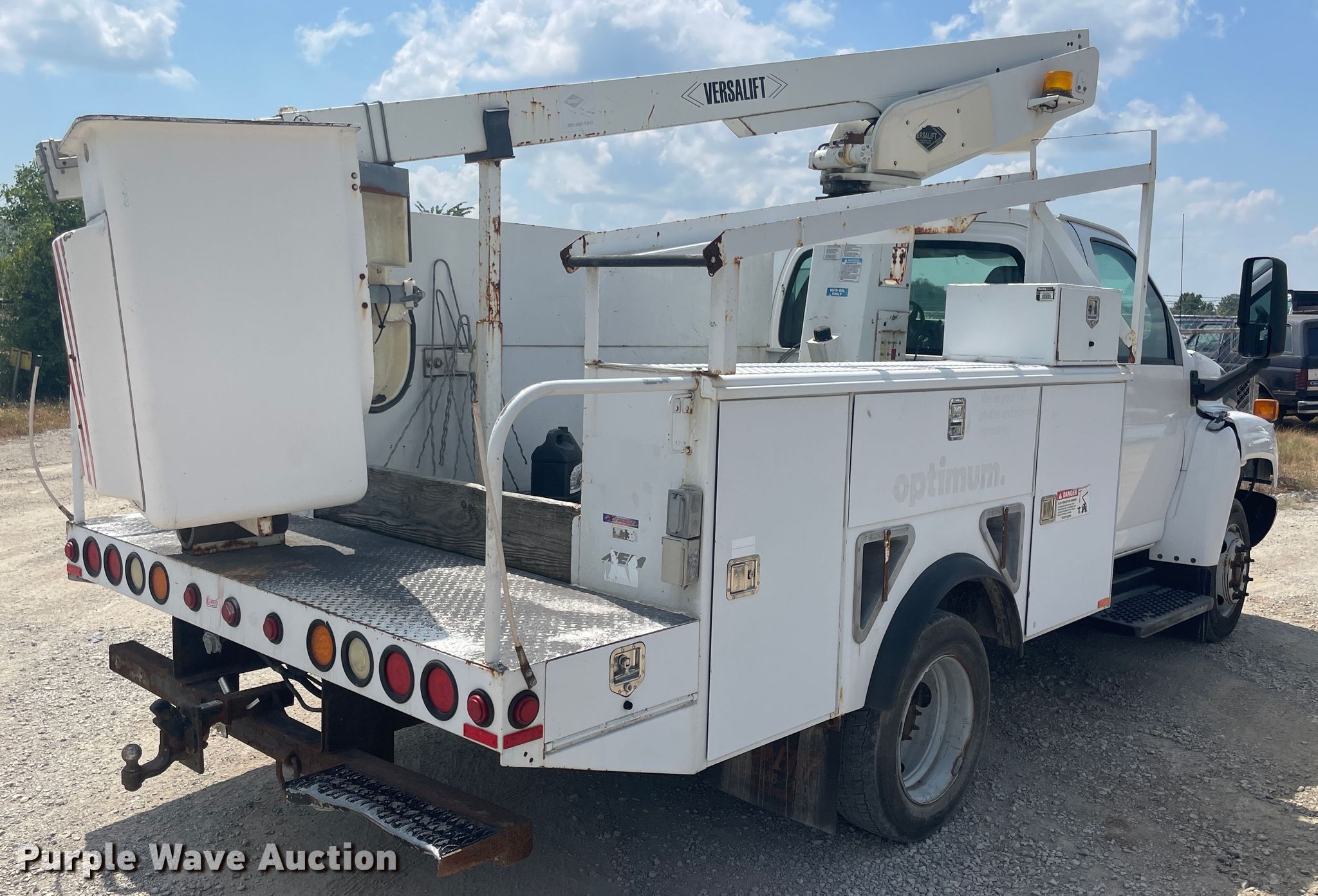 2008 Chevrolet C4500 bucket truck. 87,189 miles on odometer. Engine Displacement: 8.1L V8 OHV 16V, Cylinders: 8, Fuel type: Gas. Transmission Automatic. Chassis Axles: Single, Suspension: Spring, Brakes: Hydraulic, PTO. Interior AC, Heat, Power windows, Power locks, Auxiliary controls. Operational Bed 13' L, Boom 2008 Versalift TFL29N-02, Serial: AG070440, Maximum lift capacity: 350 lbs, Maximum lift height: 30', Boom type: Telescopic, Man basket, Boom controls Platform/ basket.. Tires Size: 225/70R19.5. Notes PTO switch removed from cab. Oklahoma title. Seller is an Oklahoma licensed motor vehicle dealer. Title will be assigned and distributed by the dealer. Please contact the seller for distribution questions. 1GBE4C1G98F401650. 14179 S Hwy 169. Oologah, OK 74053