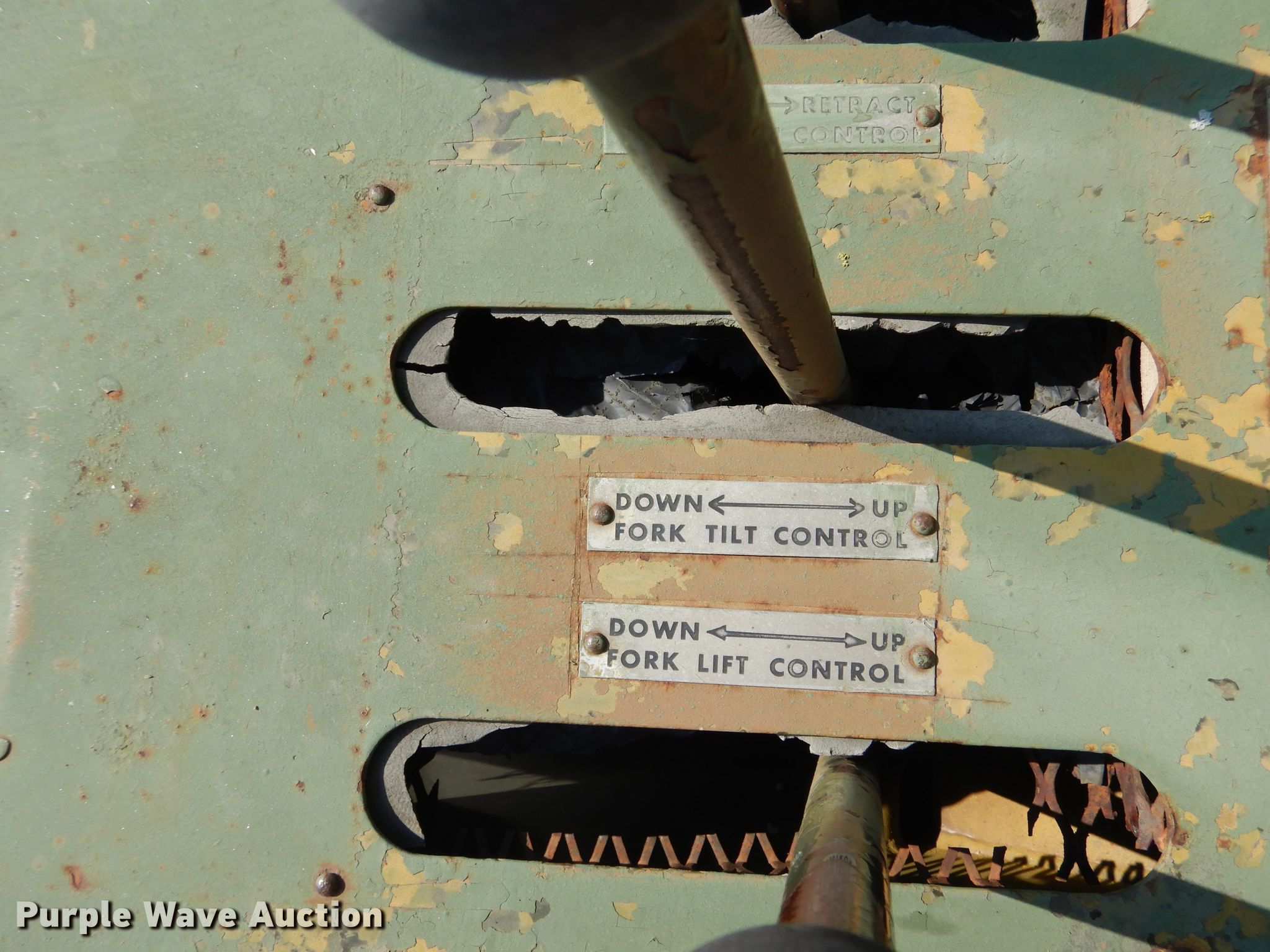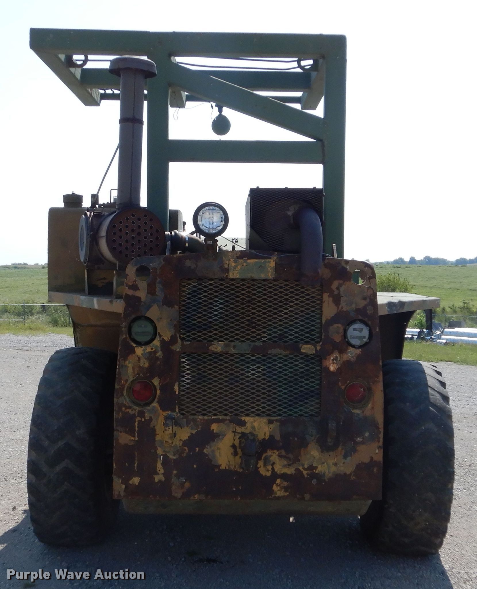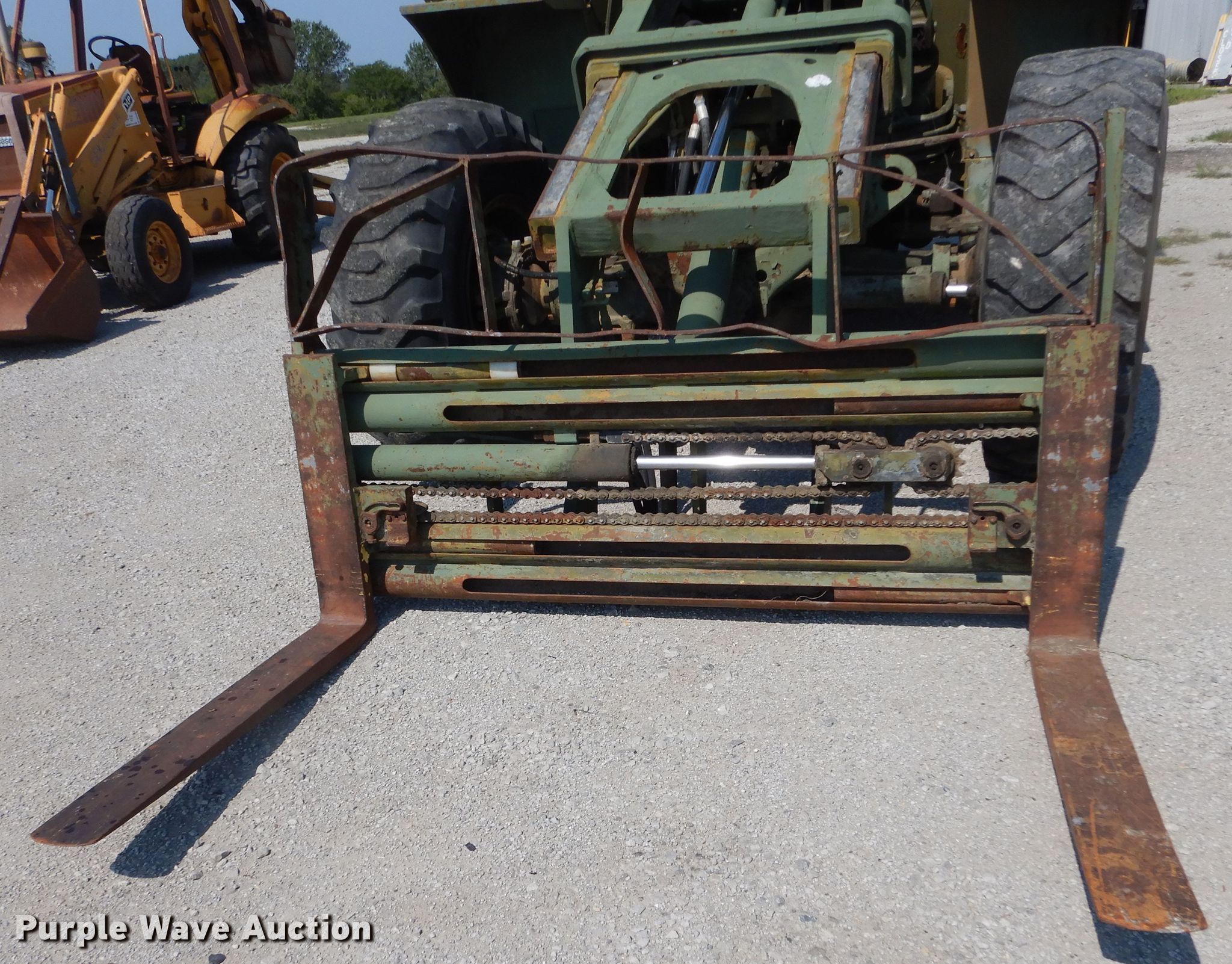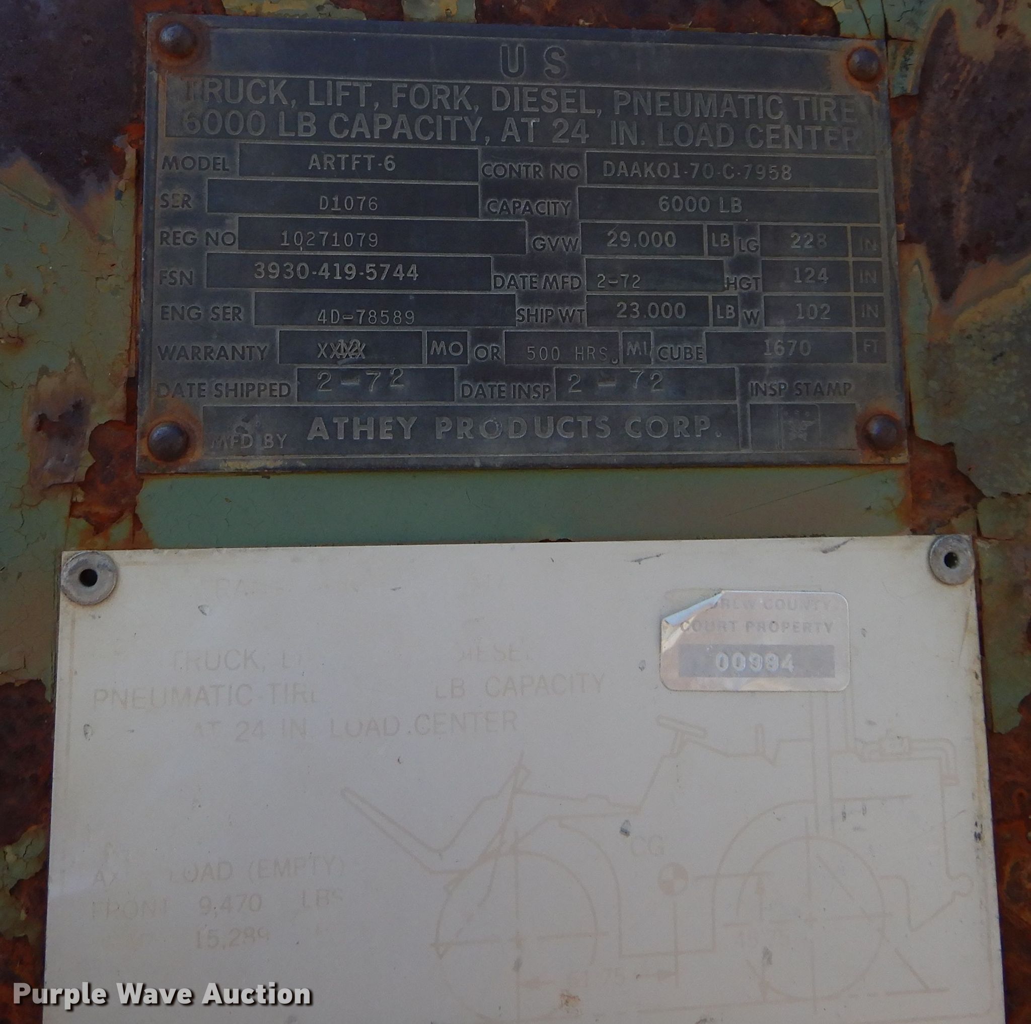 Athey ARTFT-6 telehandler. 3,173 hours on meter, Serial: D1076. Engine Detroit, Cylinders: 4, Fuel type: Diesel. Transmission Powershift, Four wheel drive. Operators station Canopy, Steering: Crab, Four wheel. Operational Maximum lift capacity: 6,000 lbs, Maximum lift height: 124', Side shift, Fork length: 48", Tilt carriage. Tires Front: 17.5 R25, Rear: 17.5R25. Notes Non-operational crab steering. 15950 County Rd 322. Savannah, MO 64485