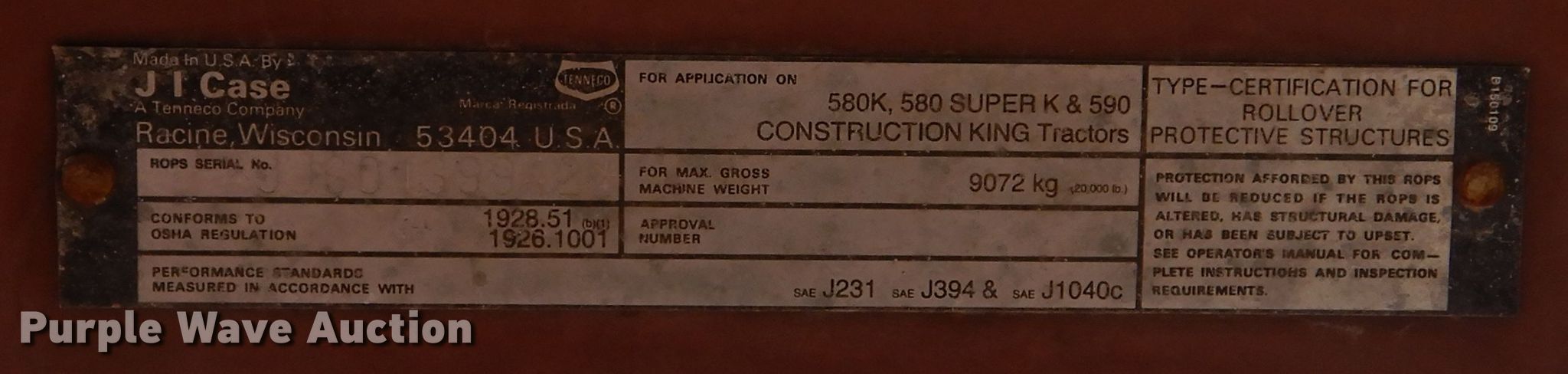 1992 Case 580 Super K backhoe. 3,292 hours on meter, Serial: JJG0165897. Engine JI Case 4-390, Cylinders: 4, Fuel type: Diesel. Transmission Shuttle shift, 4F - 4R. Operators station OROPS, Backhoe controls: Three stick. Operational Loader Quick coupler: Manual, Bucket Width: 82", Forks Length: 45", Backhoe Quick coupler: Manual, Bucket Width: 24", Cutting edge: Bolt-on, Teeth: 5.. Tires Front: 11L-16SL, Rear: 17.5 L-24. 15950 County Rd 322. Savannah, MO 64485