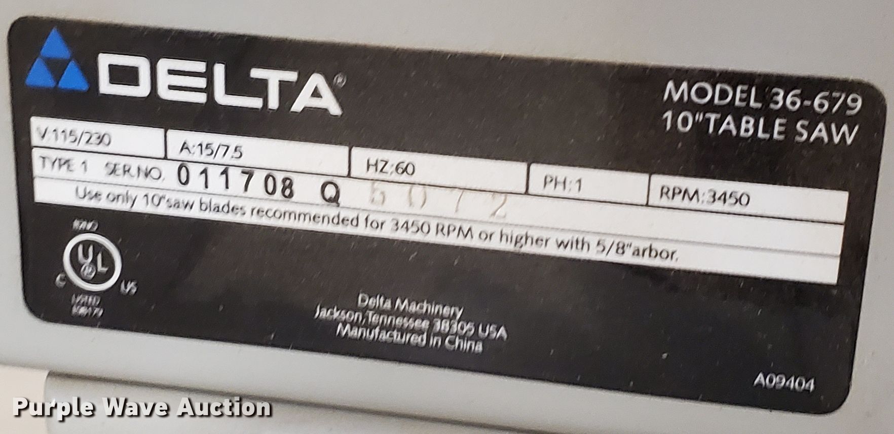 Purple Wave is selling a used Tools in Kansas. This item is a Delta 36-679 table saw with the following: 115/230V, Single phase, Serial: 11708Q5072