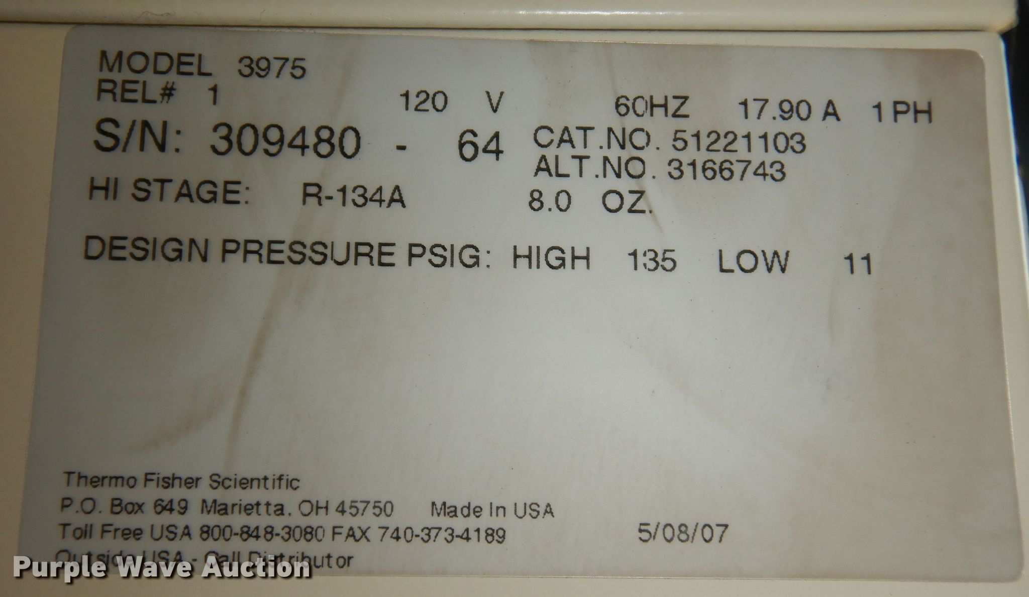 Purple Wave is selling a used Office Supplies and Equip. in Missouri. This item is a Thermo Fisher Scientific 3975 incubator with the following: Serial: 309480, 120V, Low pressure: 11 psi, High pressure: 135 psi