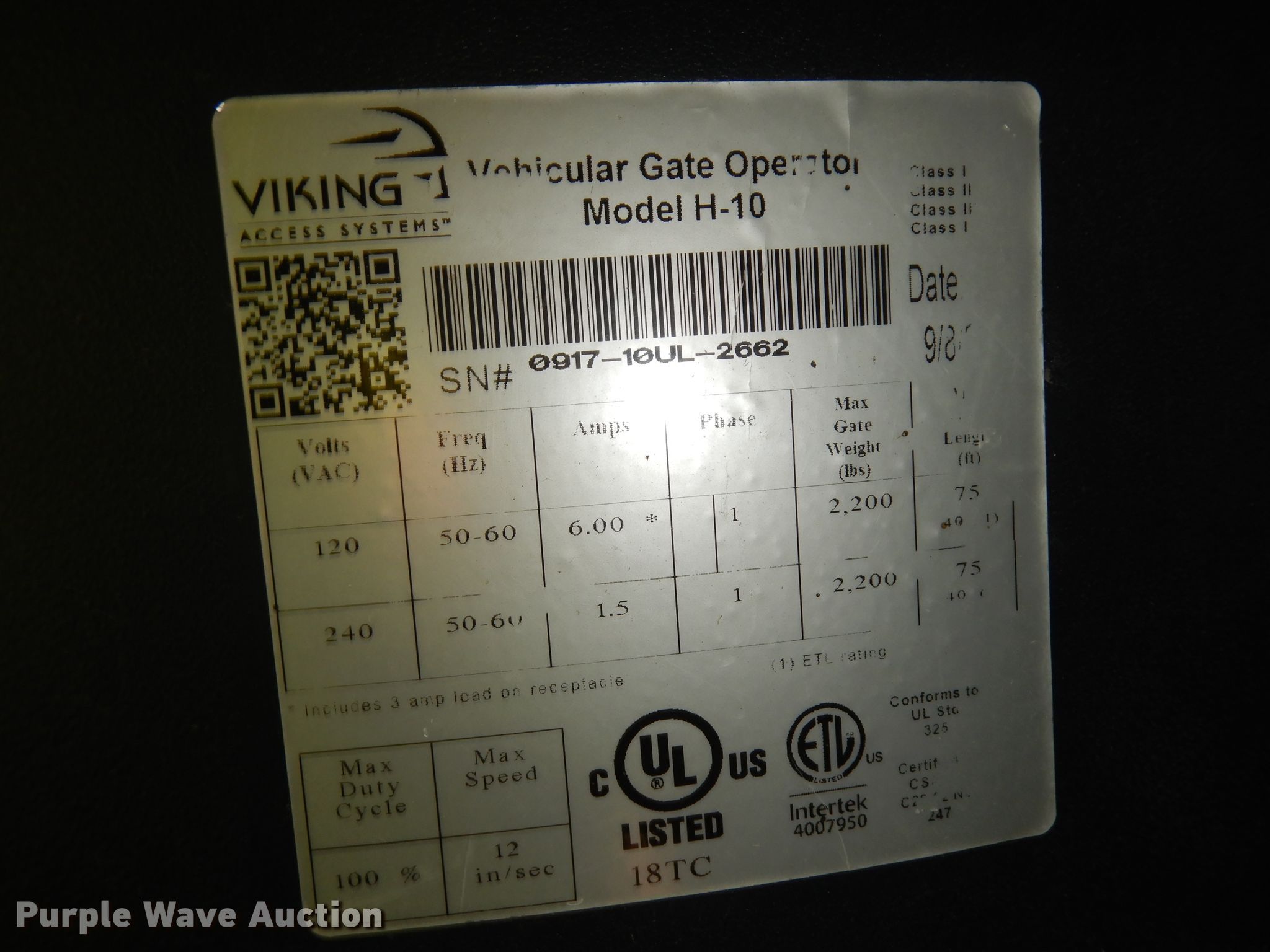 Purple Wave is selling a used Building Materials in Missouri. This item is a Viking H10 gate opener with the following: 120/240V, Single phase, Maximum length: 75', Maximum weight: 2,200 lbs