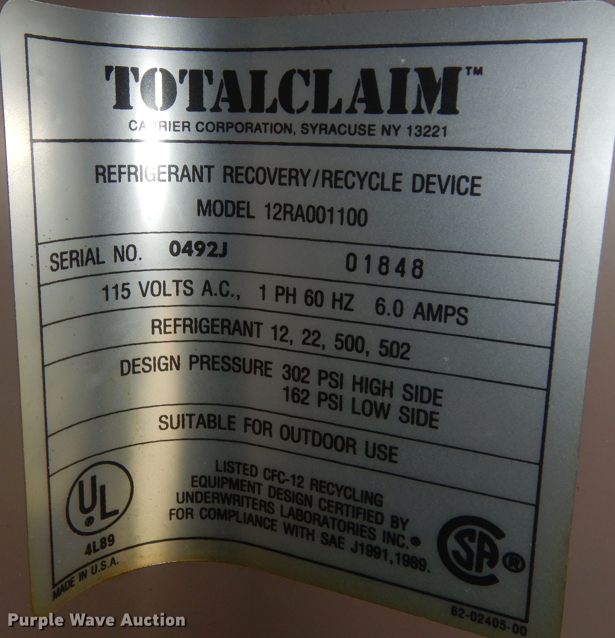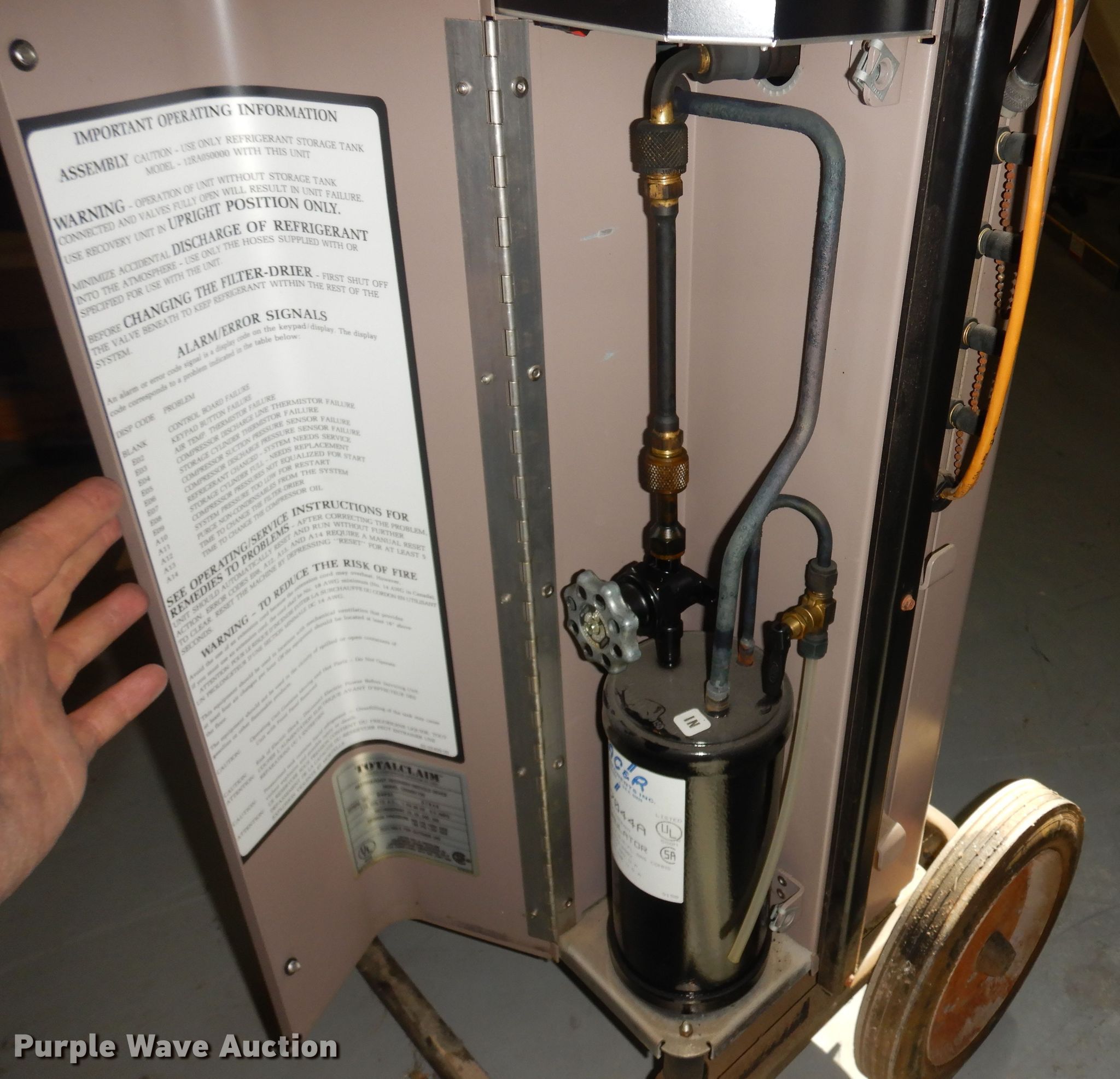 Purple Wave is selling a used Tools in Missouri. This item is a Totalclaim 12RA001100 refrigerant reclaimer with the following: Volts: 115, Low pressure: 162 psi, High pressure: 302 psi