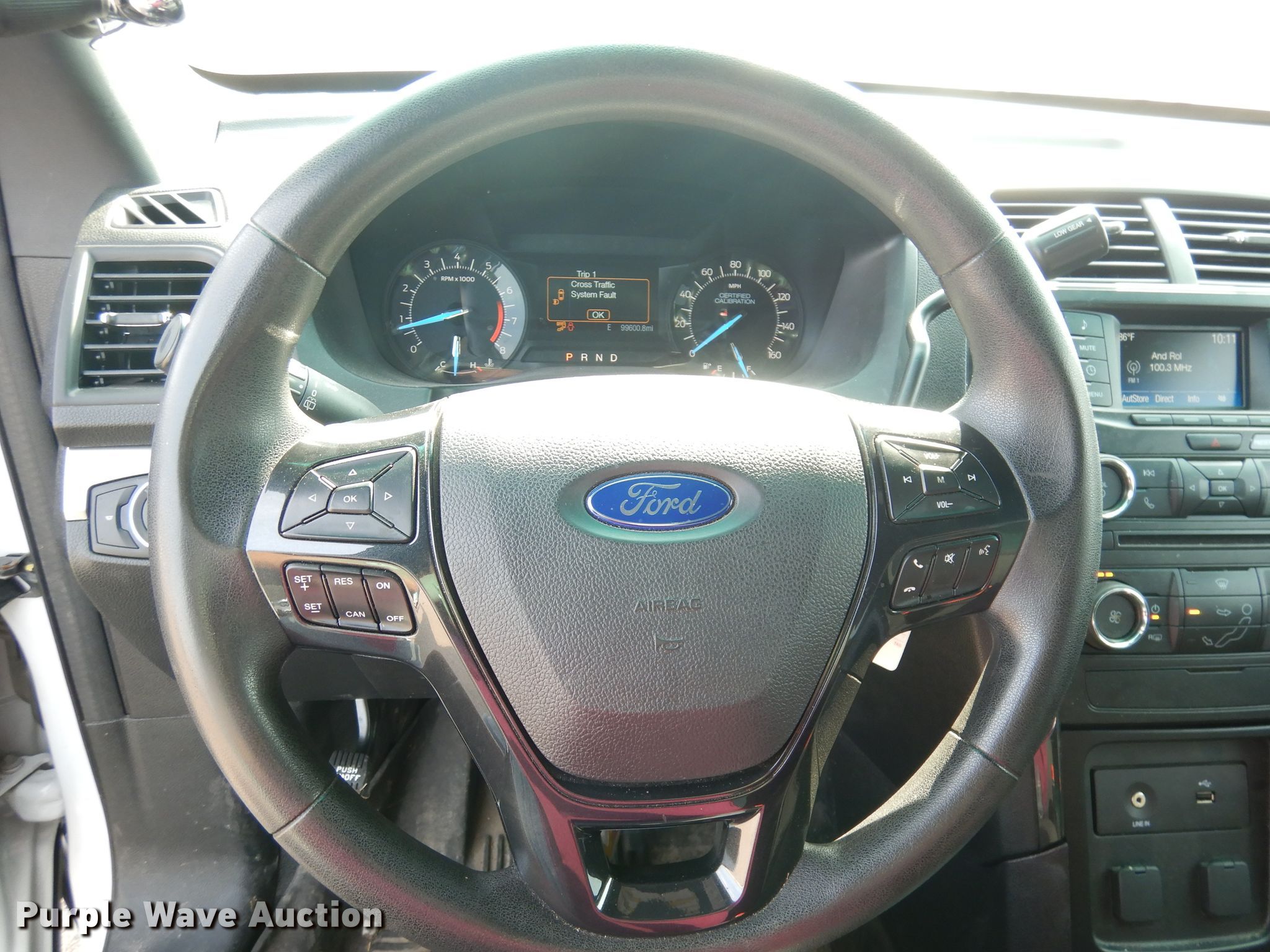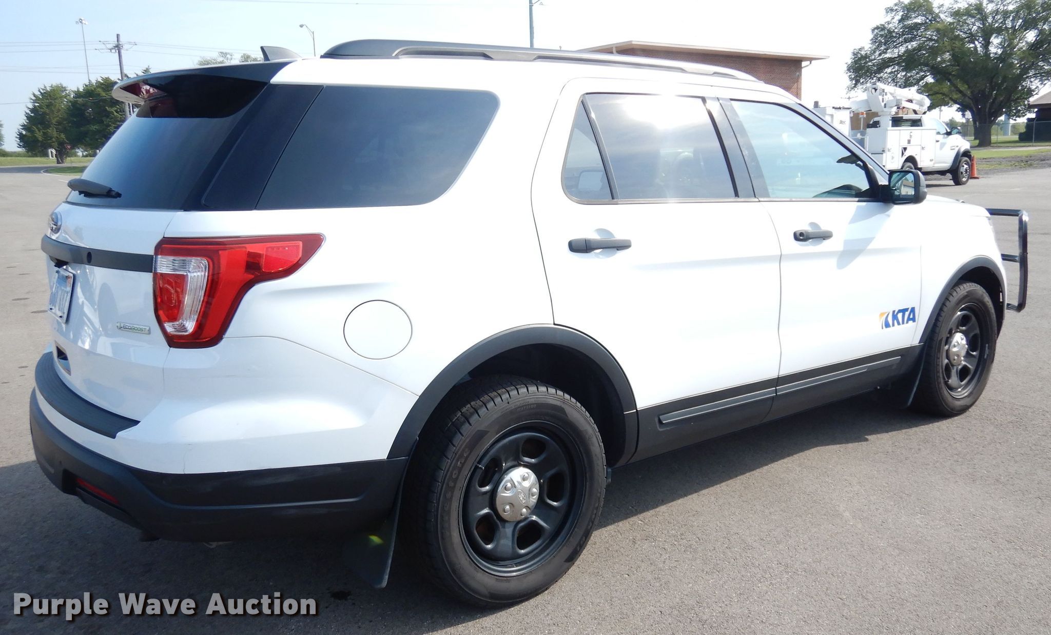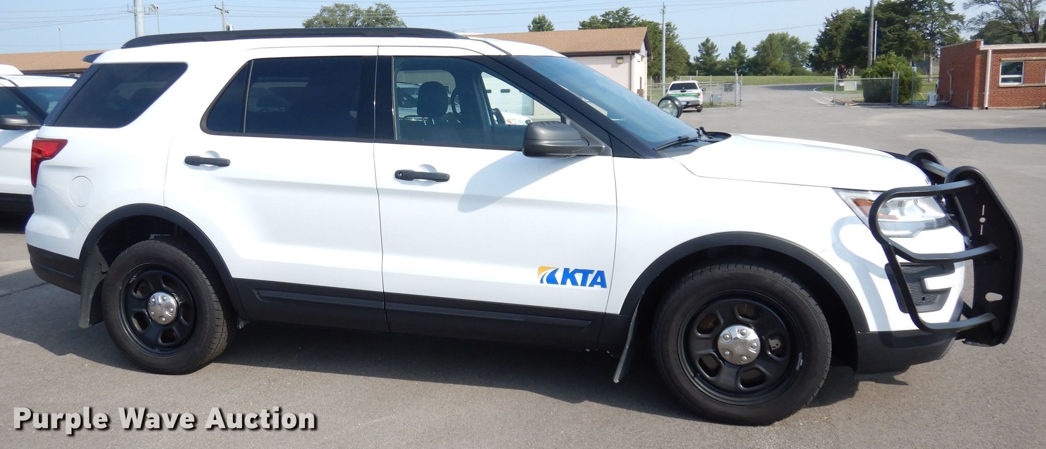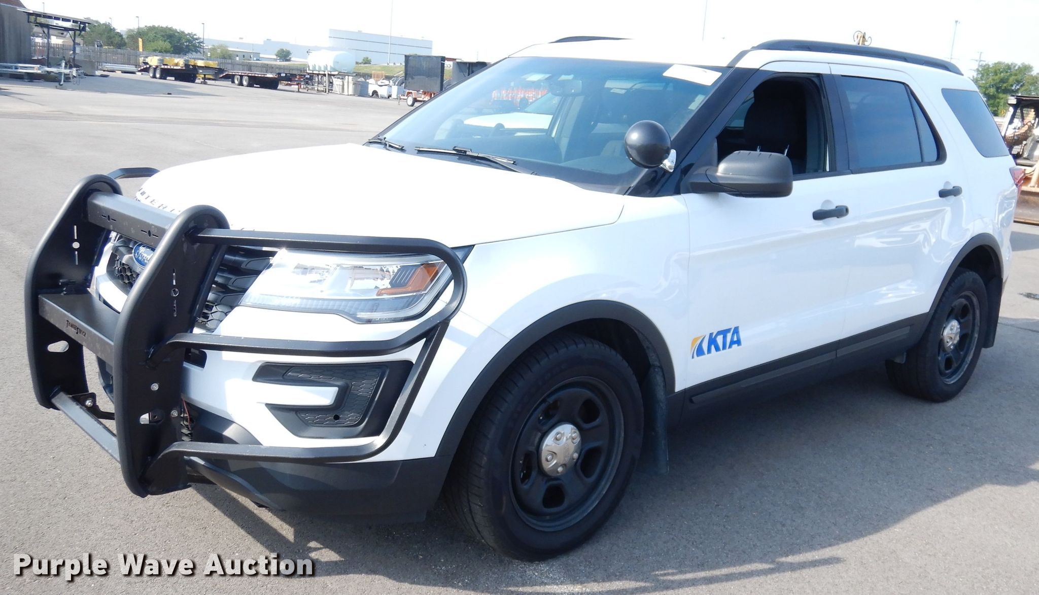 2018 Ford Explorer Police Interceptor SUV. 99,600 miles on odometer, Unit #: 38834. Engine Displacement: 3.5L V6 DOHC 24V, Cylinders: 6, Fuel type: Gas. Transmission Automatic. Interior AC, Heat, Seat: Power driver, Power windows, Power locks, Cruise control, Backup camera. Tires Size: 245/55R18. Notes No center console. Kansas title. 1FM5K8AT6JGA72624. Kansas Turnpike Authority. 3939 SW Topeka Blvd. Topeka, KS 66609