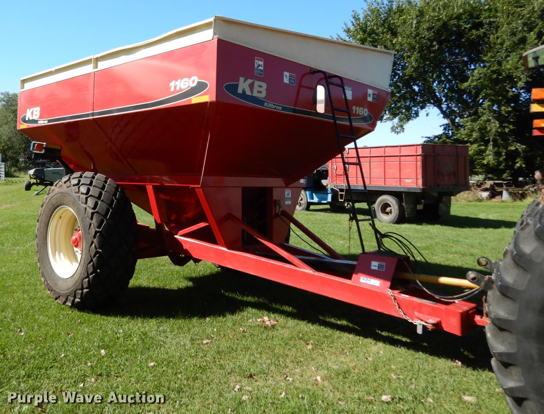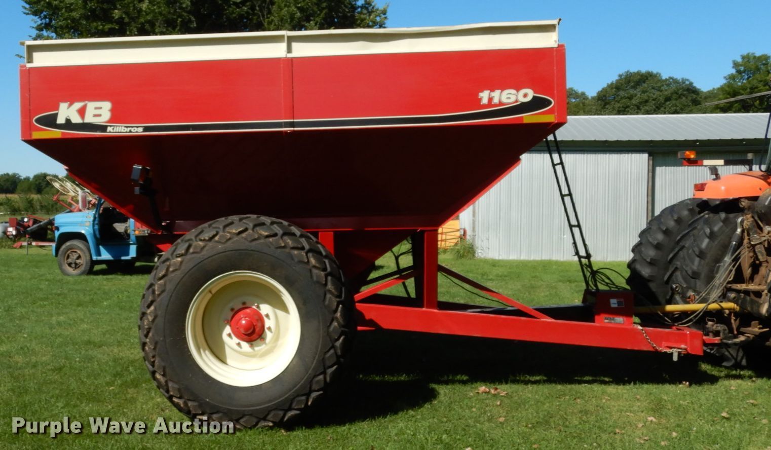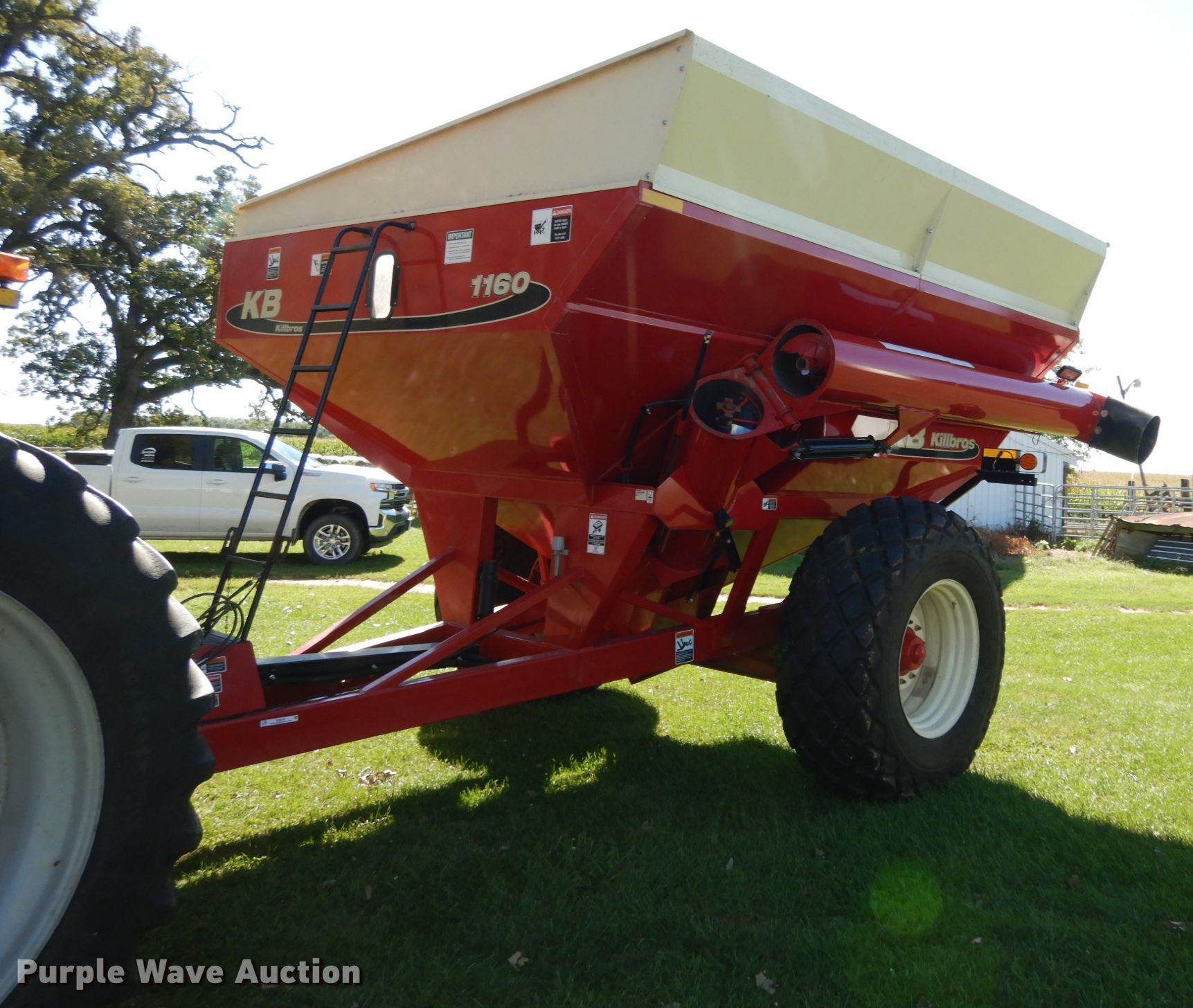 Purple Wave is selling a used Grain Cart or Gravity Wagon in Illinois. This item is a Killbros 1160 grain cart with the following: Capacity: 600 bushels, Auger diameter: 14", Shut-off gate: Hydraulic, Sight glass, Compartments: 1, PTO: 1000