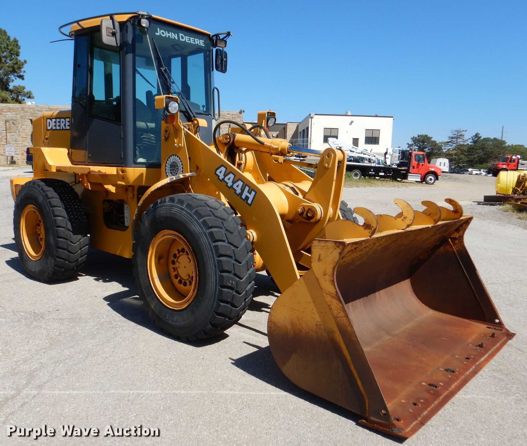 Purple Wave is selling a used Wheel Loader in Kansas. This item is a 2003 John Deere 444H wheel loader with the following: 5,335 hours on meter, Serial: DW444HX587788, KDOT ID: 365-1053