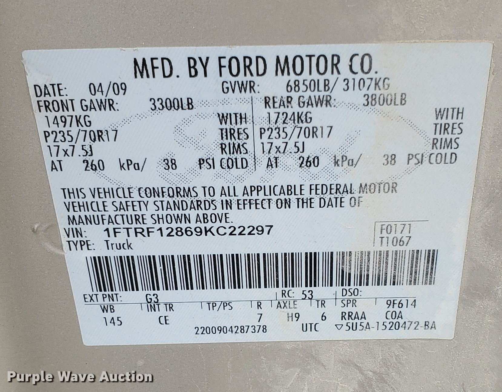 2009 Ford F150 XL pickup truck. 218,189 miles on odometer, KDOT ID: 053-2059. Engine Displacement: 4.6L V8, Cylinders: 8, Fuel type: Gas. Transmission Automatic. Interior AC, Heat, Cruise control. Tires Size: 245/70R17. Notes Dead battery. Kansas title. Titles will be distributed after confirmation of payment and removal. 1FTRF12869KC22297. Kansas Dept. of Transportation. 1006 North 3rd. Salina, KS 67401