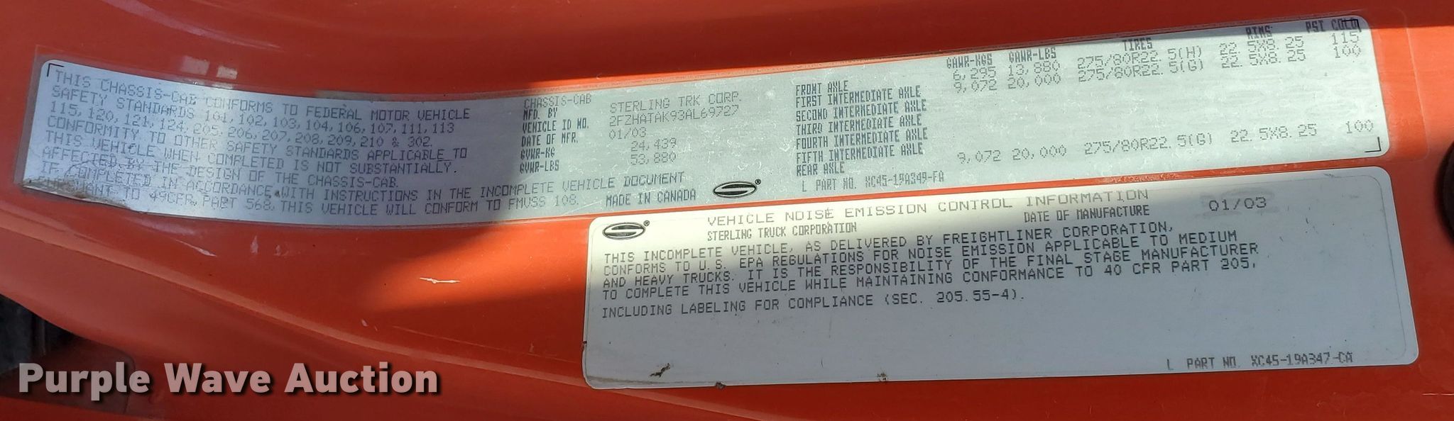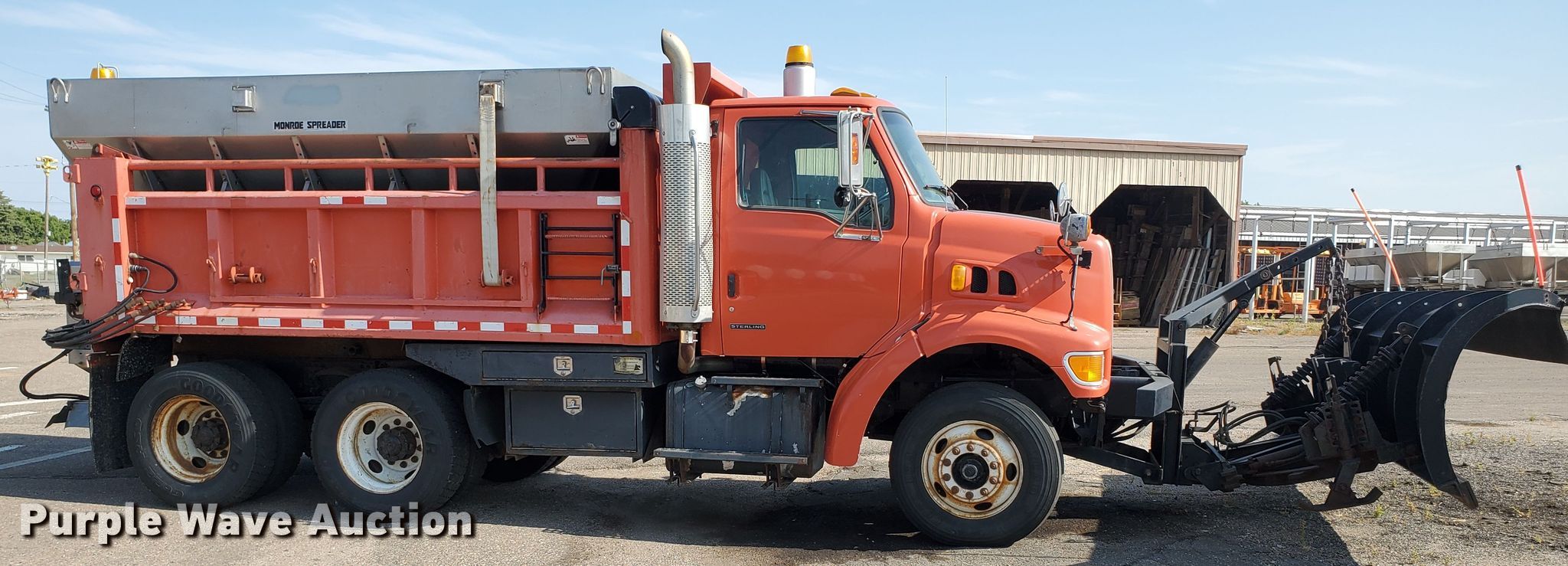 2001 Sterling LT7501 dump truck. 217,572 miles on odometer, KDOT ID: 263-3102. Engine Caterpillar 3126, Displacement: 7.2L, Cylinders: 6, Fuel type: Diesel. Transmission Allison, Automatic. Chassis Axles: Tandem, Suspension: Spring, Brakes: Air, Front mount PTO, GVWR: 53,880 lbs. Interior AC, Heat. Operational Dump bed 13' x 8' W, Side height: 36", Side board height: 8", Bed type: Steel, Ram: Single , End gate: Air operated, Spreader Monroe RT-40-145, Capacity: 9 cu.yd., Plow Monroe, Width: 11". Tires Size: 295/75R22.5. Notes Engine issues, fuel in oil, Hydraulic leaks, Hoist leaks. Kansas title. Titles will be distributed after confirmation of payment and removal. 2FZHATAK93AL69727. Kansas Department of Transportation - Norton. 312 S 2nd Ave. Norton, KS 67654