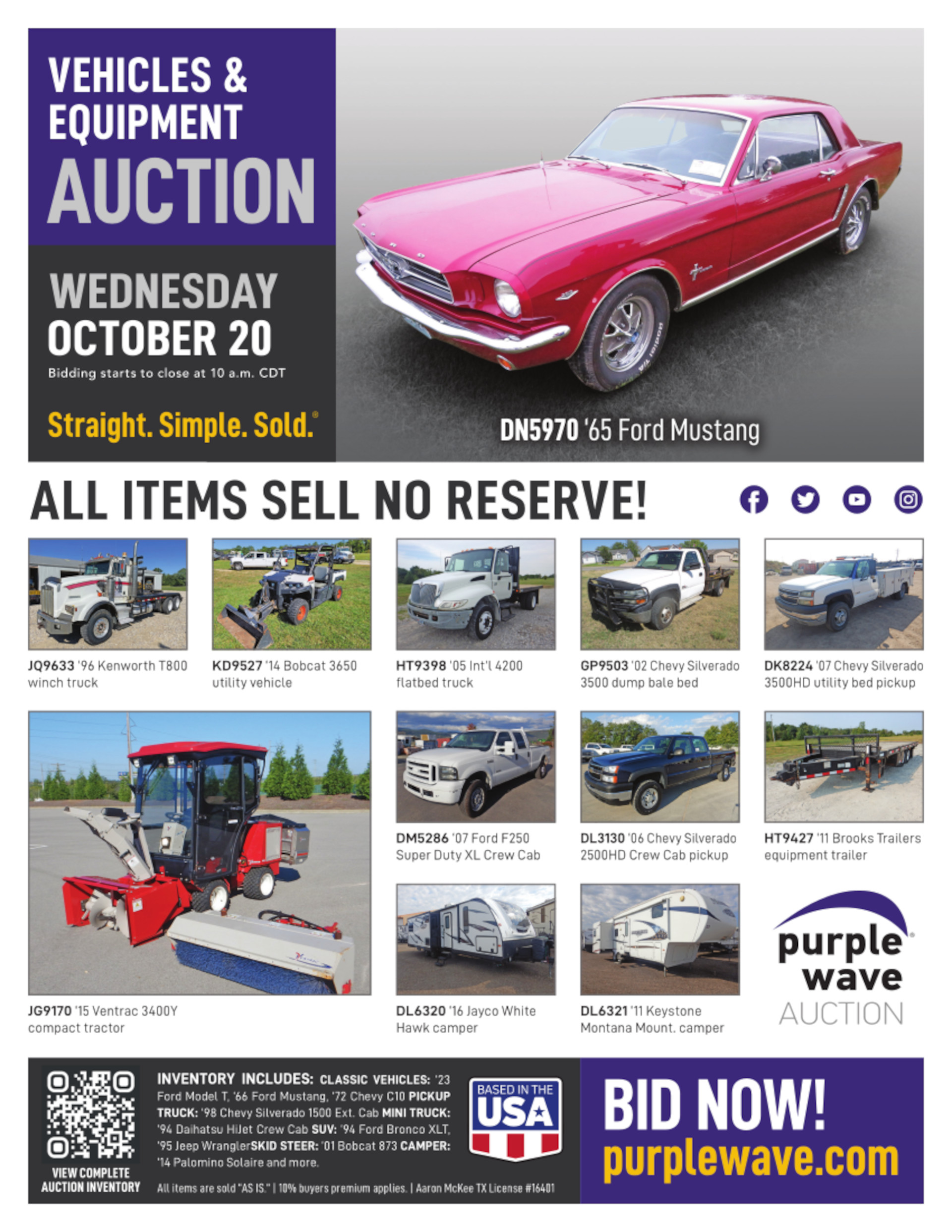 This auction is conducted by Purple Wave, Inc., whose home office is 825 Levee Drive, Manhattan, Kansas. Aaron McKee, Texas auctioneer license # 16401, operates Purple Wave, Inc. Complaints against us may be directed to the Texas Department of Licensing and Regulation, P.O. Box 12157, Austin, Texas 78711, (512) 463-6599. For additional required information, see the attached document.