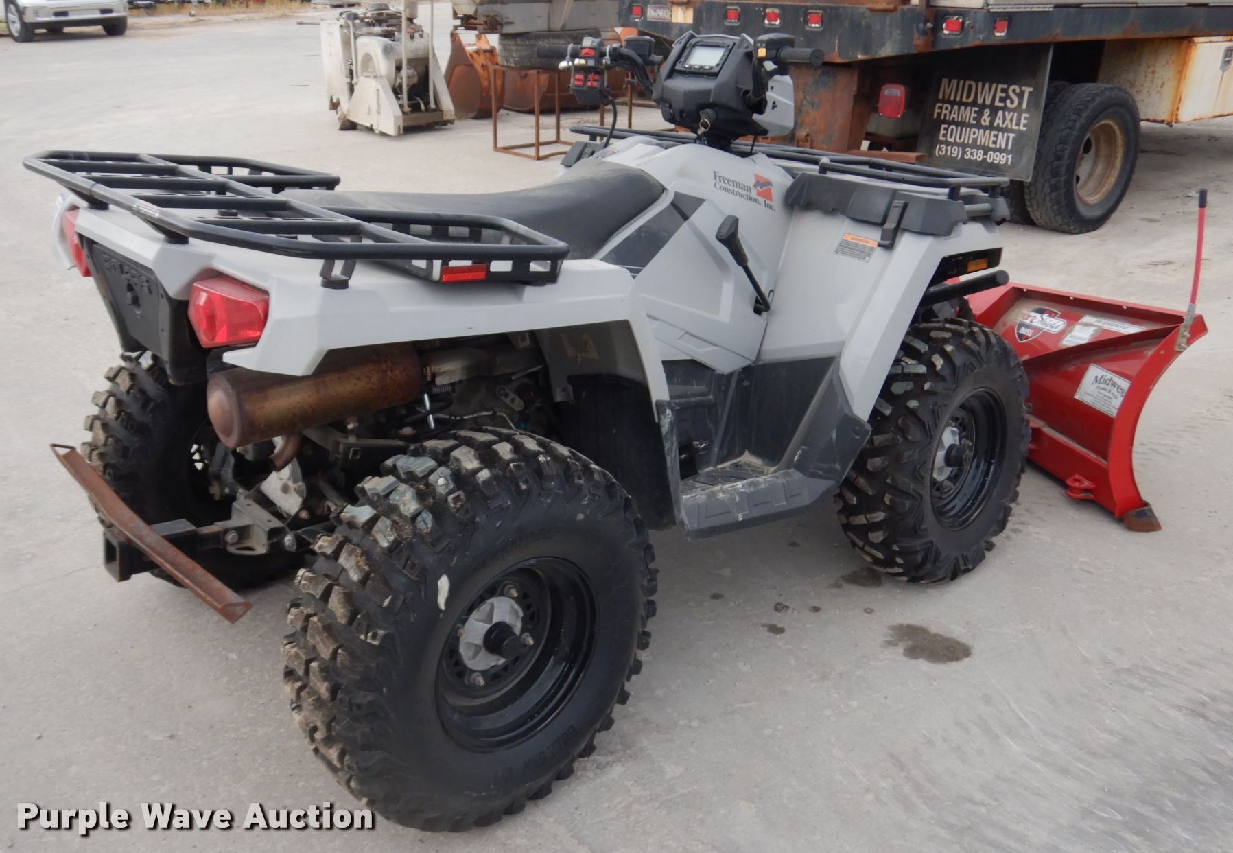 2019 Polaris ATV. Miles: 166, VIN: 4XASEG500KA281524. Engine Displacement: 500 cc, Fuel type: Gas, Electric start. Transmission Automatic. Chassis All wheel drive. Operational Receiver hitch Boss Smartshield snow plow, Width: 5'6". Tires Front: 24X8-12, Rear: 26X10R12. Iowa off highway title. Chad Freeman Construction. 521 Greenfield Dr. Tiffin, IA 52340