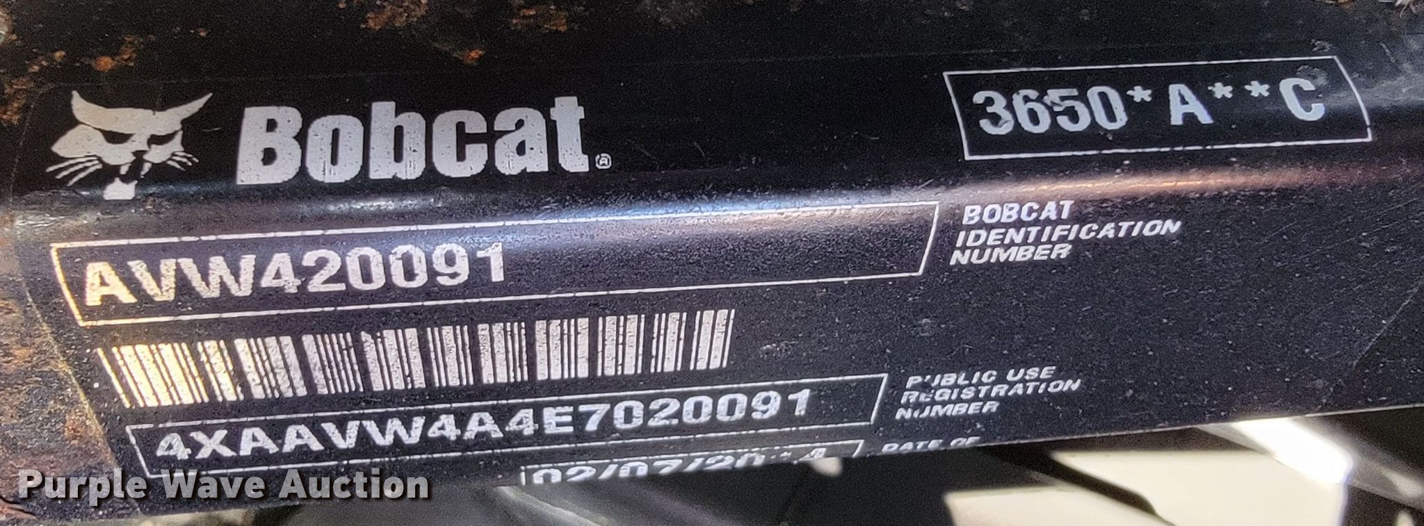 2014 Bobcat 3650 utility vehicle. 571 hours on meter. Engine Cylinders: 3, Fuel type: Diesel. Transmission Automatic. Chassis Four wheel drive. Operators station Canopy, Passengers: 2. Operational Tool carrier, Dump bed 43" L x 54" W, Dump bed type: Electric/ Hydraulic, Attachment Bucket Width: 62".. Tires Size: 25x10. Transfer of ownership documentation will be a bill of sale. 4XAAVW4A4E7020091. 22474 Restful Ln. Waynesville, MO 65583