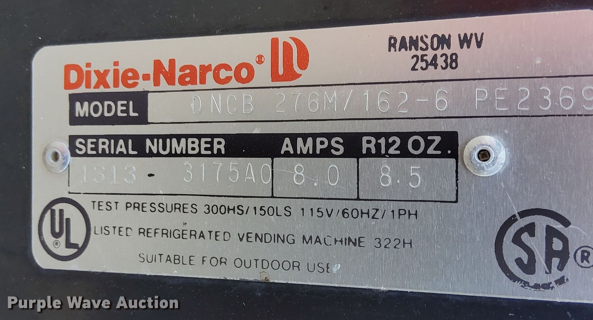 Purple Wave is selling a used Retail Displays in Nebraska. This item is a Dixie-Narco vending machine with the following: Serial: 1313-3175A0