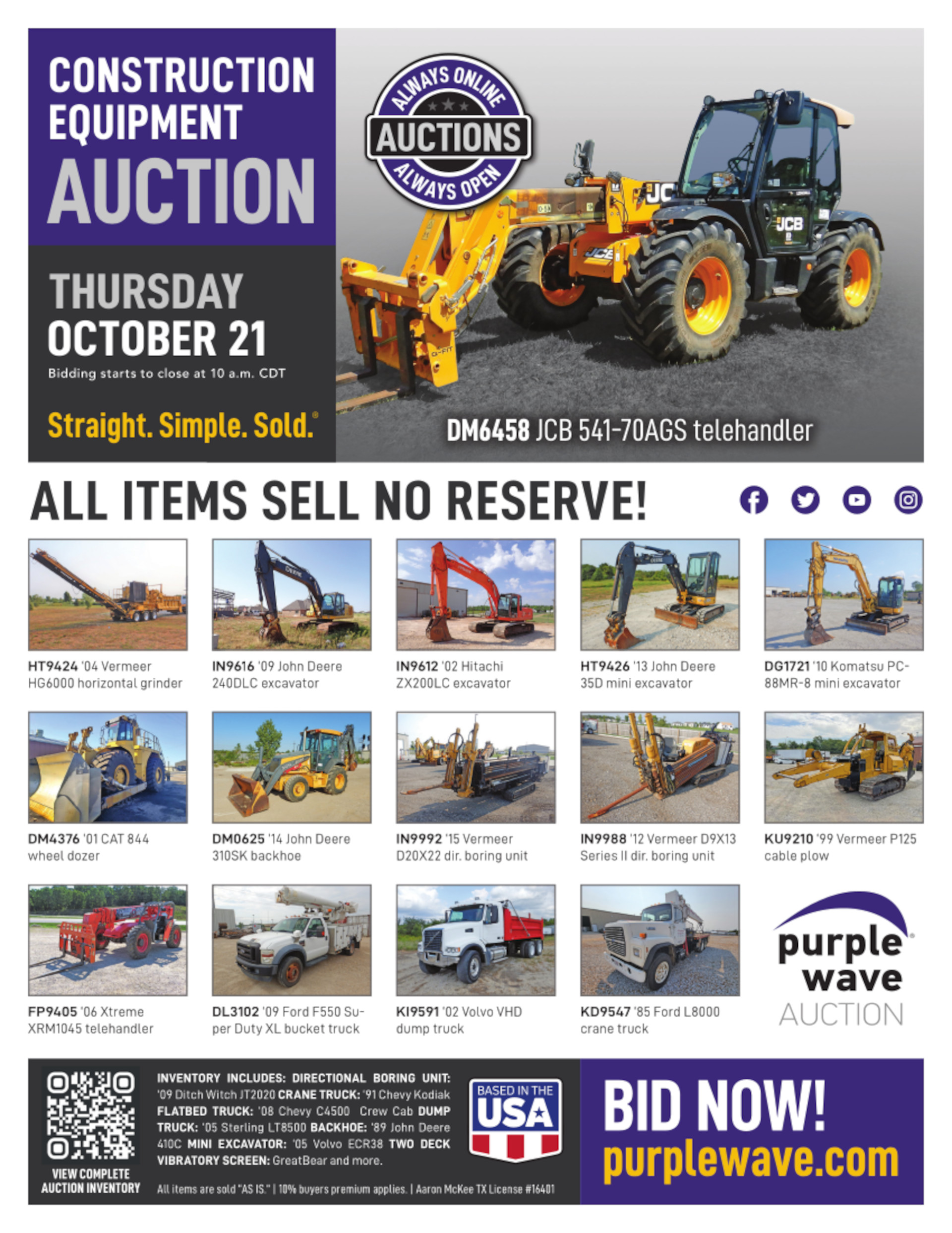 This auction is conducted by Purple Wave, Inc., whose home office is 825 Levee Drive, Manhattan, Kansas. Aaron McKee, Texas auctioneer license # 16401, operates Purple Wave, Inc. Complaints against us may be directed to the Texas Department of Licensing and Regulation, P.O. Box 12157, Austin, Texas 78711, (512) 463-6599. For additional required information, see the attached document.