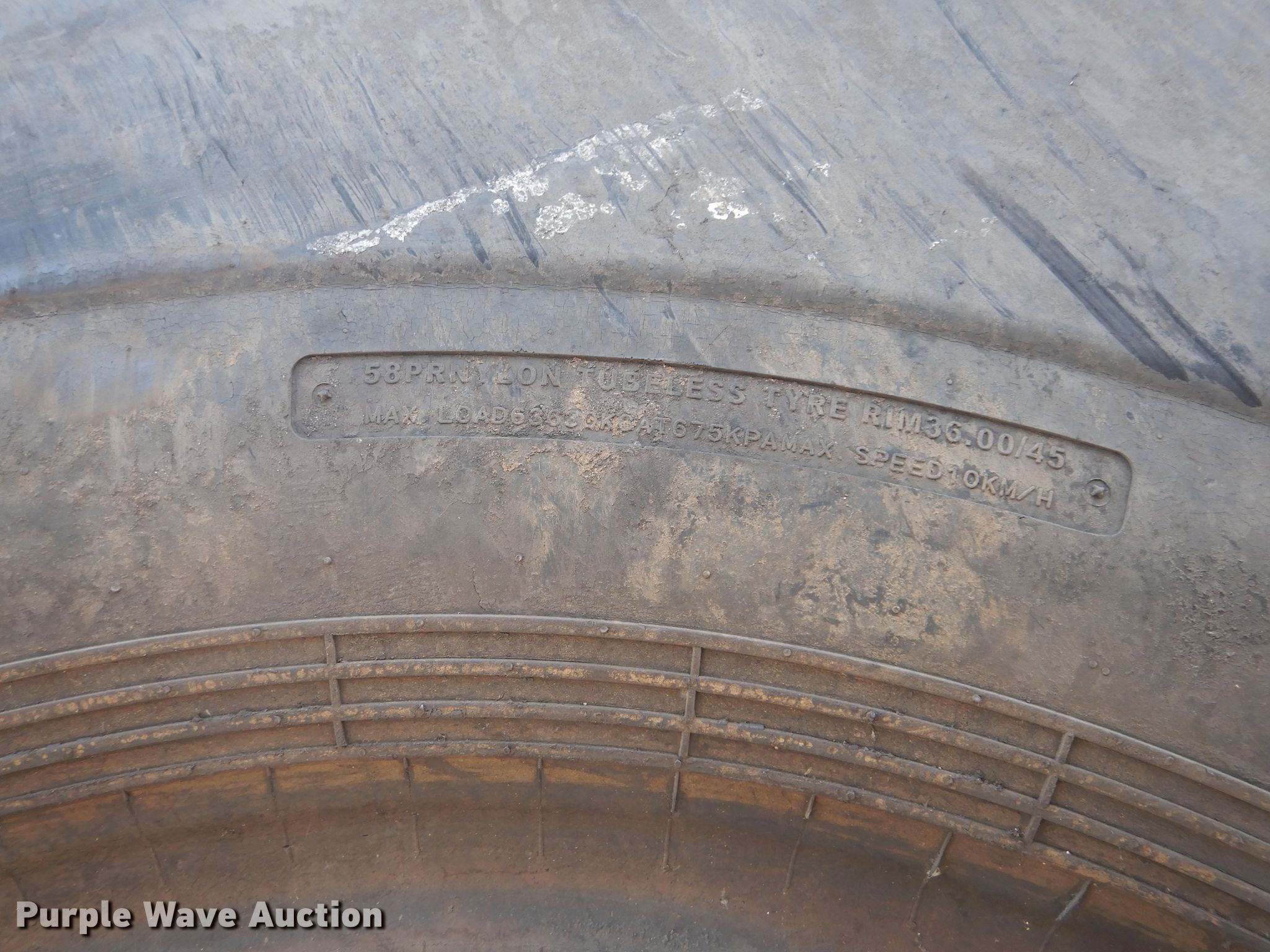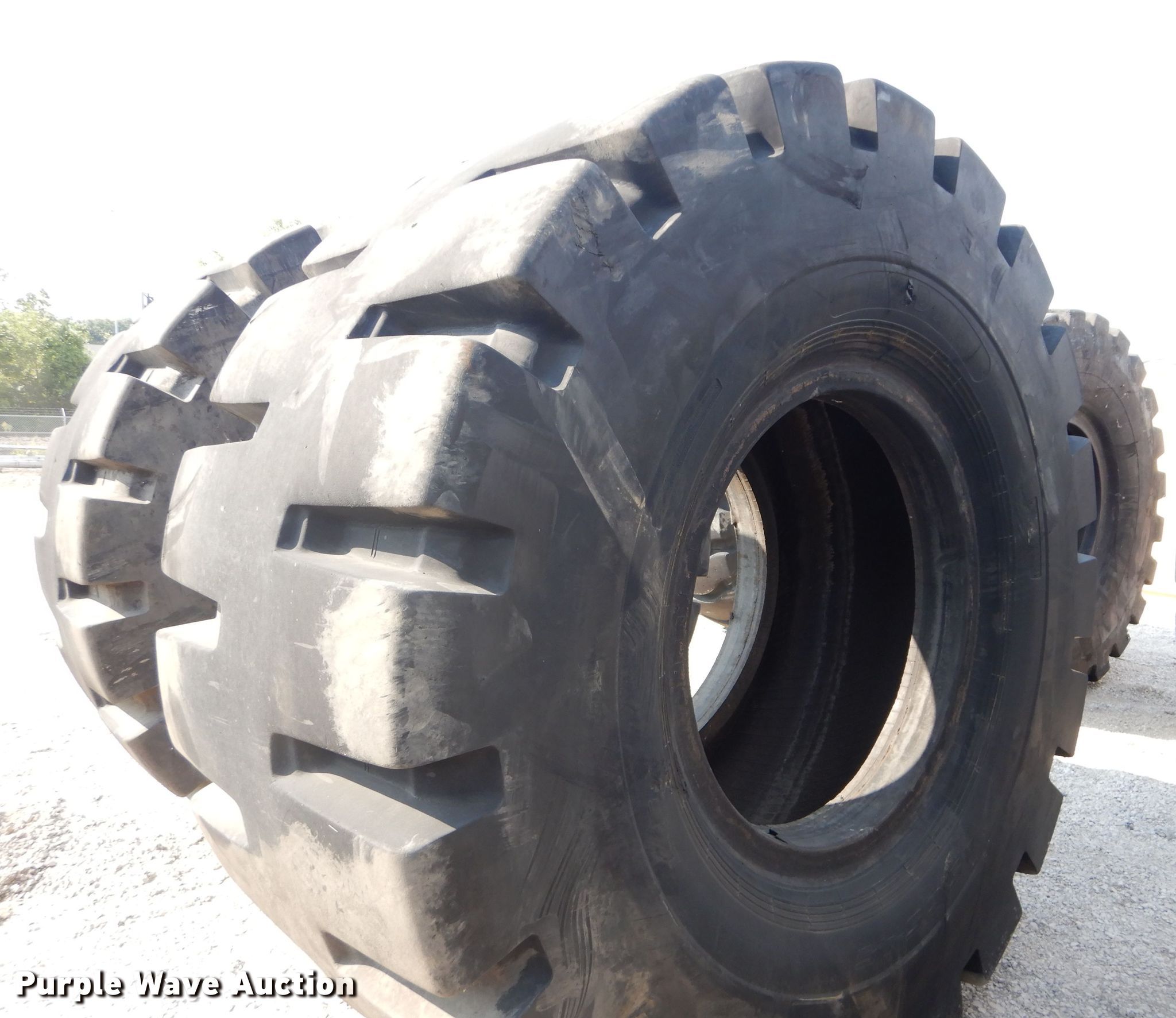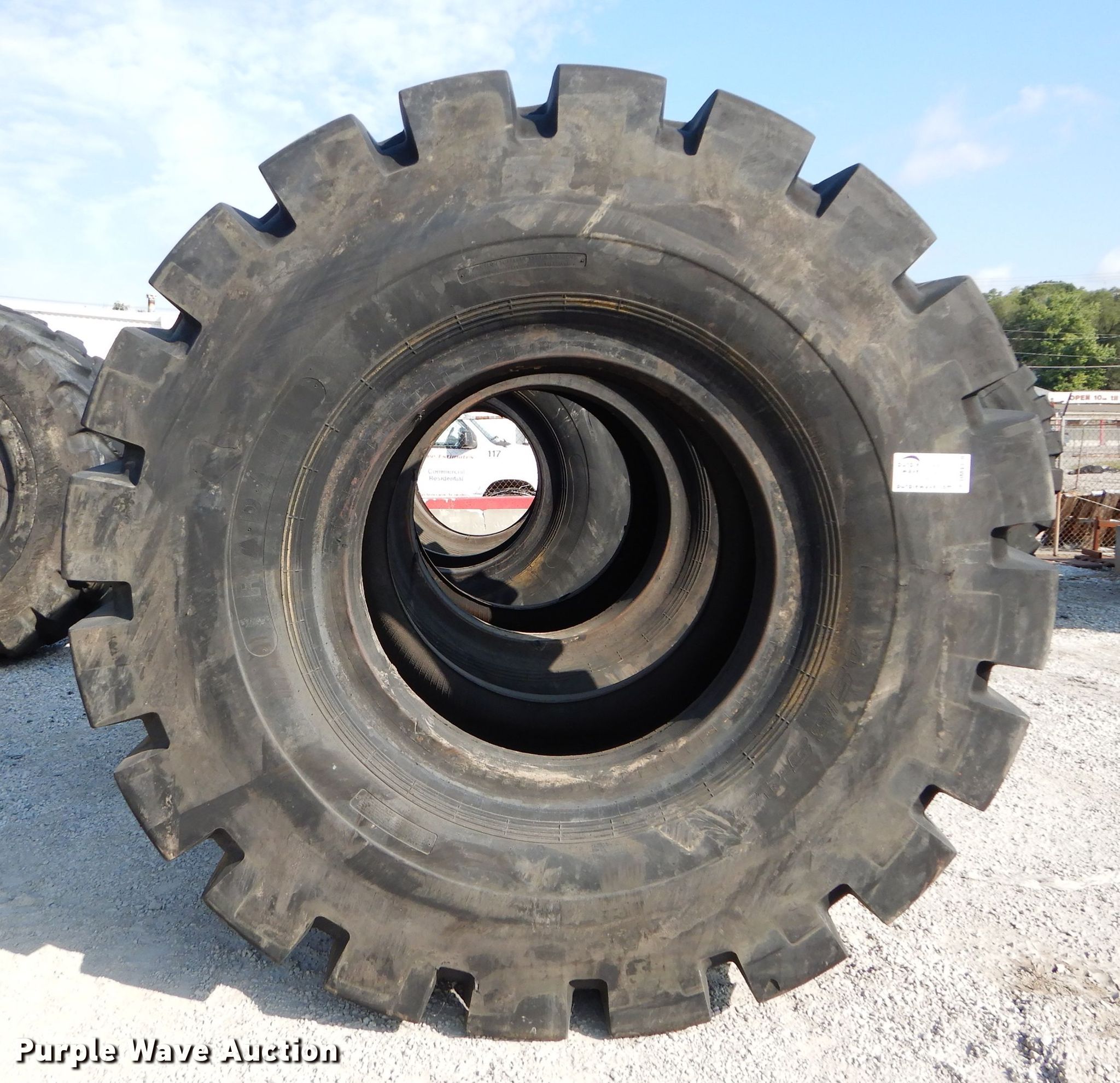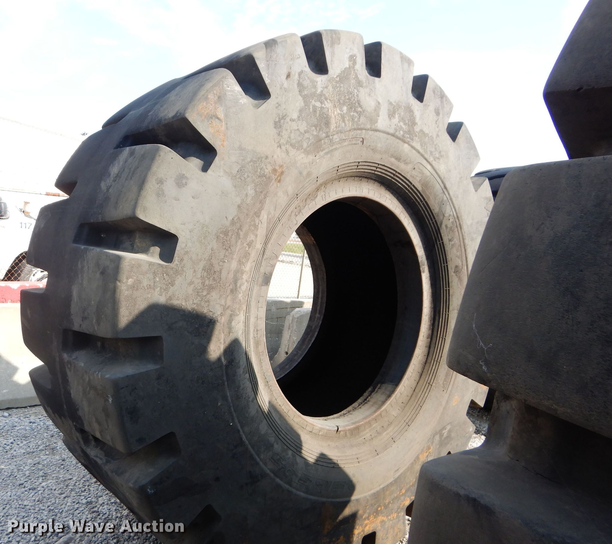 Purple Wave is selling a used Industrial Tires or Tracks in Kansas. This item is a (4) Radar 45/65-45 dozer tires with the following: L5 tread pattern, 58 PR Nylon, 36.00/45 wheel size, Cuts in sidewalls, Unknown operating condition