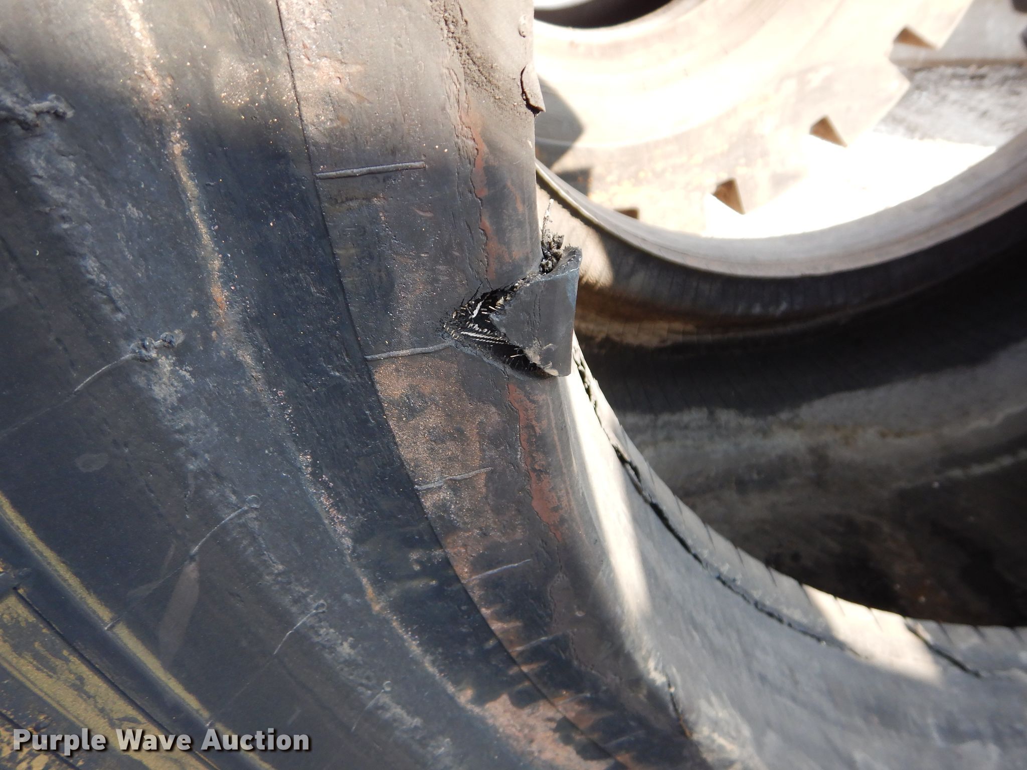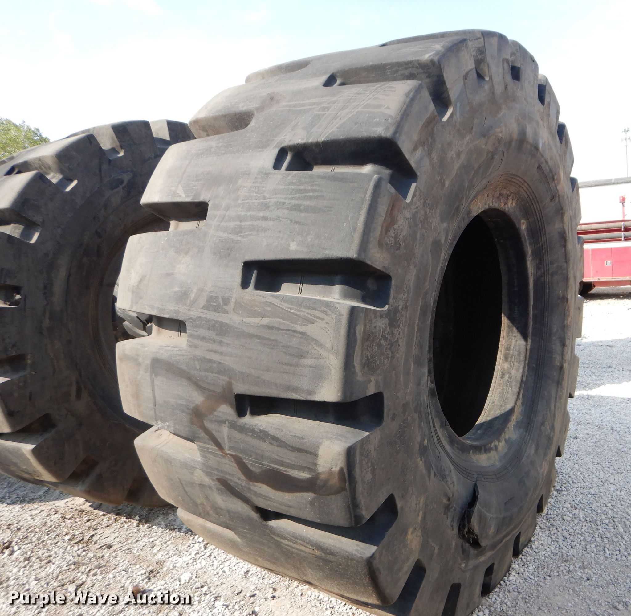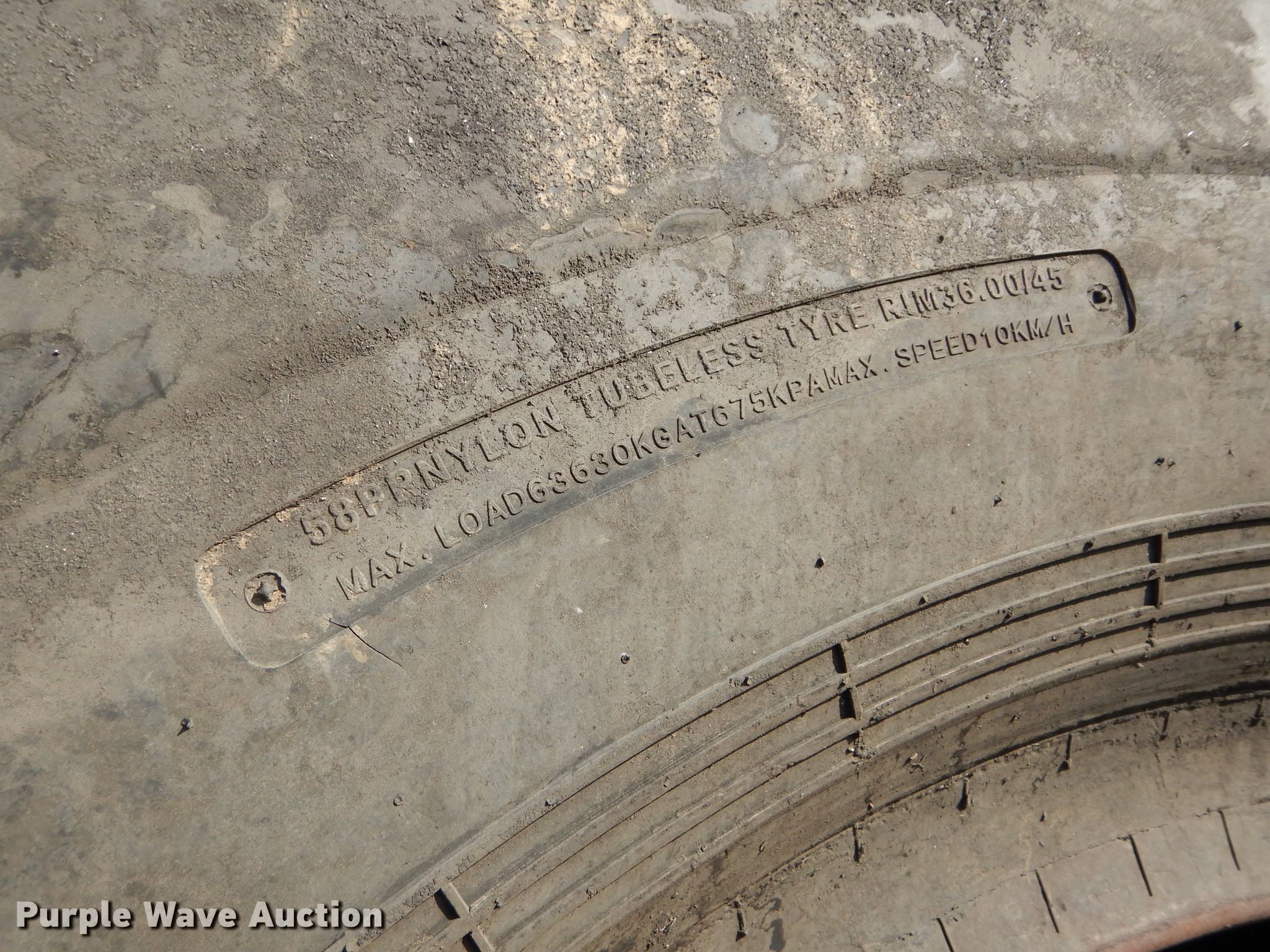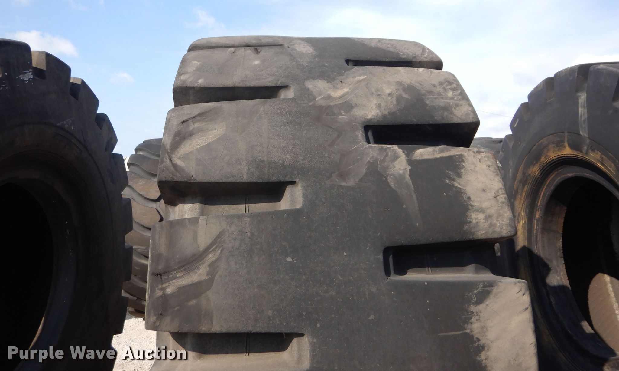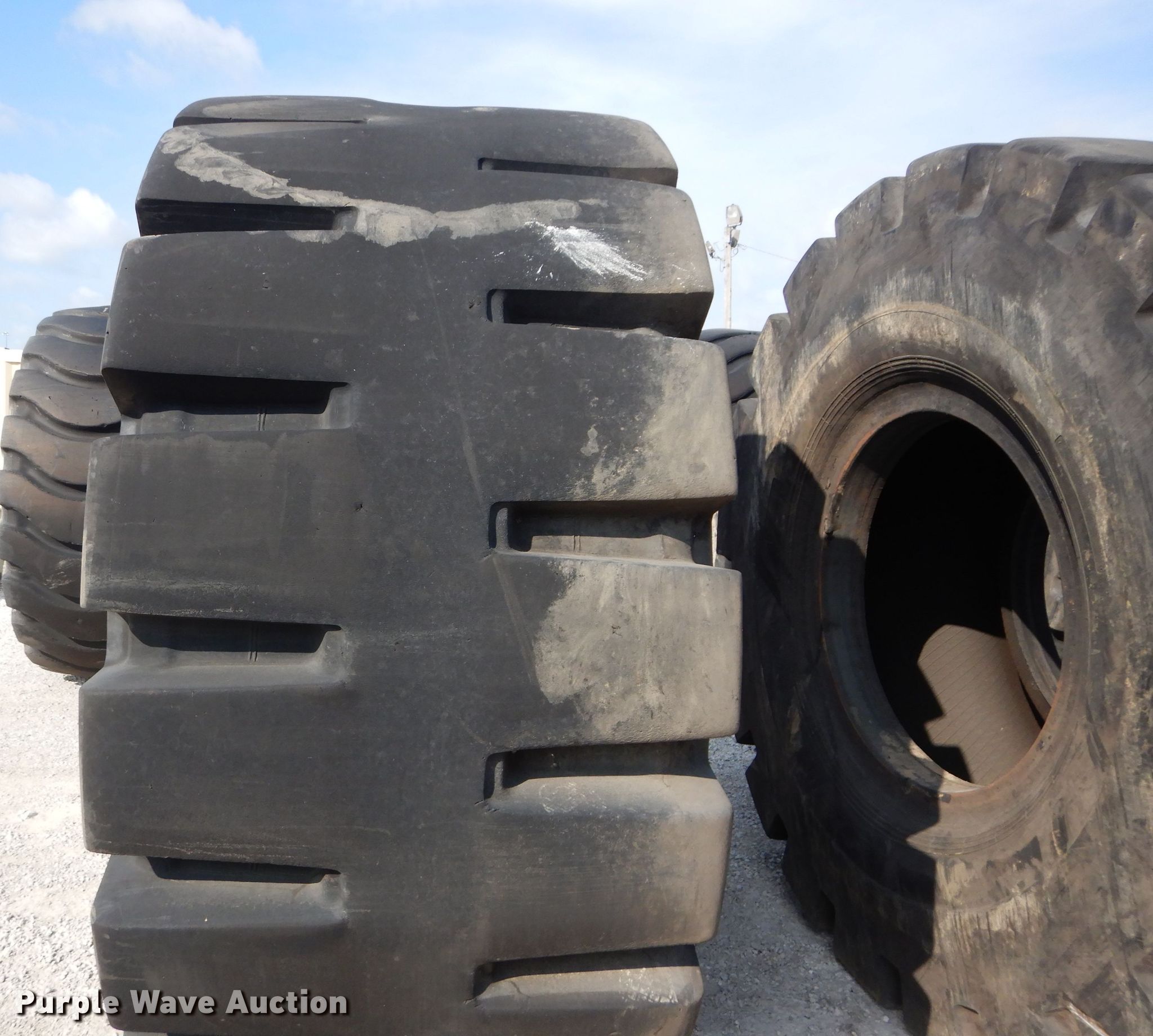 Purple Wave is selling a used Industrial Tires or Tracks in Kansas. This item is a (4) Radar 45/65-45 dozer tires with the following: L5 tread pattern, 58 PR Nylon, 36.00/45 wheel size, Cuts in sidewalls, Unknown operating condition