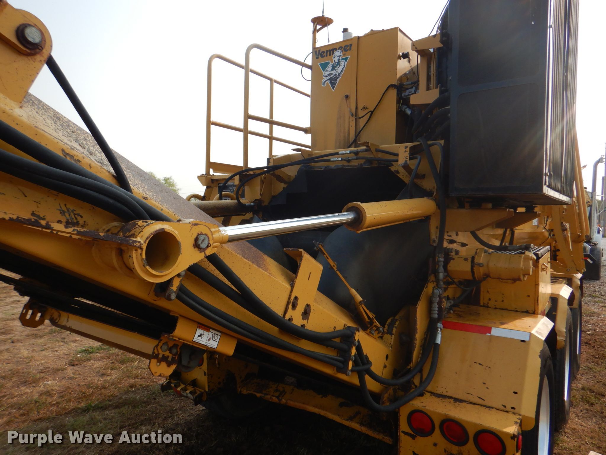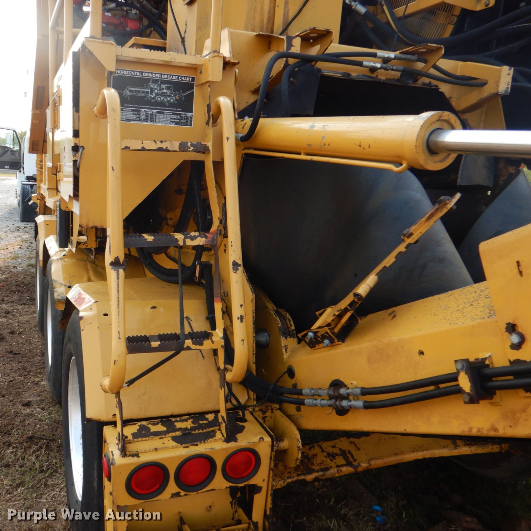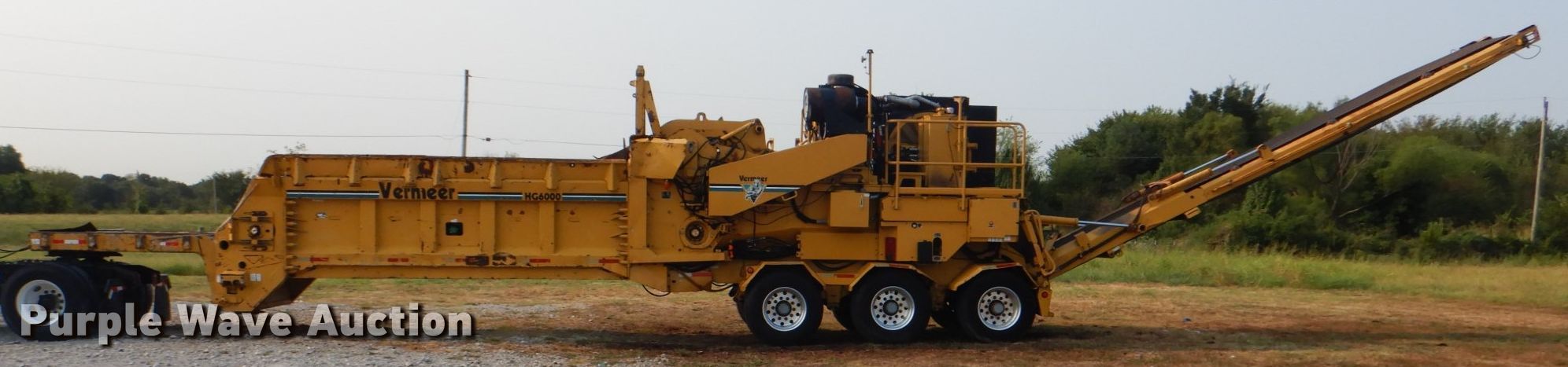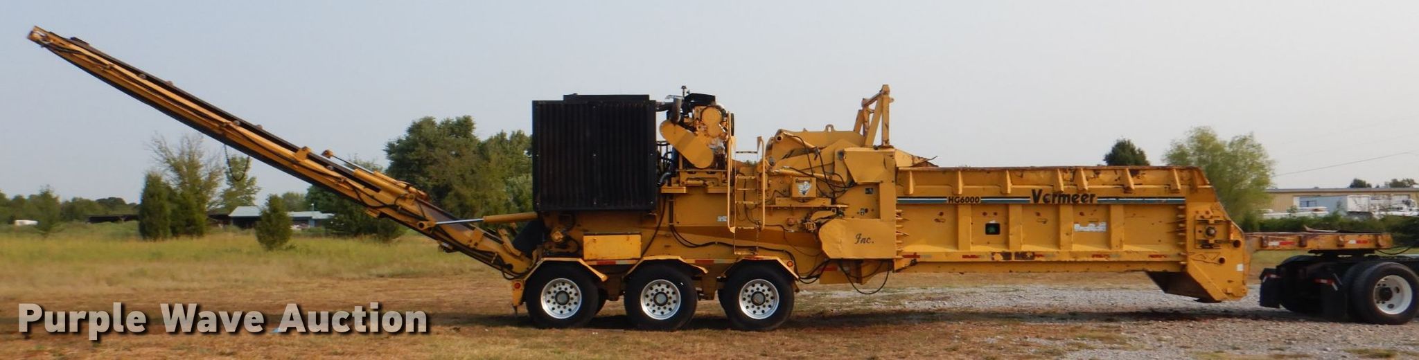 Purple Wave is selling a used Wood Grinder in Oklahoma. This item is a 2004 Vermeer HG6000 horizontal grinder with the following: 3,703 hours on meter, 38'L x 98"W x 13'H, Caterpillar C15 six cylinder diesel engine, Serial: BFM01385, 60" feed table width, 47" feed roller length, 36" infeed roller diameter, 33" max feed height, (13) bar teeth, Detachable neck, Triple axle, Air brakes, Spring suspension, GVWR 60,000 lbs, GAWR 18,740 lbs, 385/65R22.5 tires