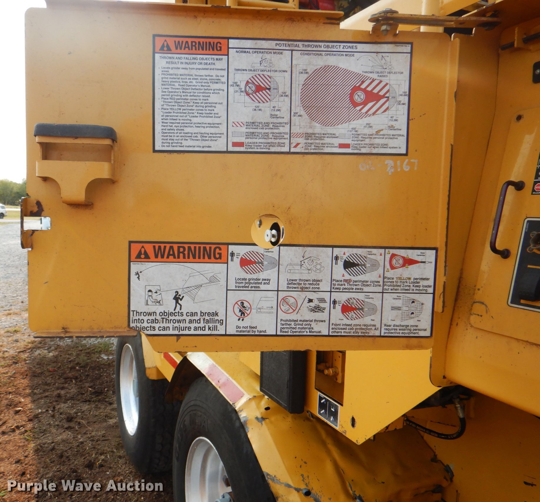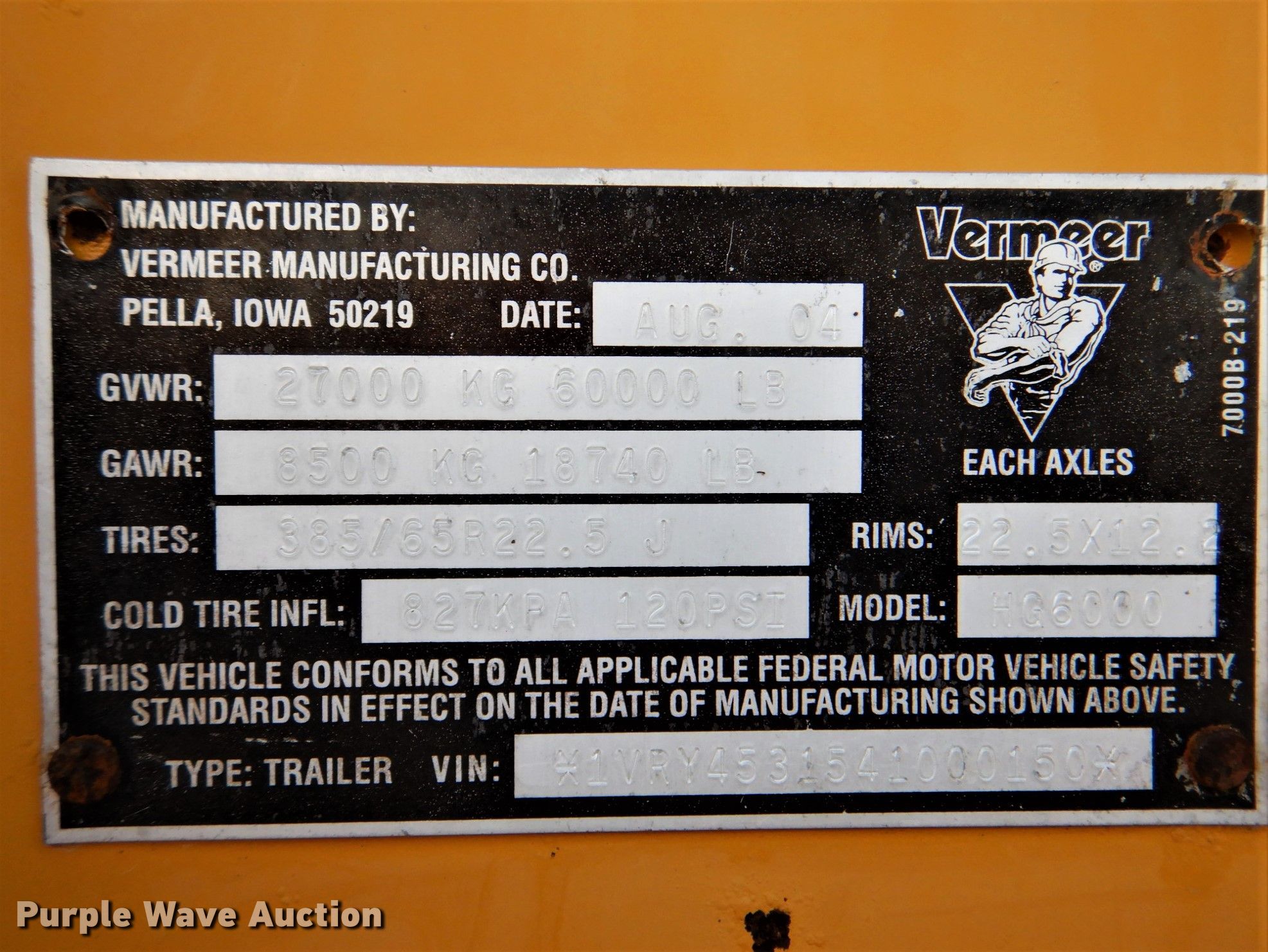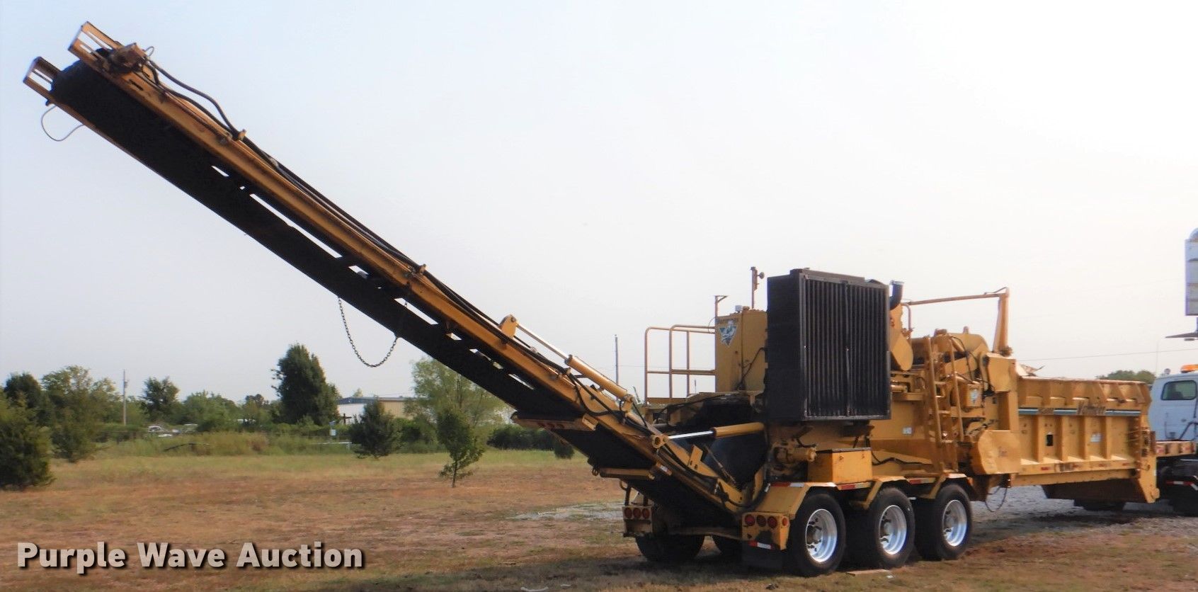 Purple Wave is selling a used Wood Grinder in Oklahoma. This item is a 2004 Vermeer HG6000 horizontal grinder with the following: 3,703 hours on meter, 38'L x 98"W x 13'H, Caterpillar C15 six cylinder diesel engine, Serial: BFM01385, 60" feed table width, 47" feed roller length, 36" infeed roller diameter, 33" max feed height, (13) bar teeth, Detachable neck, Triple axle, Air brakes, Spring suspension, GVWR 60,000 lbs, GAWR 18,740 lbs, 385/65R22.5 tires