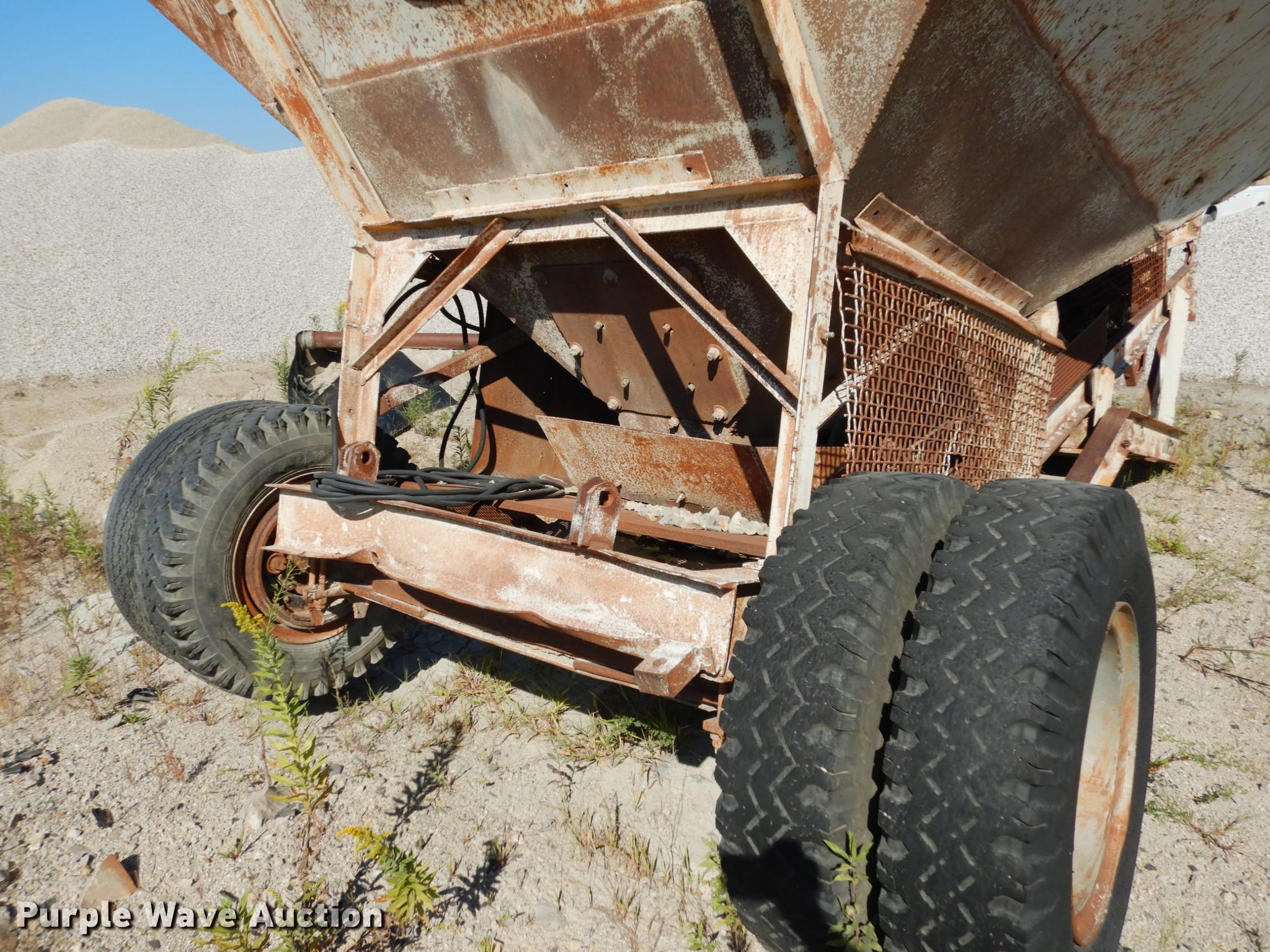 Peerless rock bin and conveyor. 40" belt, 10' x 10' bin, 9.00-20 tires. Gondringer Enterprises. 24049 Hwy Z. Dawn, MO 64638