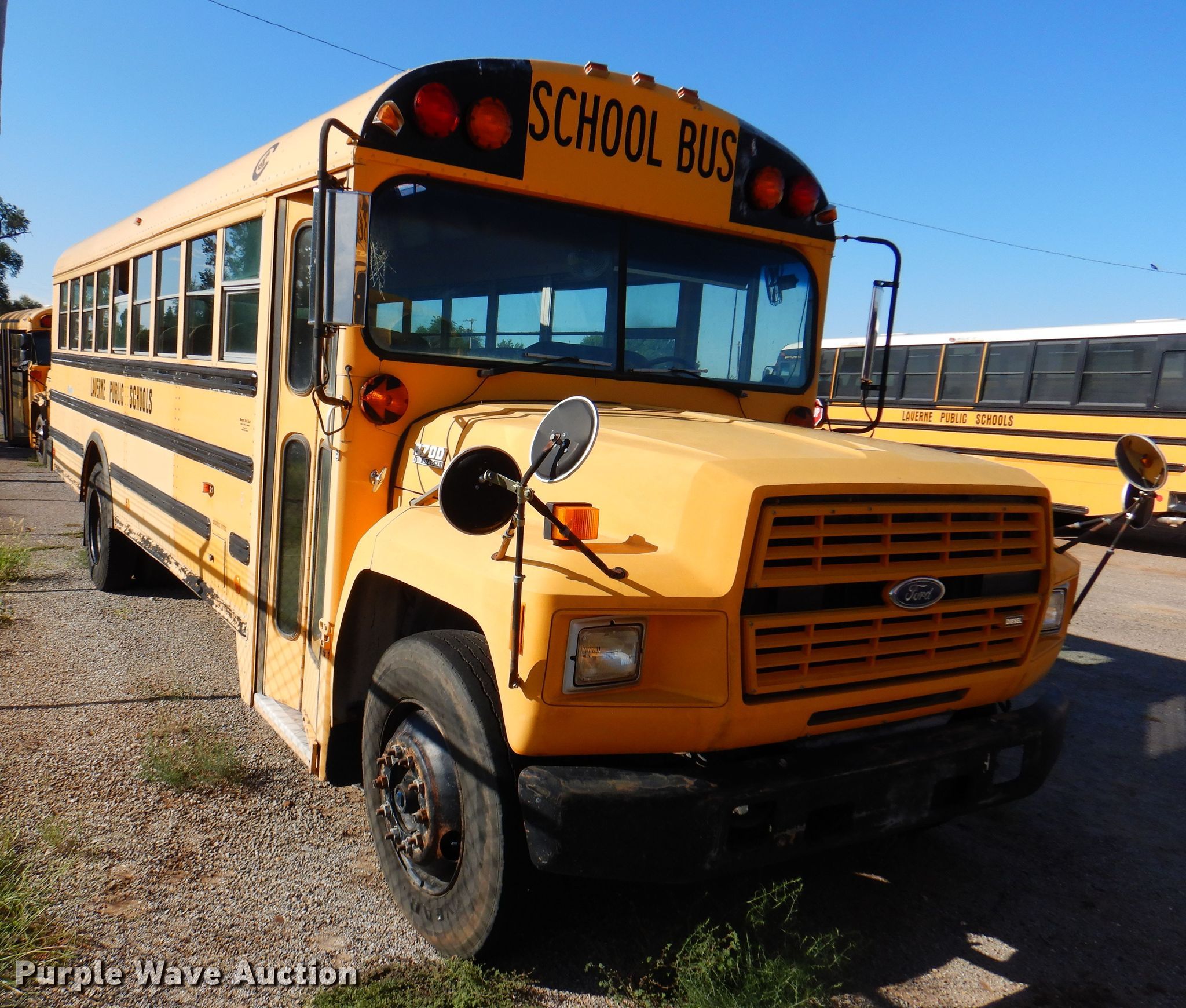 1990 Ford B700 school bus. Miles: 88,594 on odometer, VIN: 1FDXJ75A8LVA35748. Engine Displacement: 7.8L, Cylinders: 6, Fuel type: Diesel. Transmission Manual, Speed: 5, plus 2. Chassis Axles: Single, Suspension: Spring, Brakes: Air, GVWR: 26,500 lbs. Interior Heat, Heated mirrors, Passengers: 53, Seats Adult seats: 53. Tires Size: 10R22.5. Notes Starter issues, Dead batteries, Non-operational unit. Oklahoma title. Title distribution may be delayed up to 14 days from verification of funds. Laverne Public Schools. 524 NW 5th St. Laverne, OK 73848
