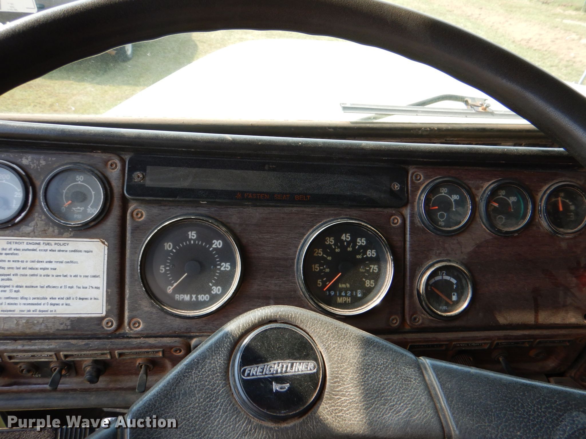 1990 Freightliner FLD120 dump truck. Miles: 891,422 on odometer, VIN: 1FUYDCXB1LP376615. Engine Detroit Diesel, Displacement: 11.1L, Cylinders: 6, Fuel type: Diesel. Transmission Eaton Fuller Roadranger, Manual, Speed: 9. Chassis Axles: Tandem, Suspension: Spring, Brakes: Air, PTO. Interior AC, Heat, Heated mirrors, Cruise control. Operational Dump bed 13' L x 8' W, Side height: 37", Side board height: 9", Bed type: Steel, Roll tarp, Ram: Single. Tires Size: 11R22.5. Notes PTO leaks, Unknown operating condition of dump bed. Oklahoma title. Title distribution may be delayed up to 30 days from verification of funds. Garvin County. 606 Main St. Elmore City, OK 73433