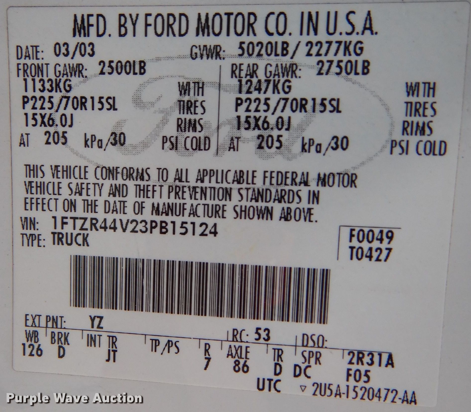2003 Ford Ranger SuperCab pickup truck. Miles: 115,840 on odometer, VIN: 1FTZR44V23PB15124, Unit #: 718. Engine Displacement: 3.0L V6 OHV 12V, Cylinders: 6, Fuel type: Gas. Transmission Automatic. Interior AC, Heat. Tires Size: 225/70R15. Notes Dash warning indicator: ABS, Hail damage. Kansas title. Kansas City, KS 66109