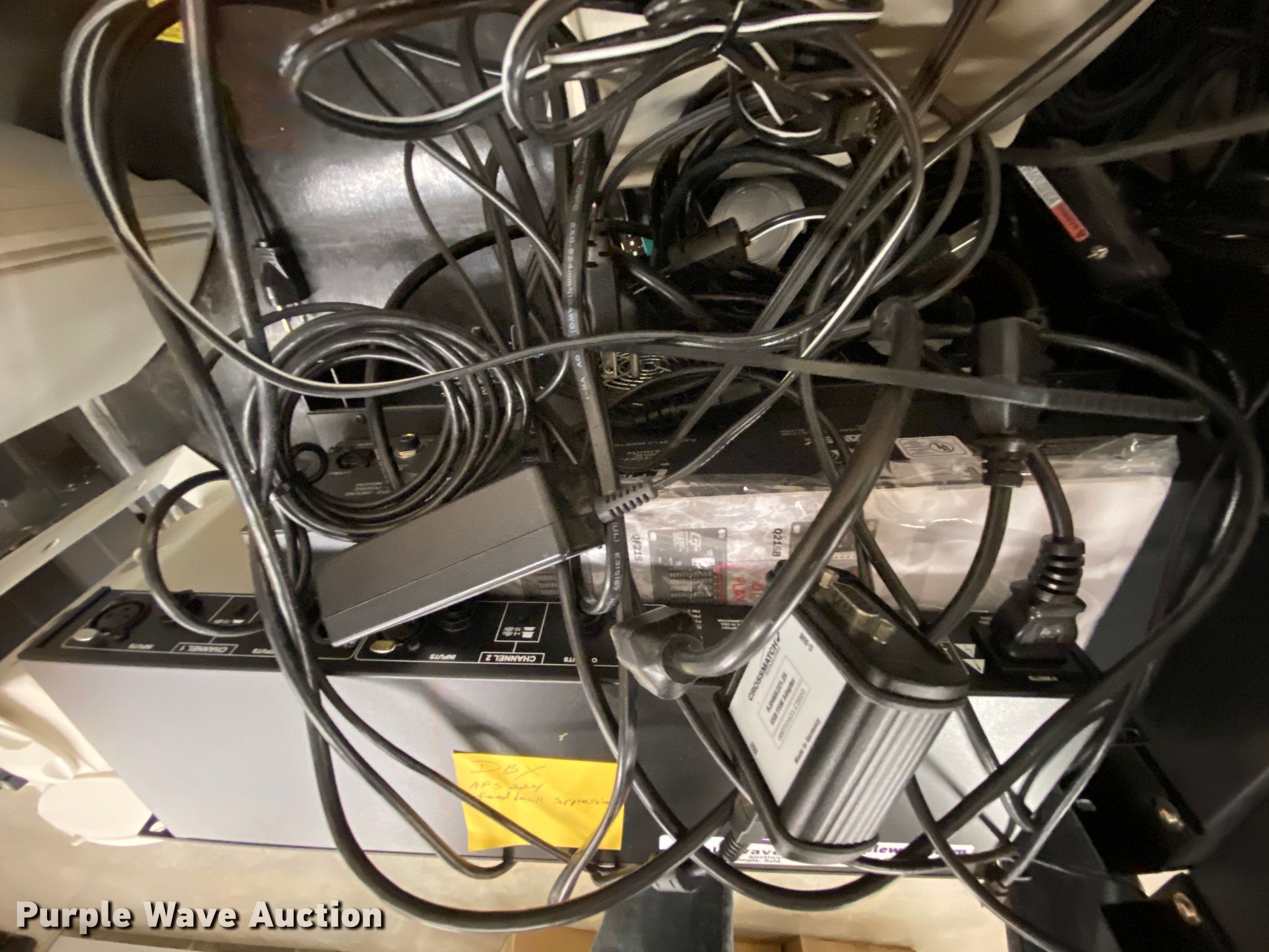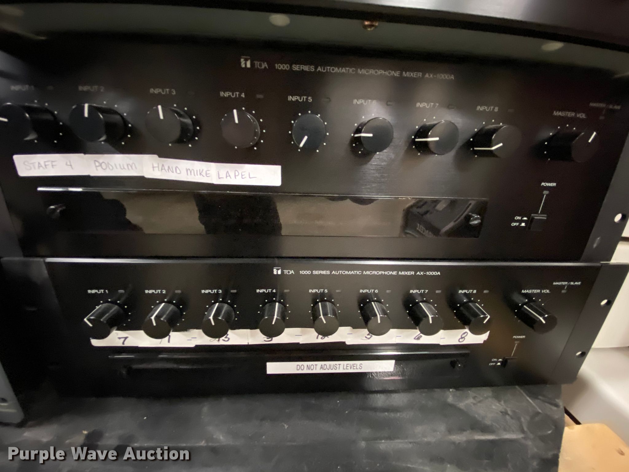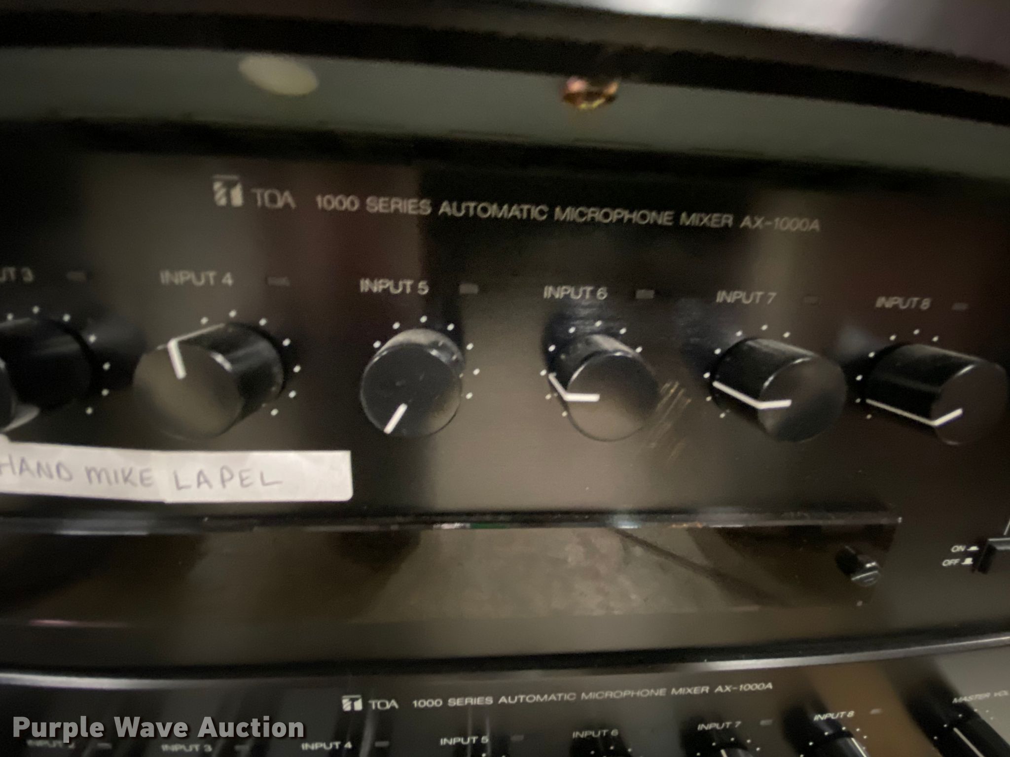 Purple Wave is selling a used Electronics in Missouri. This item is a Audio system with the following: DBX Advanced Feedback suppression, Equinox MP-600 amplifier, 4 ohms, 200 watt, TOA, (3) pieces, Eight channels, 100 series automatic, Microphone mixer, Ax-100A, (4) MG MG-SB-700TW wall speakers, (8) INC-8A flush mount speakers, Unknown operating condition