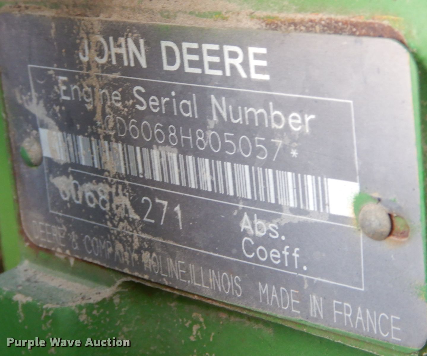 2003 John Deere 6615 MFWD tractor. Hours: 1,470 on meter, Serial: L06615A368578. Engine John Deere 6068, Serial: CD6068H805057, Cylinders: 6, Fuel type: Diesel. Transmission Synchro, 12F - 4R. Operational PTO: 540, Three point Top link, Seven pin outlet, Hydraulic remote sets Rear: 3, Suitcase weights: 6. Tires Front: 13.6-28, Rear: 480/80R38, Wheel weights: 2. Notes Hour meter replaced at 3,497 hours, Transmission issues, C range inoperable. Missouri Department of Transportation (MODOT). 26826 US Hwy 63. Macon, MO 63552