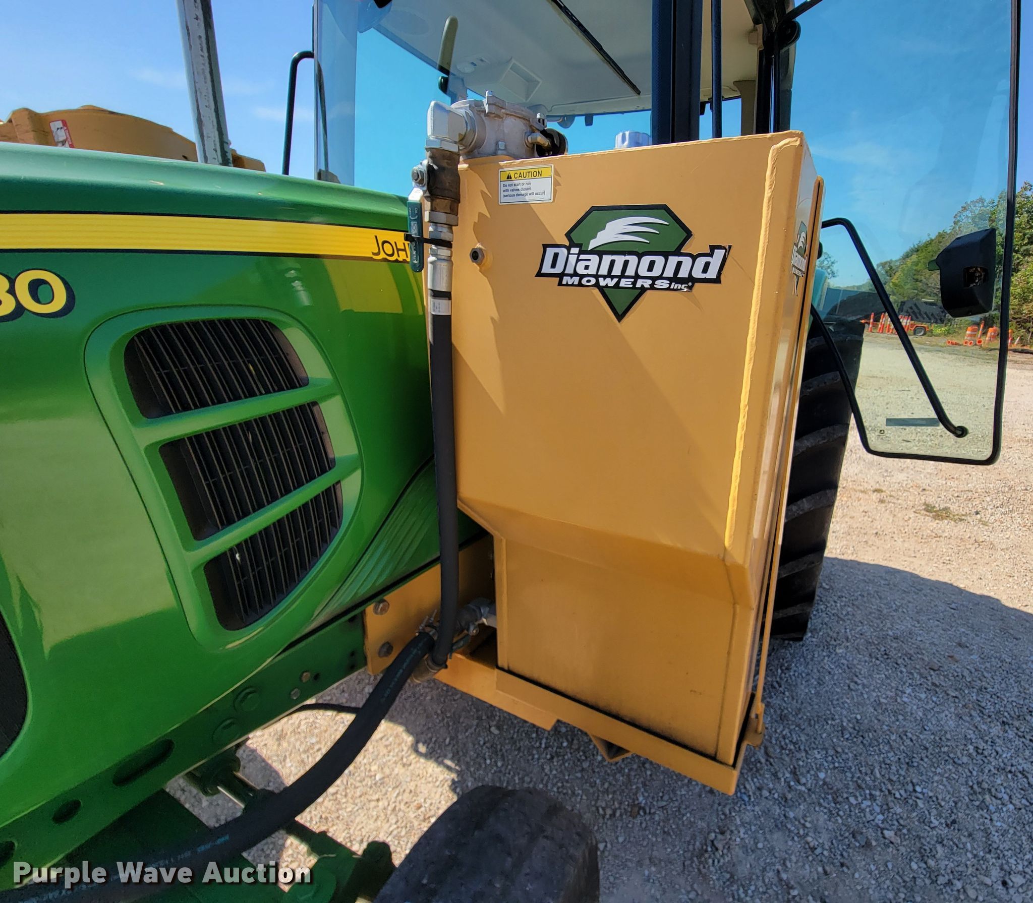 2010 John Deere 6330 tractor. Hours: 737 on meter, Serial: L06330H620939. Engine John Deere 4045, Cylinders: 6, Fuel type: Diesel. Transmission Powershift, 16F - 16R, Left-hand reverser. Operators station AC, Heat. Operational PTO: 540, Three point, Diamond side boom mower Width: 5', Serial: 11637. Tires Front: 10.00-16, Rear: 460/85R34, Wheel weights: 2, Wheelbase: 102". City of Osage Beach, MO. 5757 Chapel Ln. Osage Beach, MO 65065