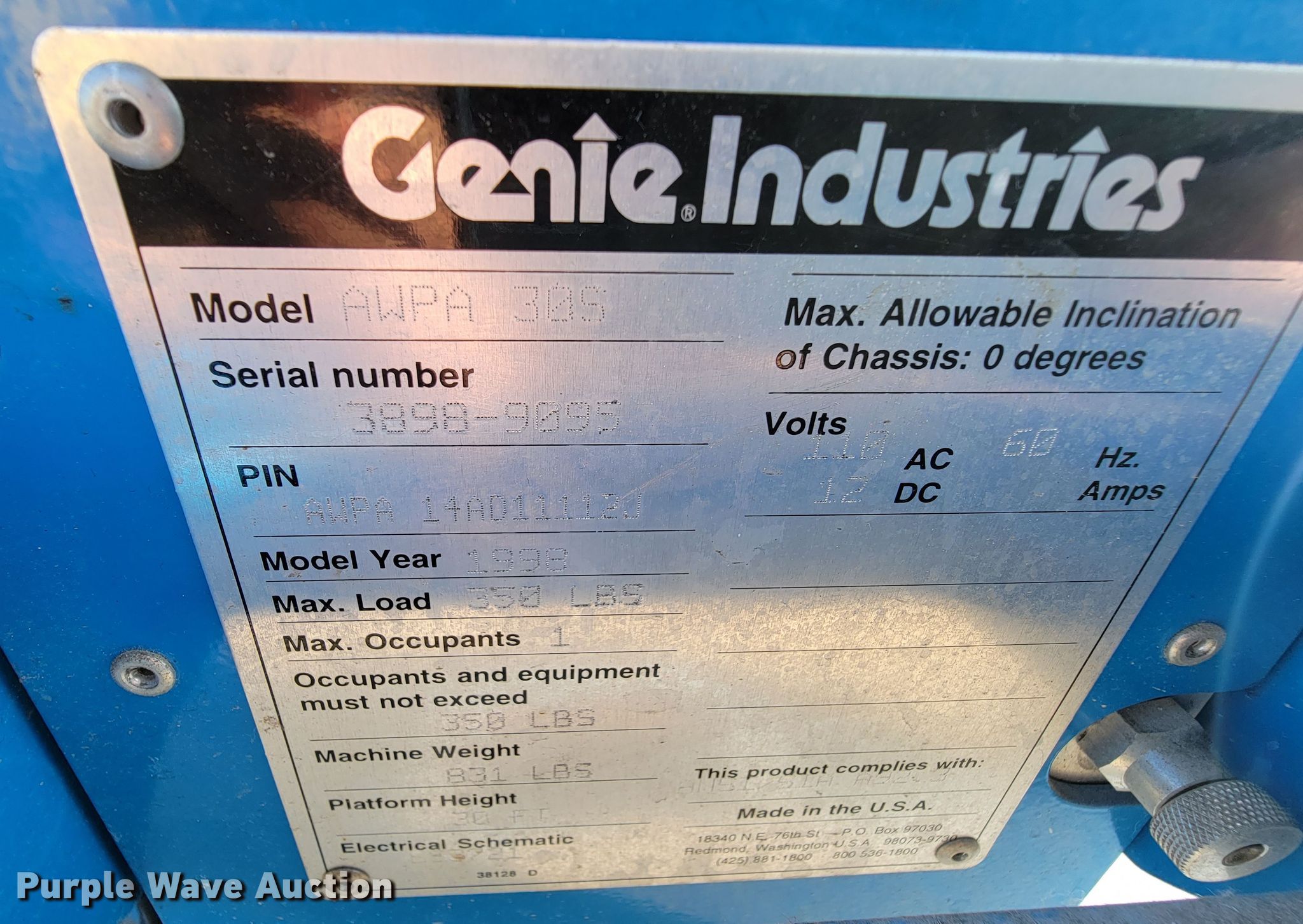 Purple Wave is selling a used Scissor or Vertical Lift in Missouri. This item is a Genie AWP-30S vertical lift with the following: Serial: 3898-9095