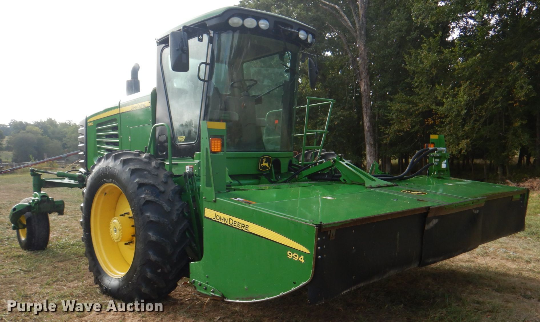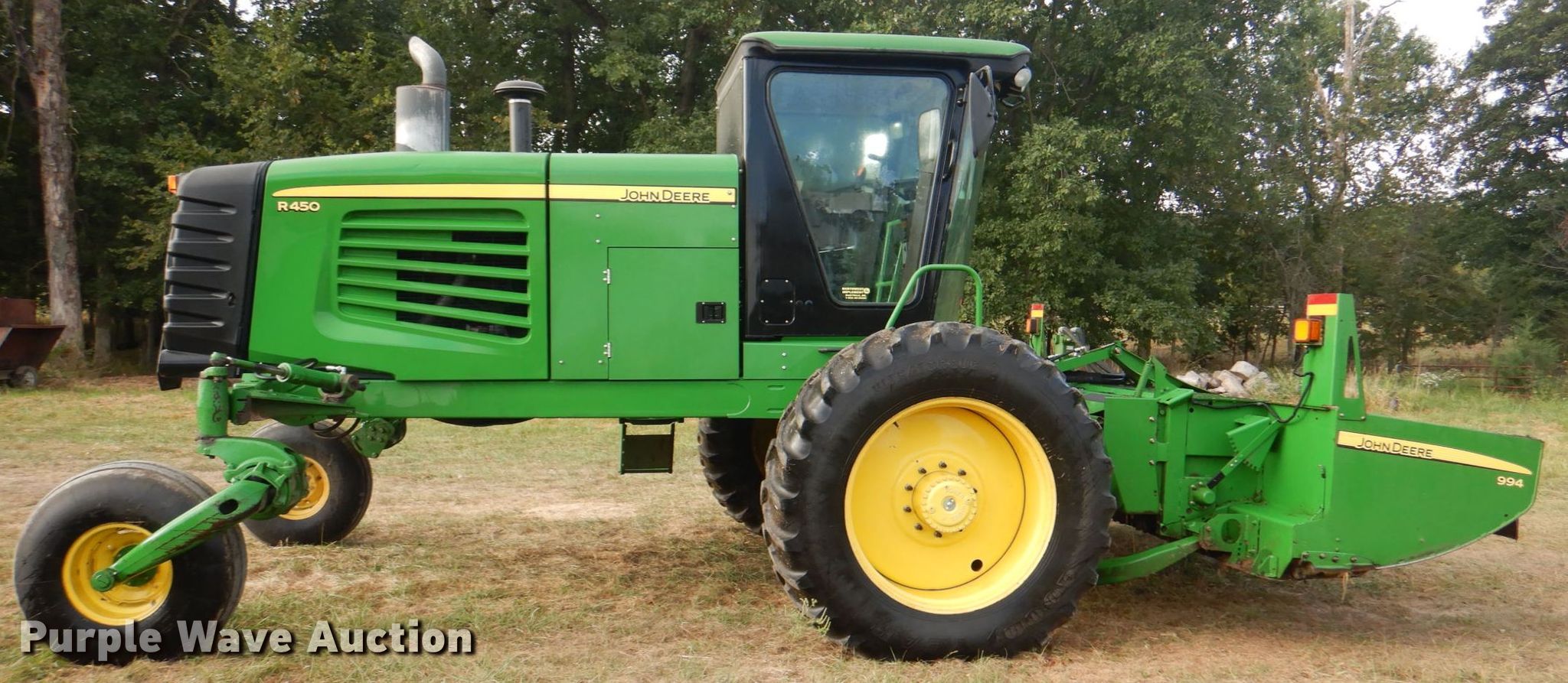 2013 John Deere R450 windrower. Engine hours: 560 on meter, Header hours: 398 on meter, Serial: 1E0R450XEAA360675. Engine John Deere, Cylinders: 6, Fuel type: Diesel. Transmission Hydrostatic. Operators station AC, Heat. Operational Disc head John Deere 994, Serial: 1E00994TVAA360003, Width: 14', Hydraulic head tilt, Conditioners: Flail. Tires Front: 480/80R38, Rear: 14L-16.1SL. Faith Hay and Cattle. 11150 Hecht Rd. Hallsville, MO 65255