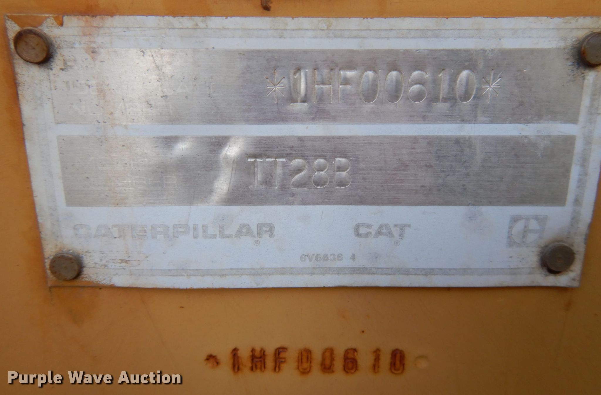 1987 Caterpillar IT28B wheel loader. Hours: 30,854 on meter, Serial: 1HF00610. Engine Cylinders: 4, Fuel type: Diesel. Transmission Powershift, 4F - 4R. Operators station Enclosed cab, AC, Heat, Bucket controls: Two-lever. Operational Auxiliary hydraulics: Front, Quick coupler: Hydraulic, Counter weights, Bucket Width: 99", Cutting edge: Bolt-on. Tires Size: 17.5R25. 14203 230th St. Hutchinson, MN 55350