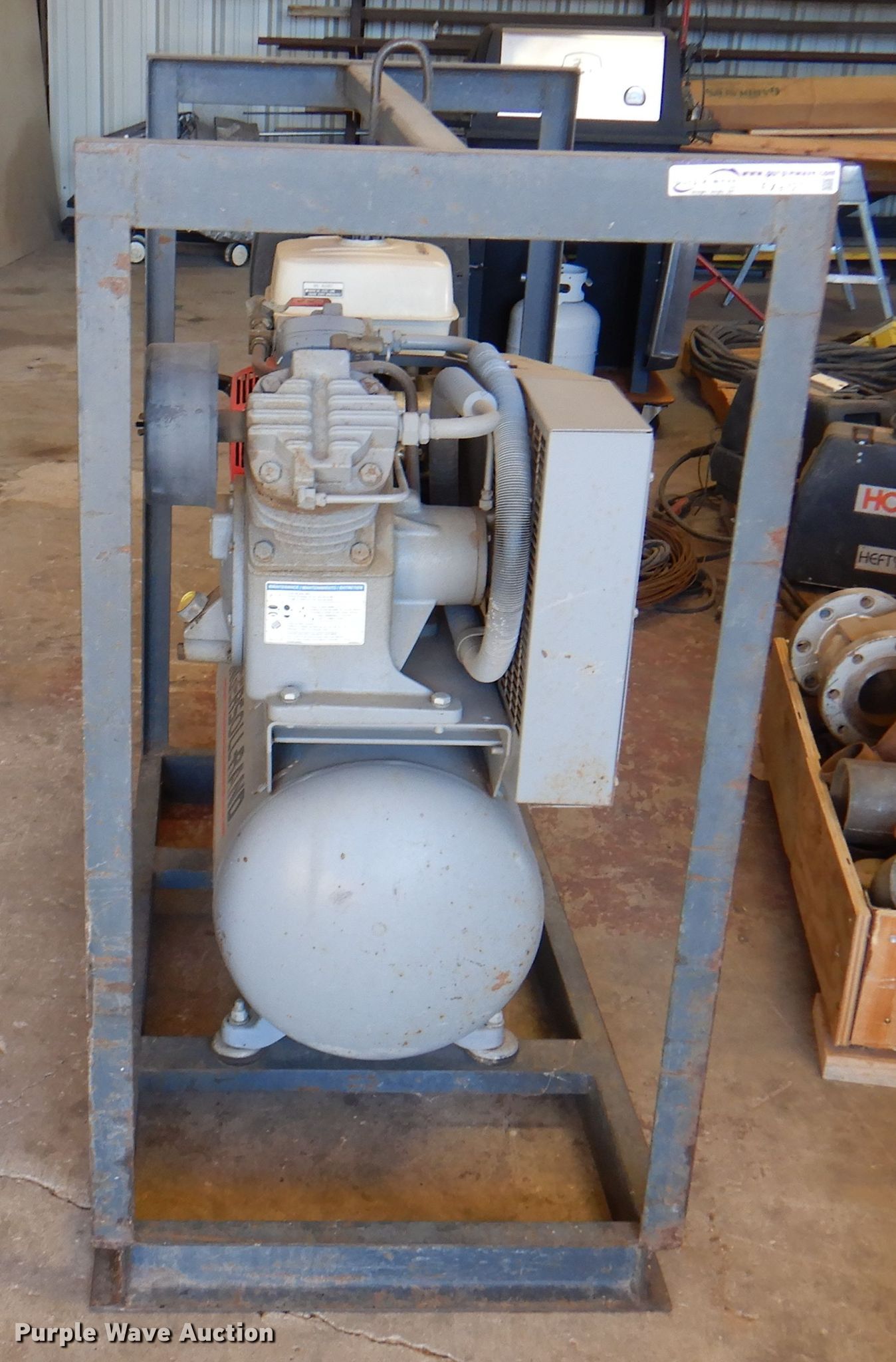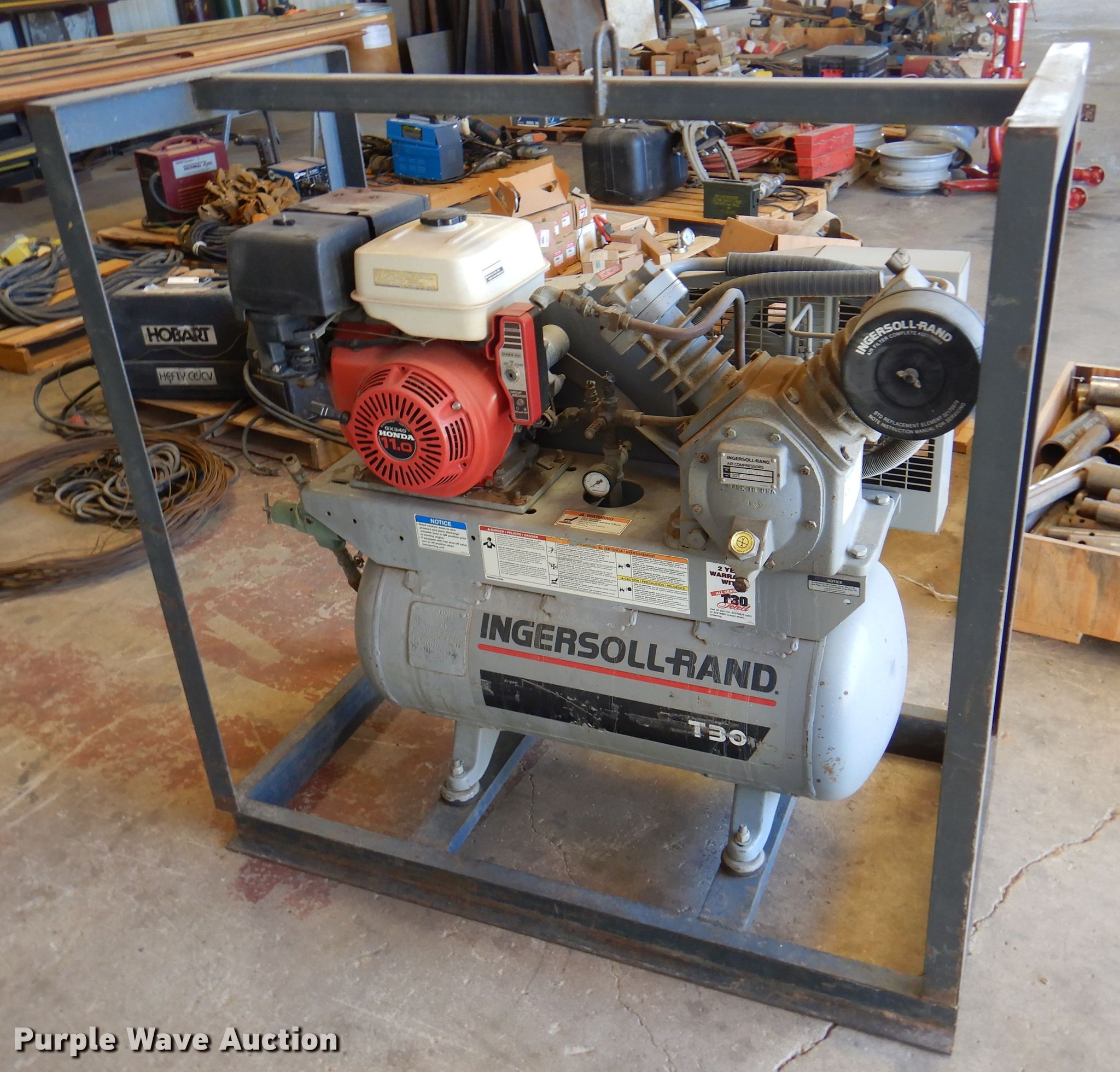 Ingersoll Rand T30 air compressor. Serial: 3OTC915602. Engine Honda GX340, Fuel type: Gas, HP: 11. Operational Air compressor Ingersoll-Rand 2475F11G, PSI: 200, Skid mounted. Higby Millwright & Crane Service. Helen St & Hwy 83. Turpin, OK 73950