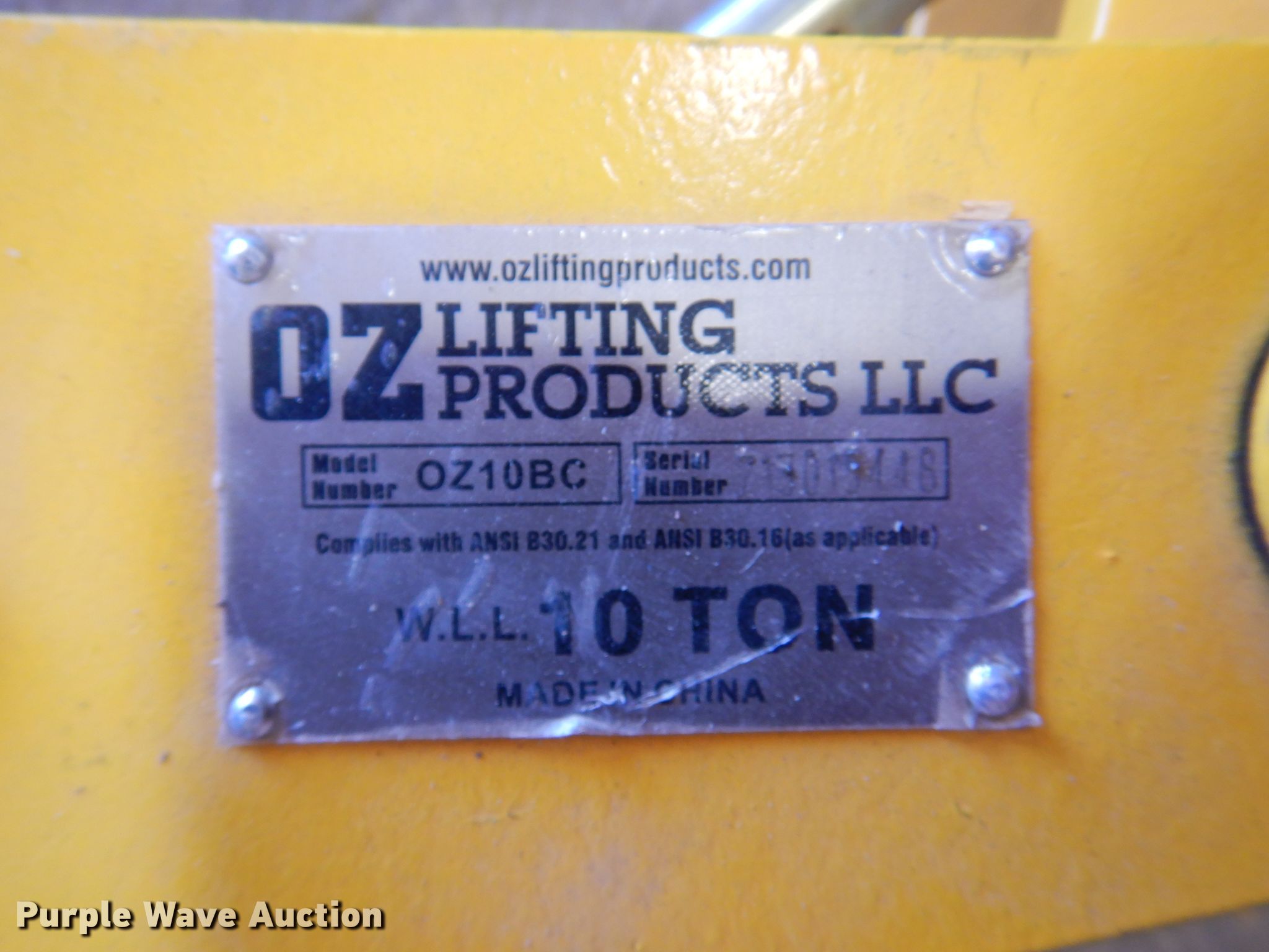 Lifting equipment. OZ lifting OZ10BC I-beam grapple Capacity: 10 tons, (4) 20' slings Capacity: 40,000 lbs, (6) 15' slings Capacity: 25,000 lbs, (5) 15' slings Capacity: 25,000 lbs, (7) 10' slings Capacity: 13,200 lbs. Higby Millwright & Crane Service. Helen St & Hwy 83. Turpin, OK 73950