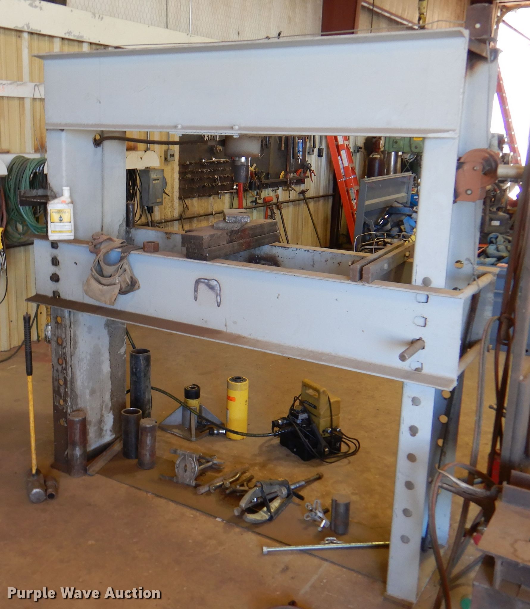 Hydraulic press. 765" W x 75" H, Enerpac hydraulic pump 115V, Phase: Single, Dies, Pullers. Higby Millwright & Crane Service. Helen St & Hwy 83. Turpin, OK 73950