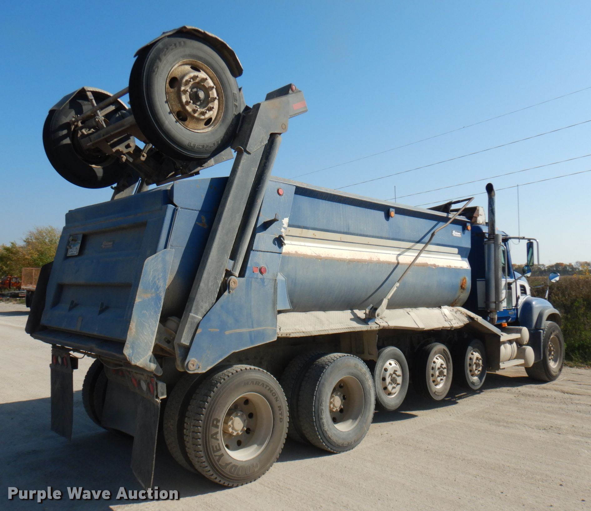 2003 Mack CV513 dump truck. Miles: 741,309 on odometer, VIN: 1M2AG02C03M001522, Unit #: 147. Engine Mack, Cylinders: 6, Fuel type: Diesel, Engine brake. Transmission Maxitorque, Manual, Speed: 13. Chassis Axles: 6, Pusher axle Steerable, Tag axle, Differential lock: Inter-axle, Suspension: Walking beam, Brakes: Air, PTO, Wheelbase: 260". Interior AC, Heat, Power windows, Cruise control. Operational Dump bed 18' L x 92" W, Side height: 48", Bed type: Steel, Barrel, Roll tarp, Ram: Single , End gate: Air operated. Tires Front: 425/65R22.5, Rear: 11R22.5, Lift axle: 245/70R17.5. Notes Windshield chipped or cracked. Minnesota title. Duininck Concrete. 4967 State Hwy 29 N. Alexandria, MN 56308