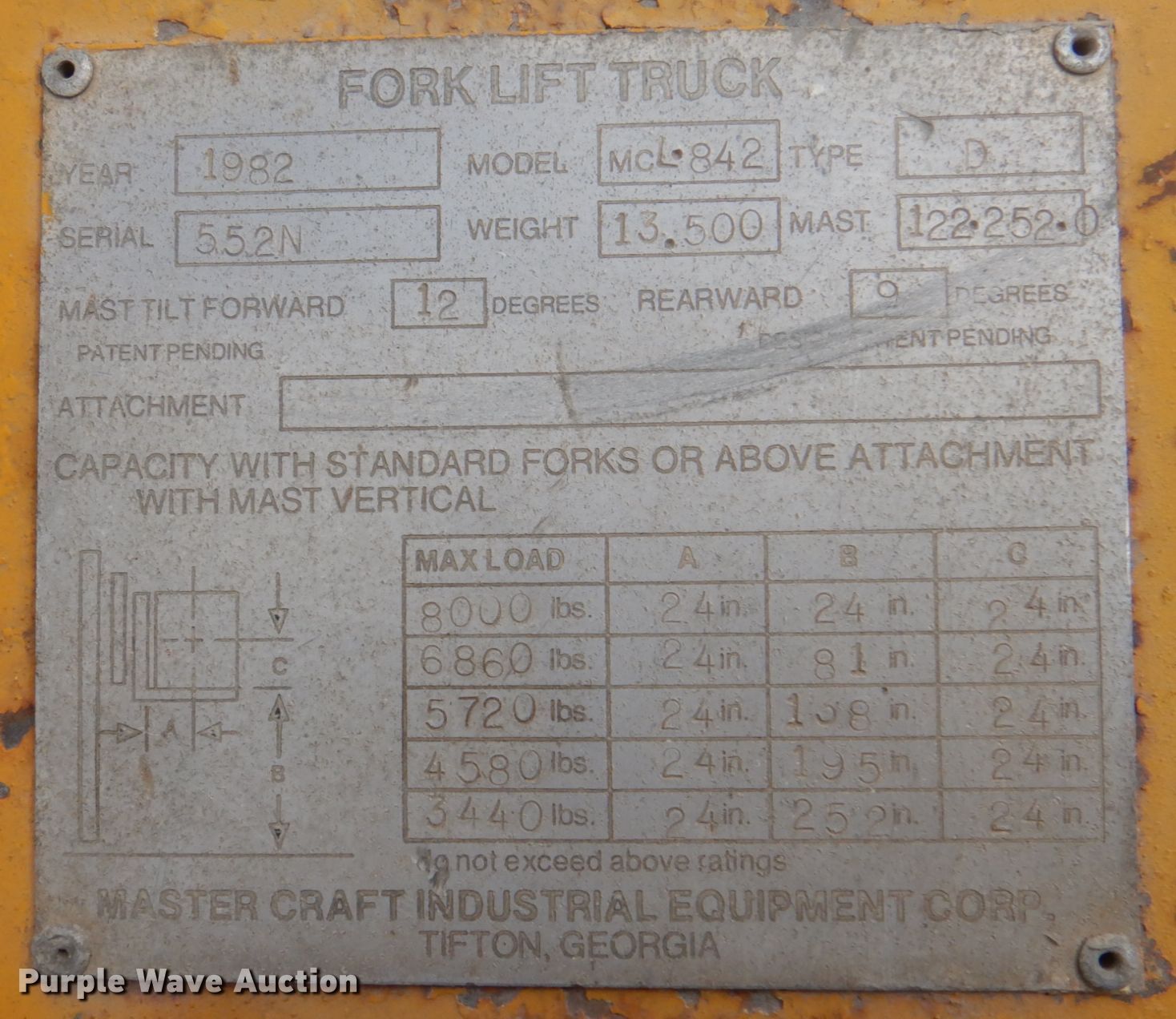 1982 Mastercraft MCL842 forklift has sold in Cameron, Missouri for $4510. Item KX9211 sold on November 4th, 2021.