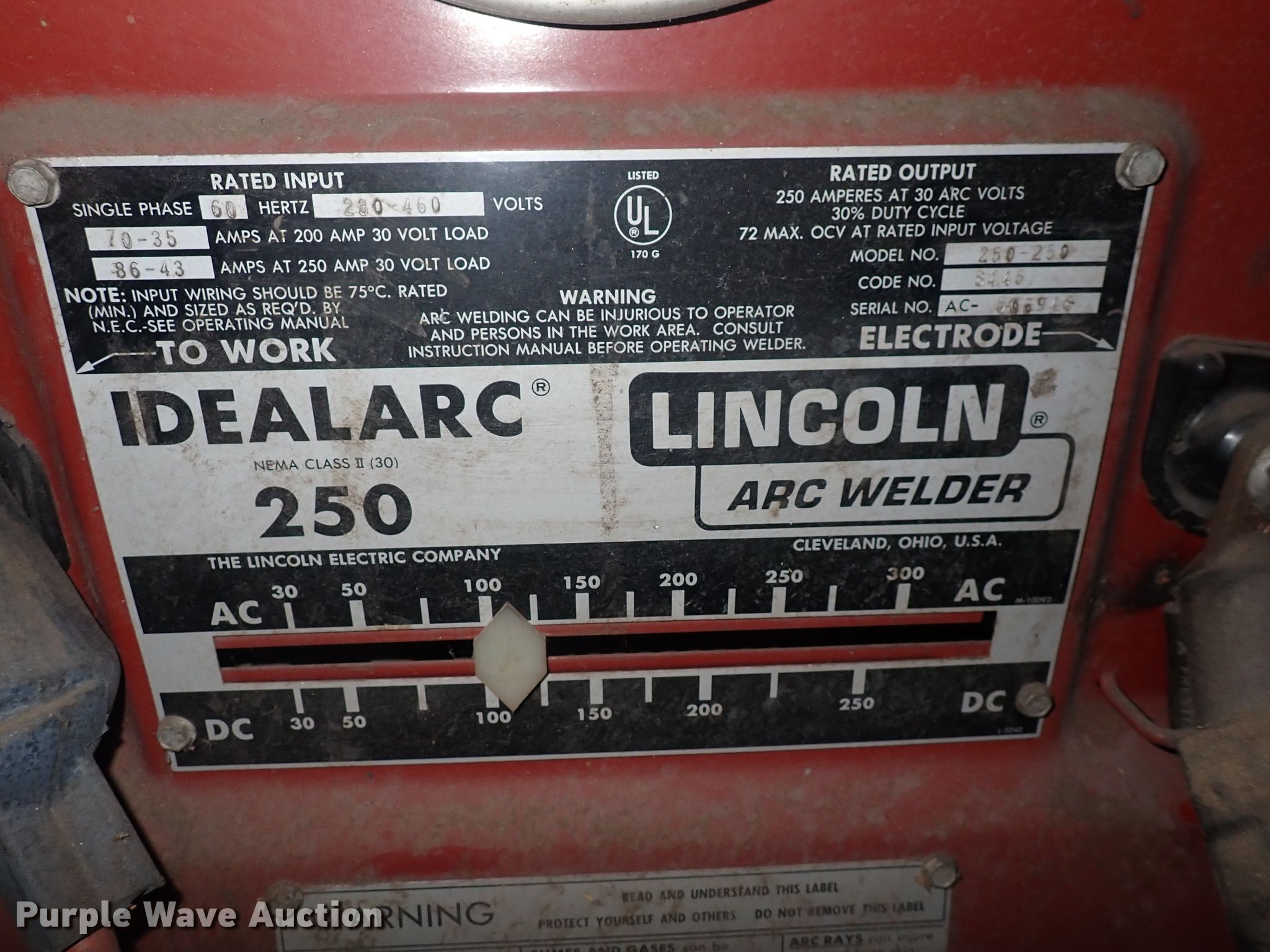 Purple Wave is selling a used Welder (Manual) in Kansas. This item is a Lincoln Idealarc 250 arc welder with the following: Phase: Single