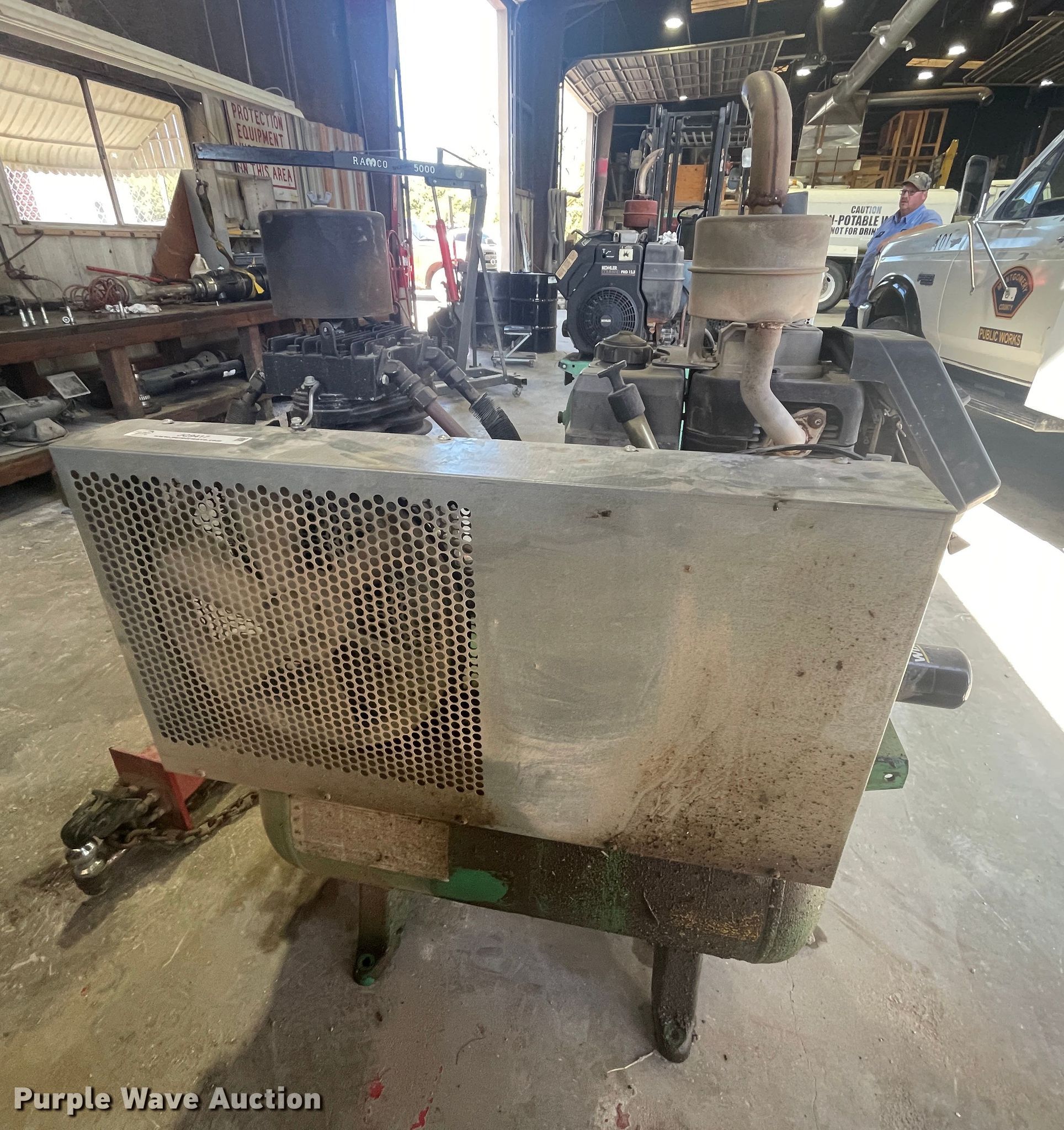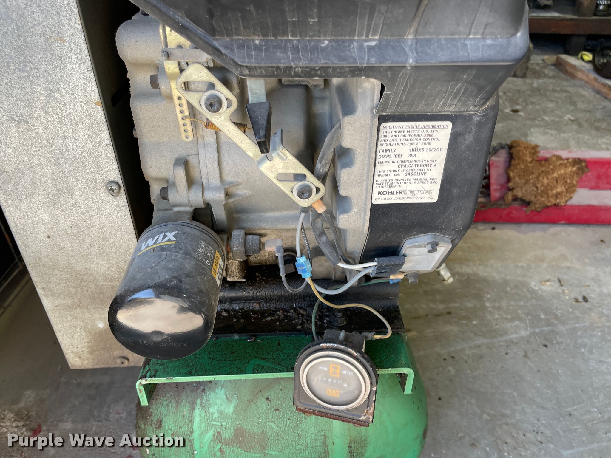Speedaire 5F564A air compressor. Hours: 990 on meter, Serial: L8/1/2001-00091. Engine Kohler Command Pro, Cylinders: 1, Fuel type: Gas, HP: 12.5. Operational Air compressor PSI: 175, Tank capacity: 30 gallons, Skid mounted. Notes Unknown operating condition. Montgomery County Public Works. 300 E Main St. Independence, KS 67301